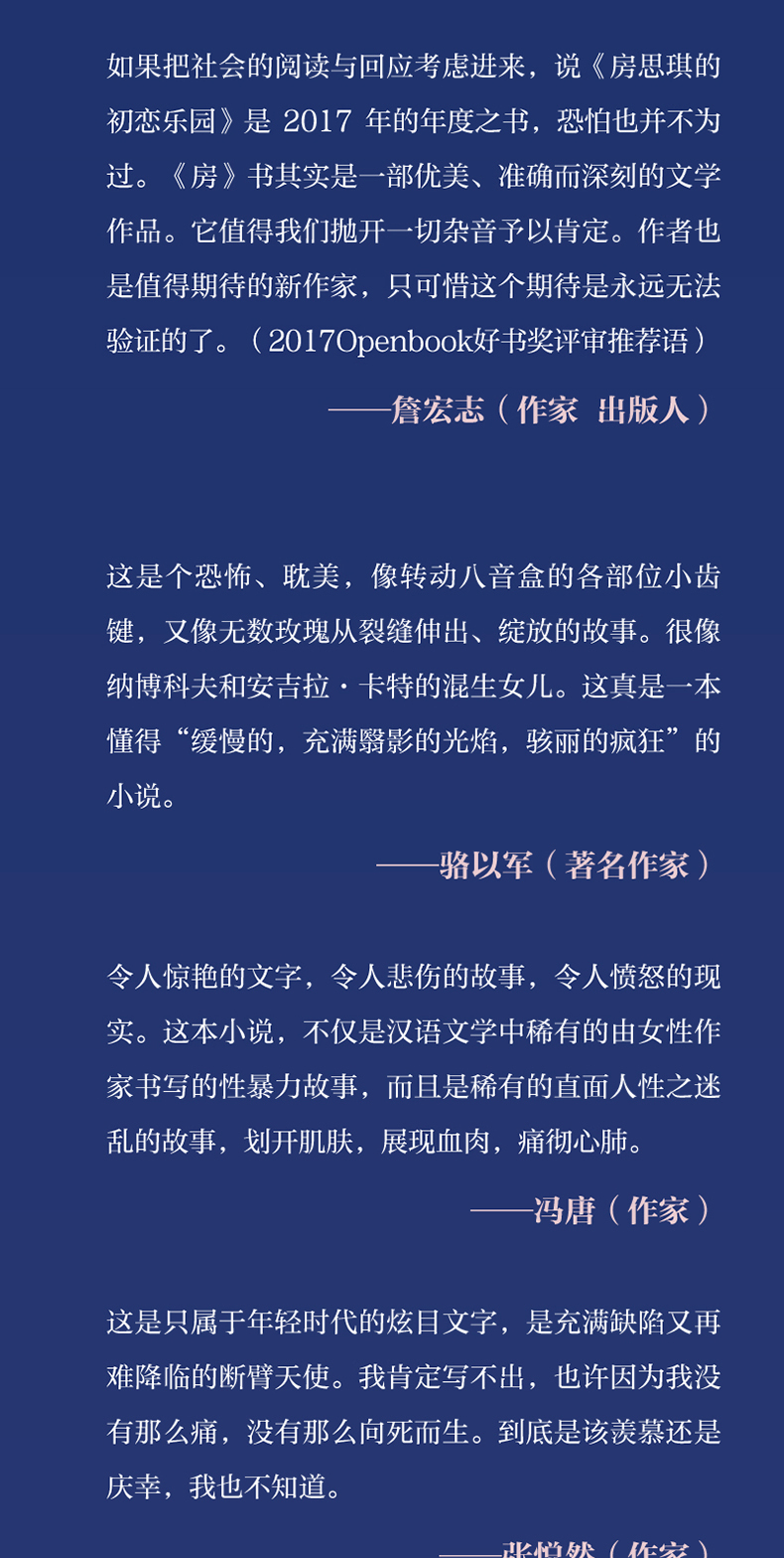 如果把社会的阅读与回应考虑进来,说《房思琪的初恋乐园》是 2017 年的年度之书,恐怕也并不为过。《房》书其实是一部优美、准确而深刻的文学作品。它值得我们抛开一切杂音予以肯定。作者也是值得期待的新作家,只可惜这个期待是永远无法验证的了。(2017Openbook好书奖评审**语) ——詹宏志(作家 出版人)