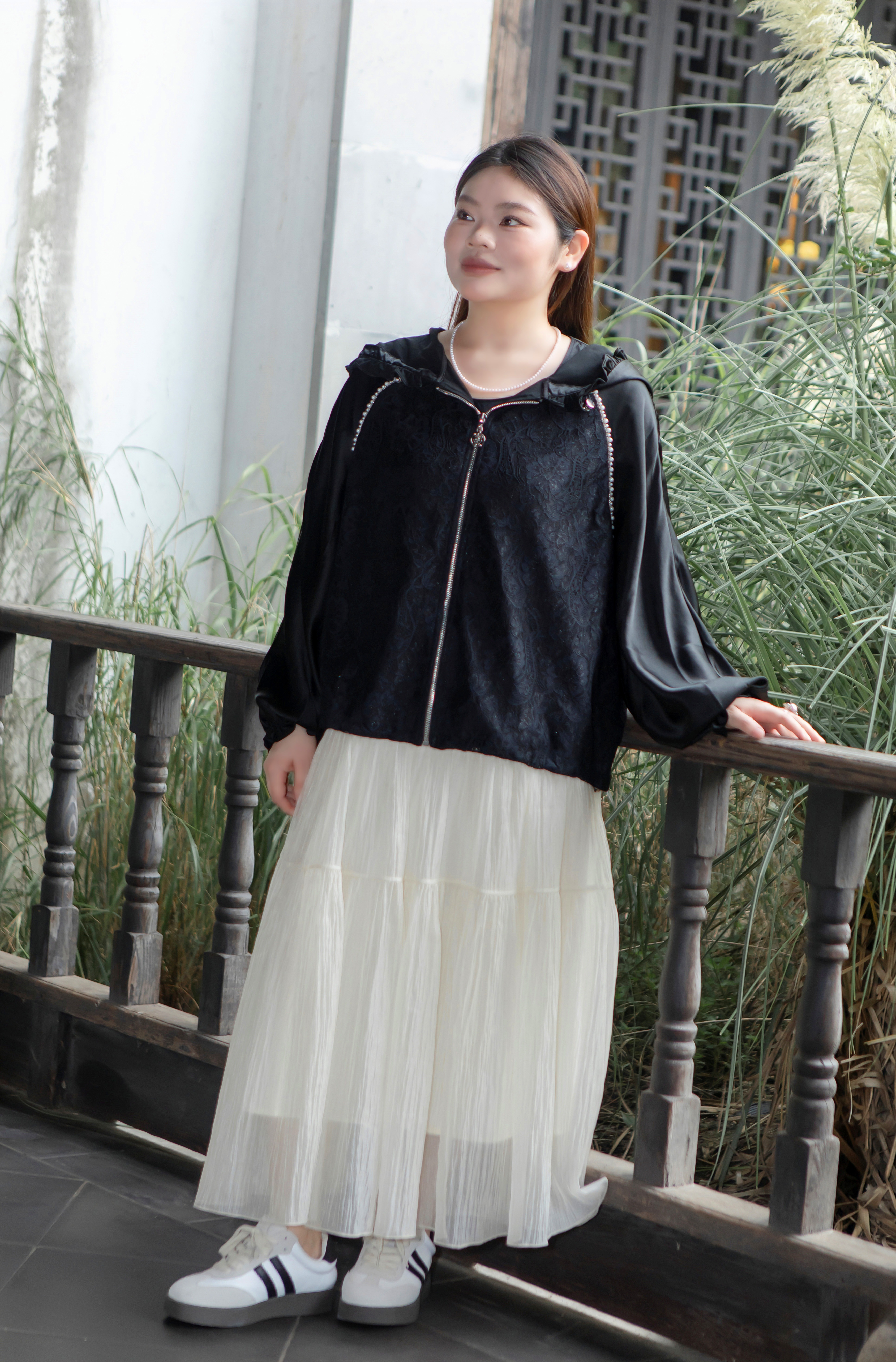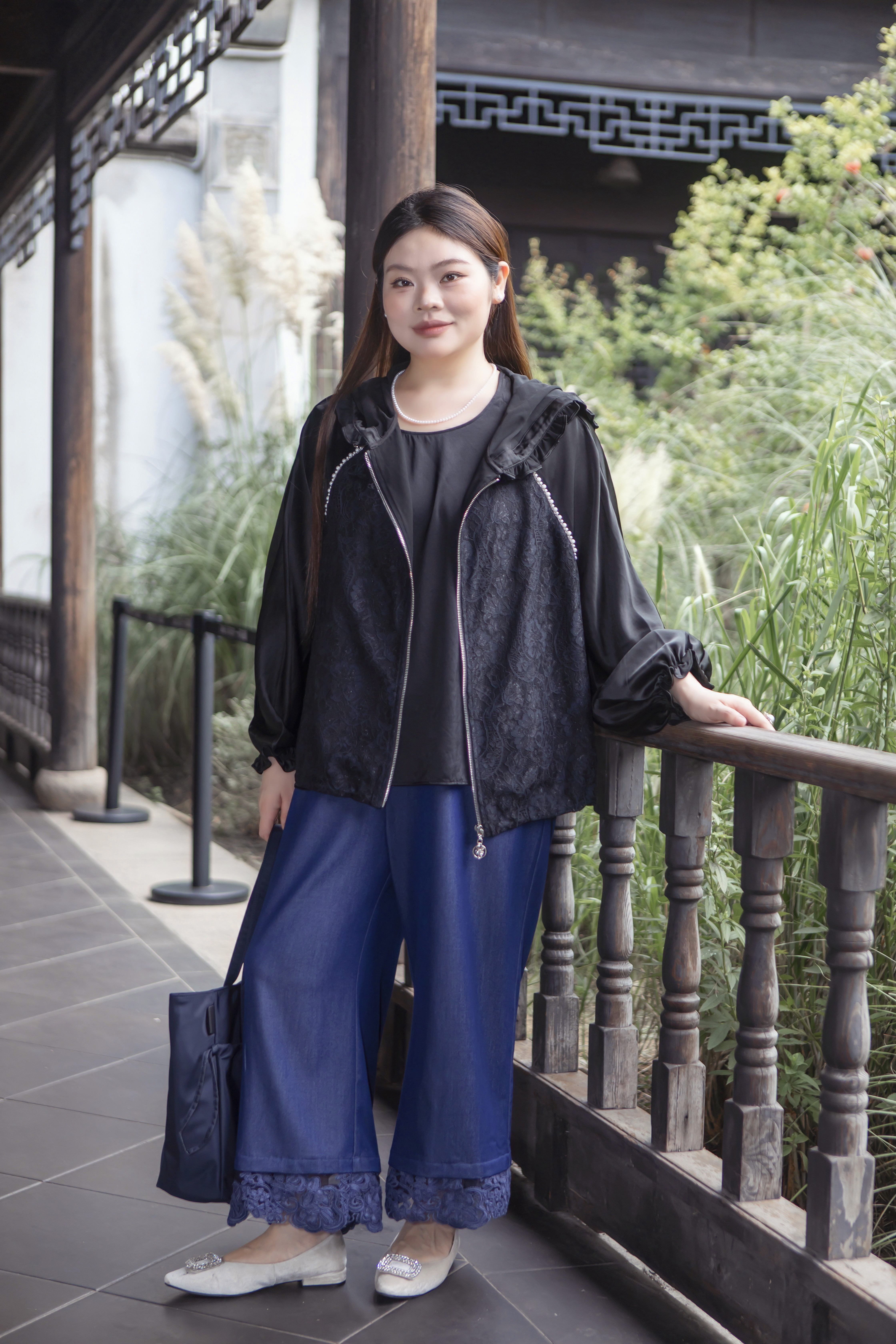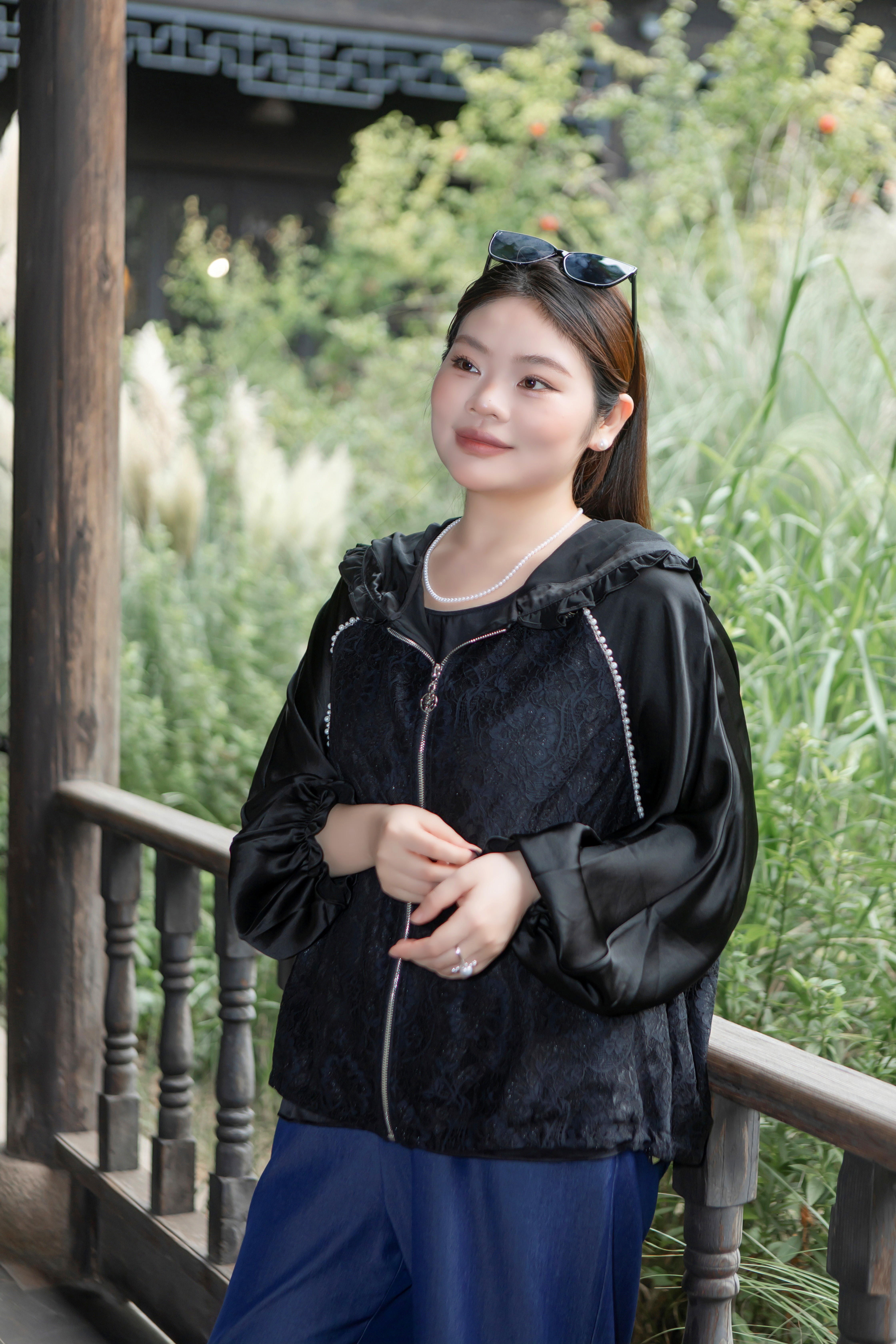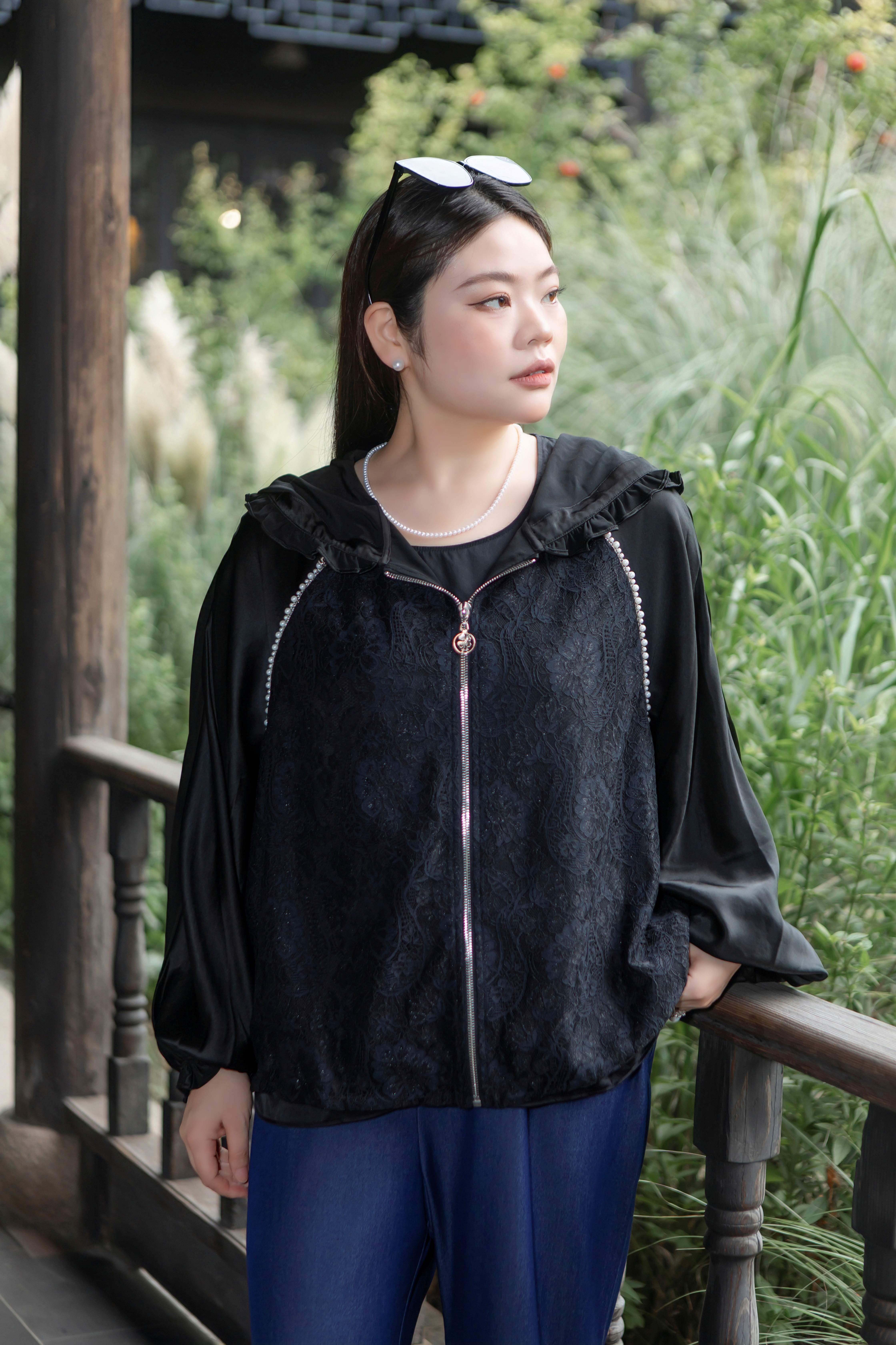 15天内发货【重工 蕾丝珍珠拼接外套】衣身2层拼接,蕾丝部分不透,缎面醋酸拼接蕾丝,重磅出品,一位工人一整天只能出一件,松紧花苞袖口,下摆松紧抽绳,拼缝、熨烫都做的极为讲究