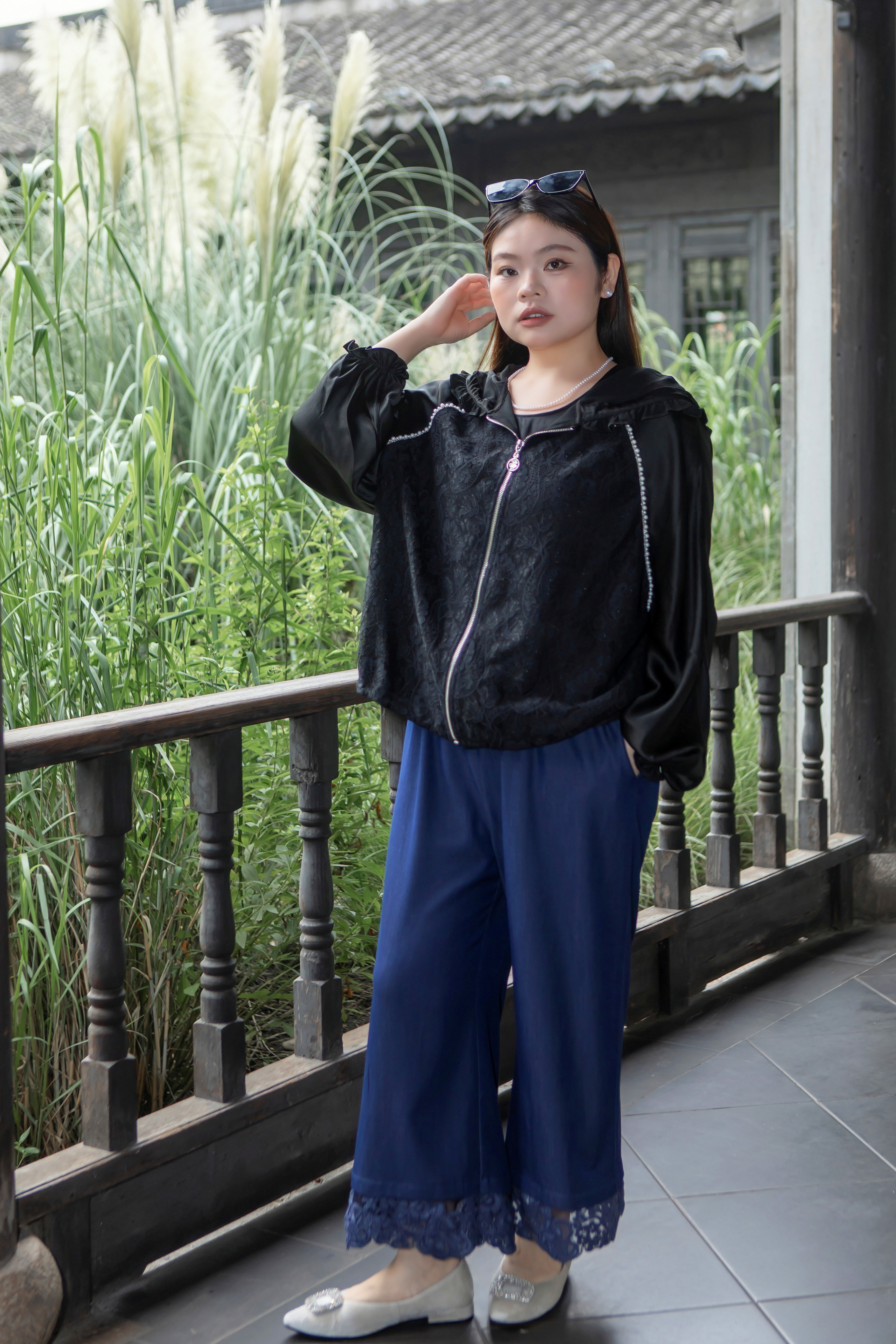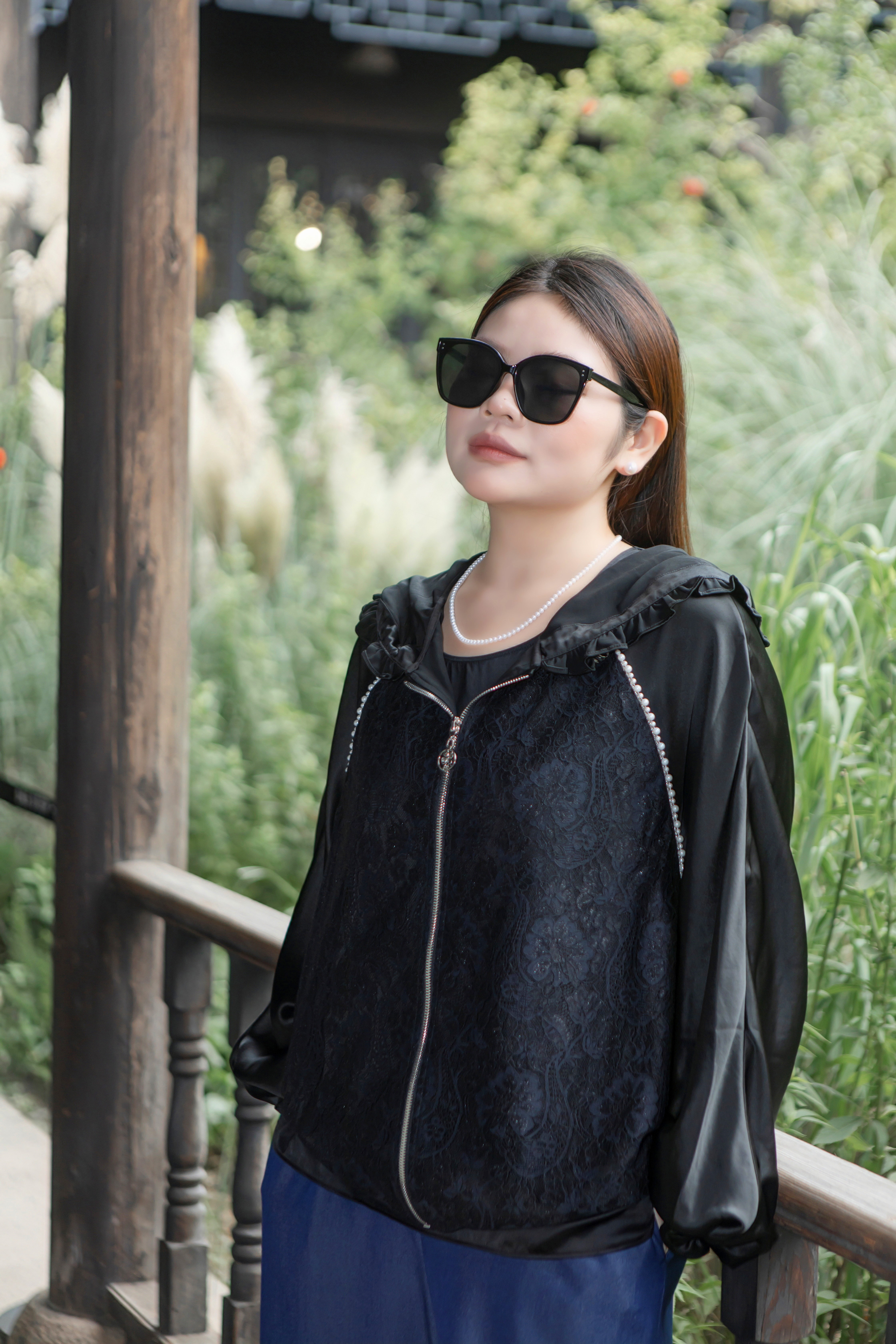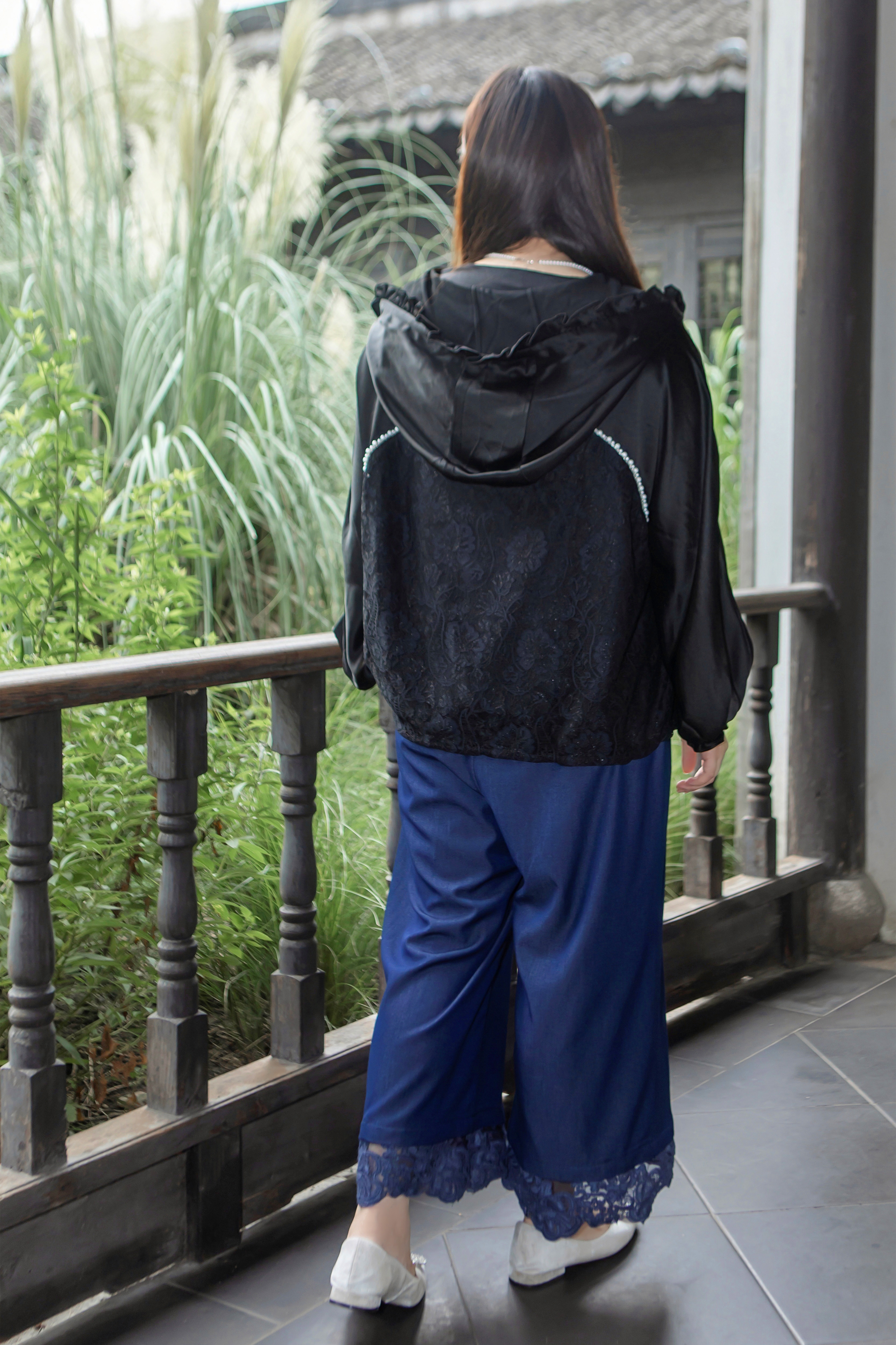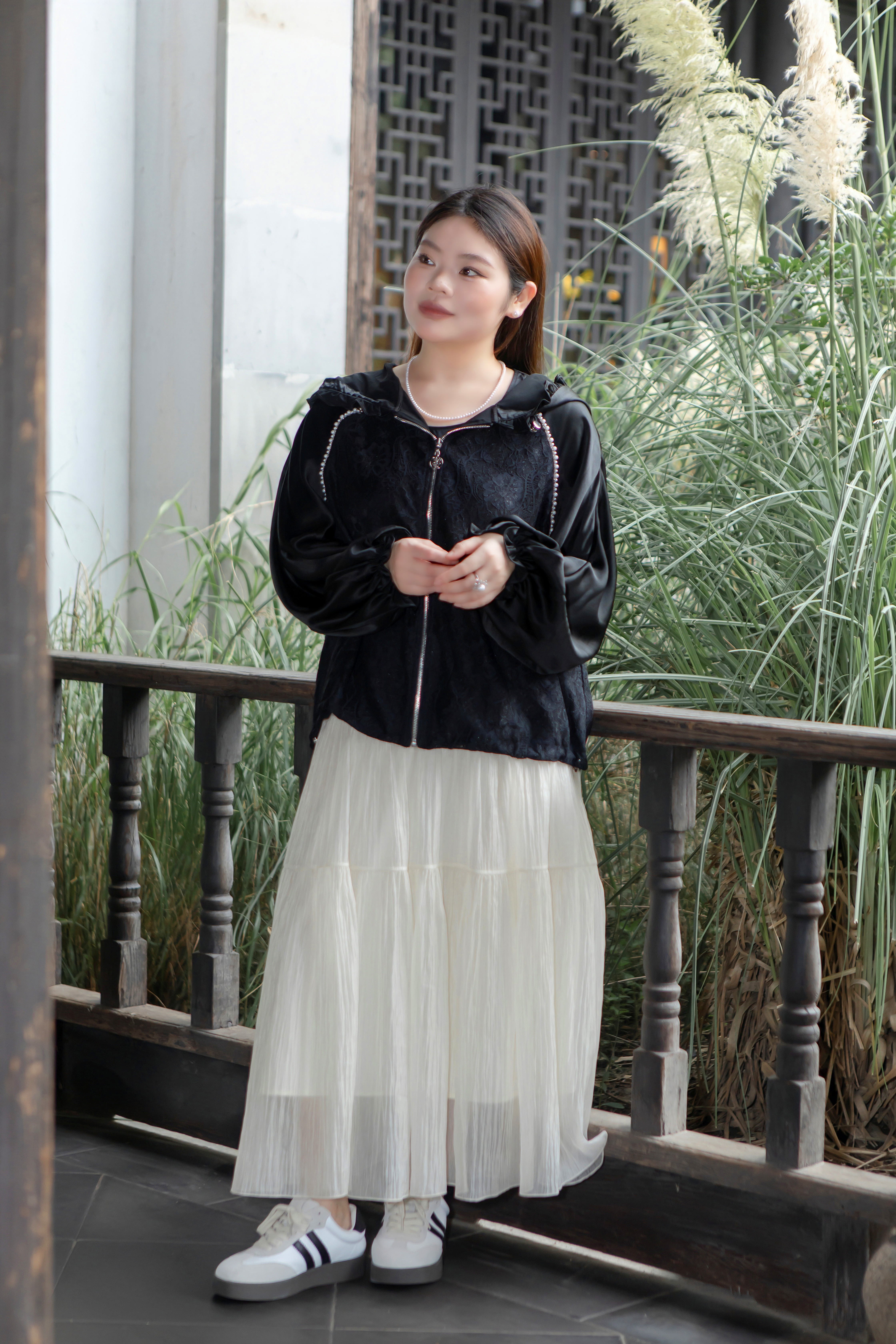 15天内发货【重工 蕾丝珍珠拼接外套】衣身2层拼接,蕾丝部分不透,缎面醋酸拼接蕾丝,重磅出品,一位工人一整天只能出一件,松紧花苞袖口,下摆松紧抽绳,拼缝、熨烫都做的极为讲究