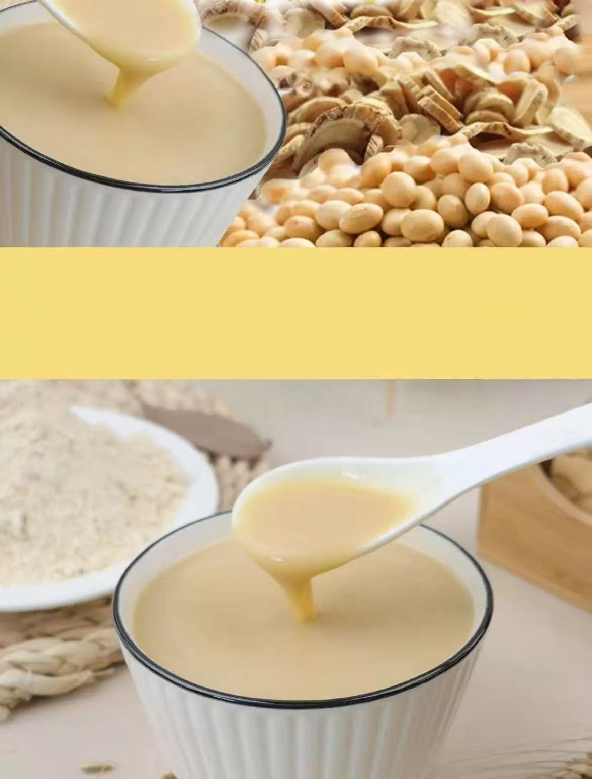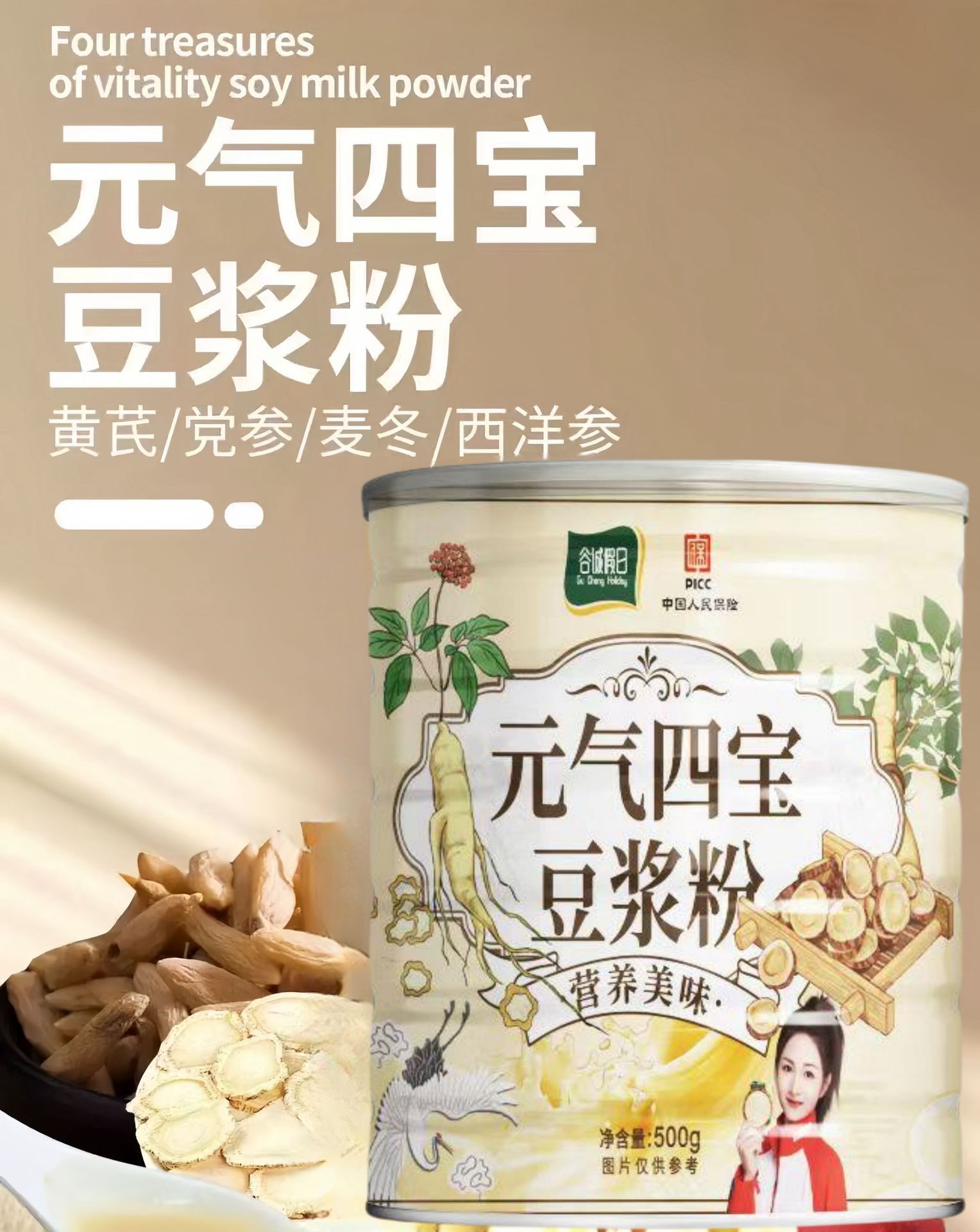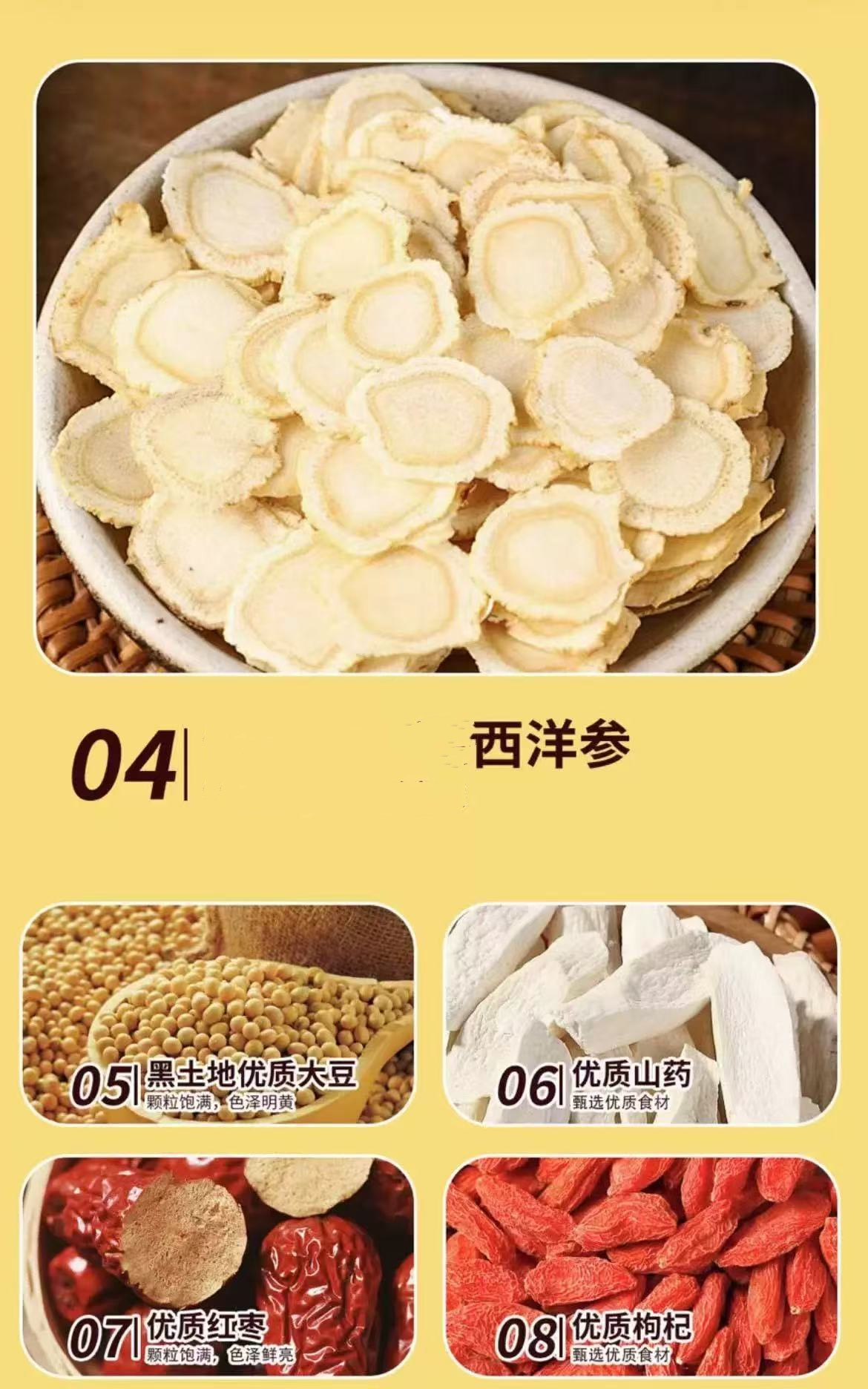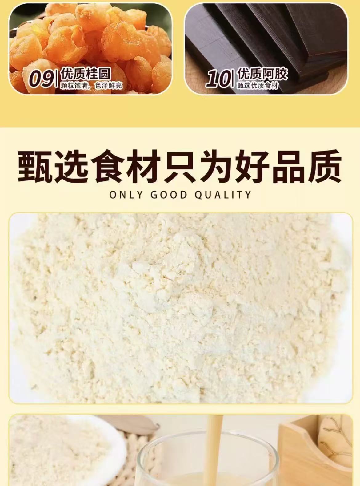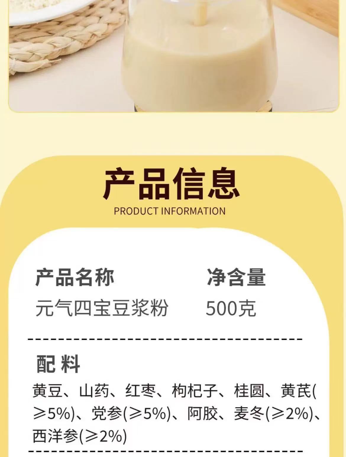 配 料:黄豆、山药、红枣、枸杞子、桂圆、黄芪(≥5%)、党参(≥5%)、阿胶、麦冬(≥2%).西洋参(≥2%)。