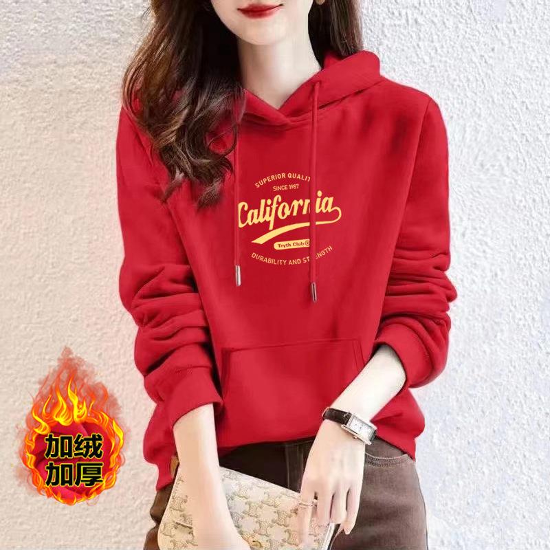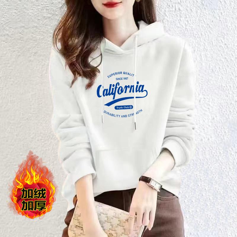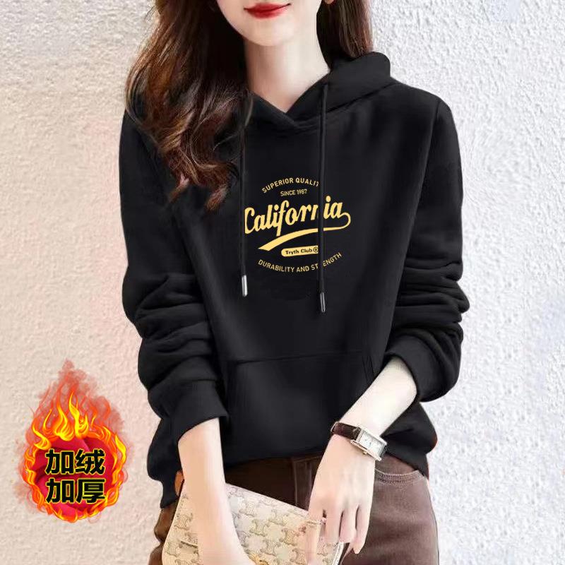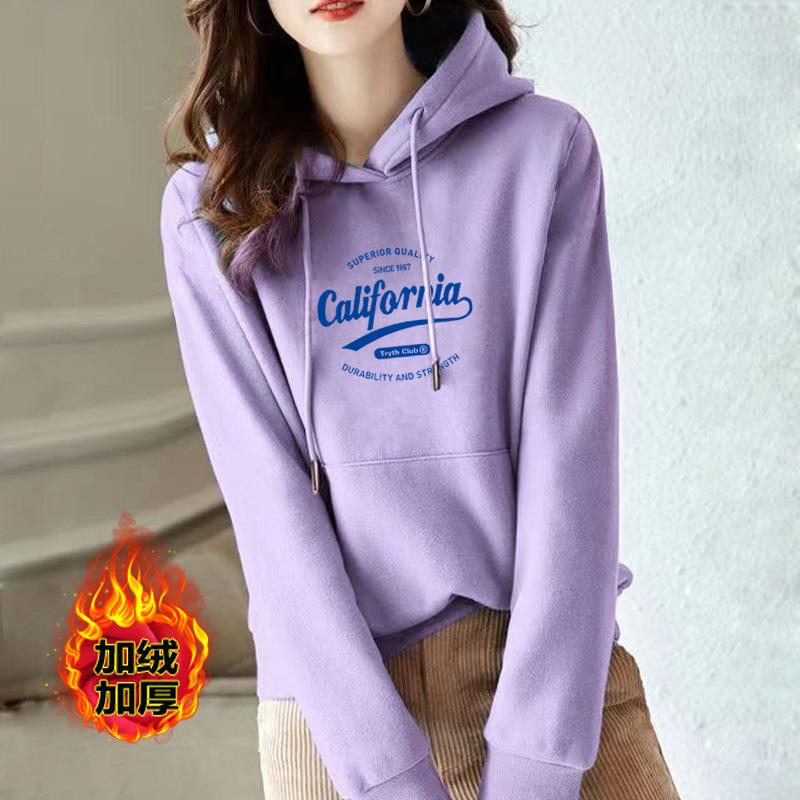 连帽加绒棉质卫衣运动宽松休闲时尚印花外套上衣女潮秋冬正肩多色