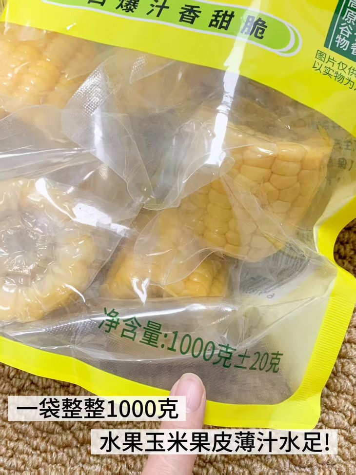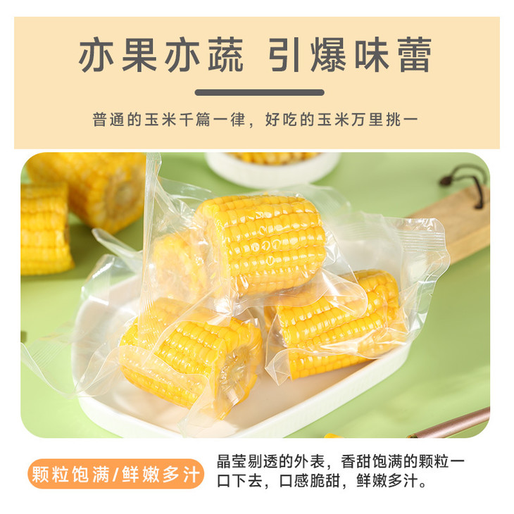 📦真空独立包装,储存携带都方便 除了口感和健康,这款水果玉米的包装也超贴心! 采用真空独立小包装,每一根玉米都是单独封装,干净卫生,还能防止串味。 出门携带也超方便,不管是放包里、行李箱里,都不用担心会压坏或漏汁。 而且独立包装能控制食量,想吃拆一根, 不会因为一次吃不完而浪费,简直太懂大家的需求了!