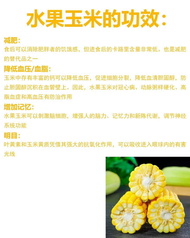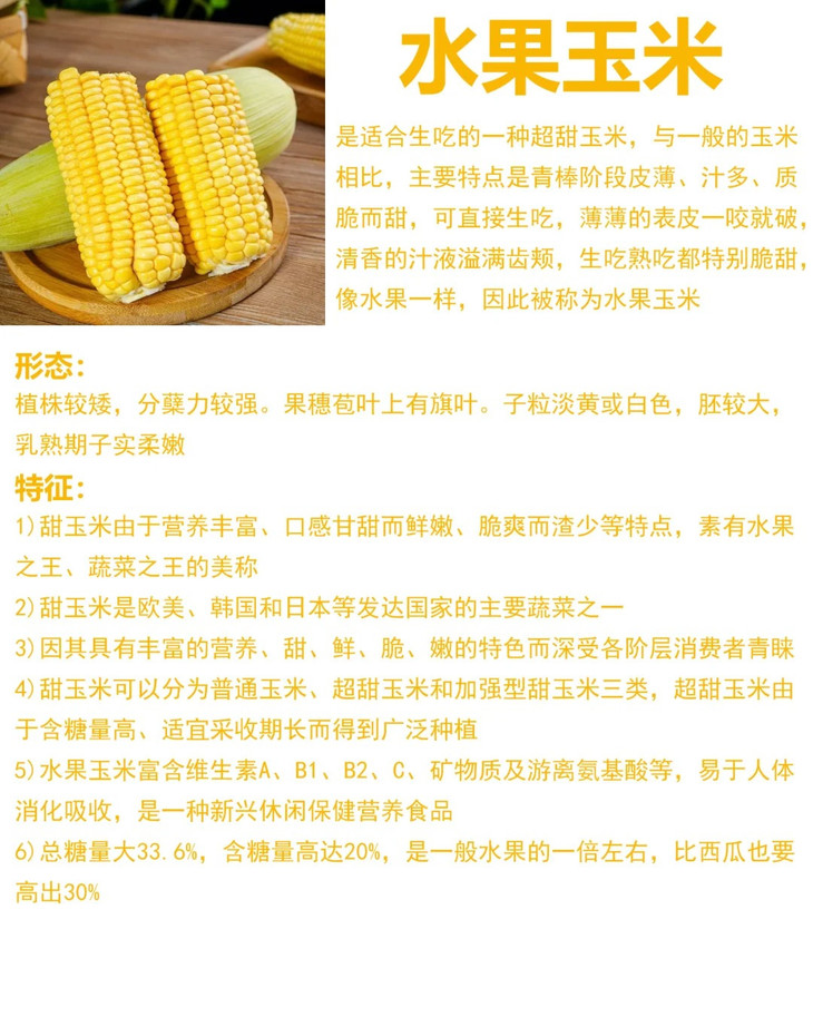 ✨✨✨✨✨✨✨✨✨✨✨✨ ▶️口感超级棒,鲜甜多汁,脆嫩可口 带有清香的甜味,如同水果一般🍑 因此也有着“蔬菜之王”的美称💕 含有的蔗糖是普通玉米的2~10倍✅ 其籽粒在乳熟期就会产生很多的糖分、淀粉和粗脂肪
