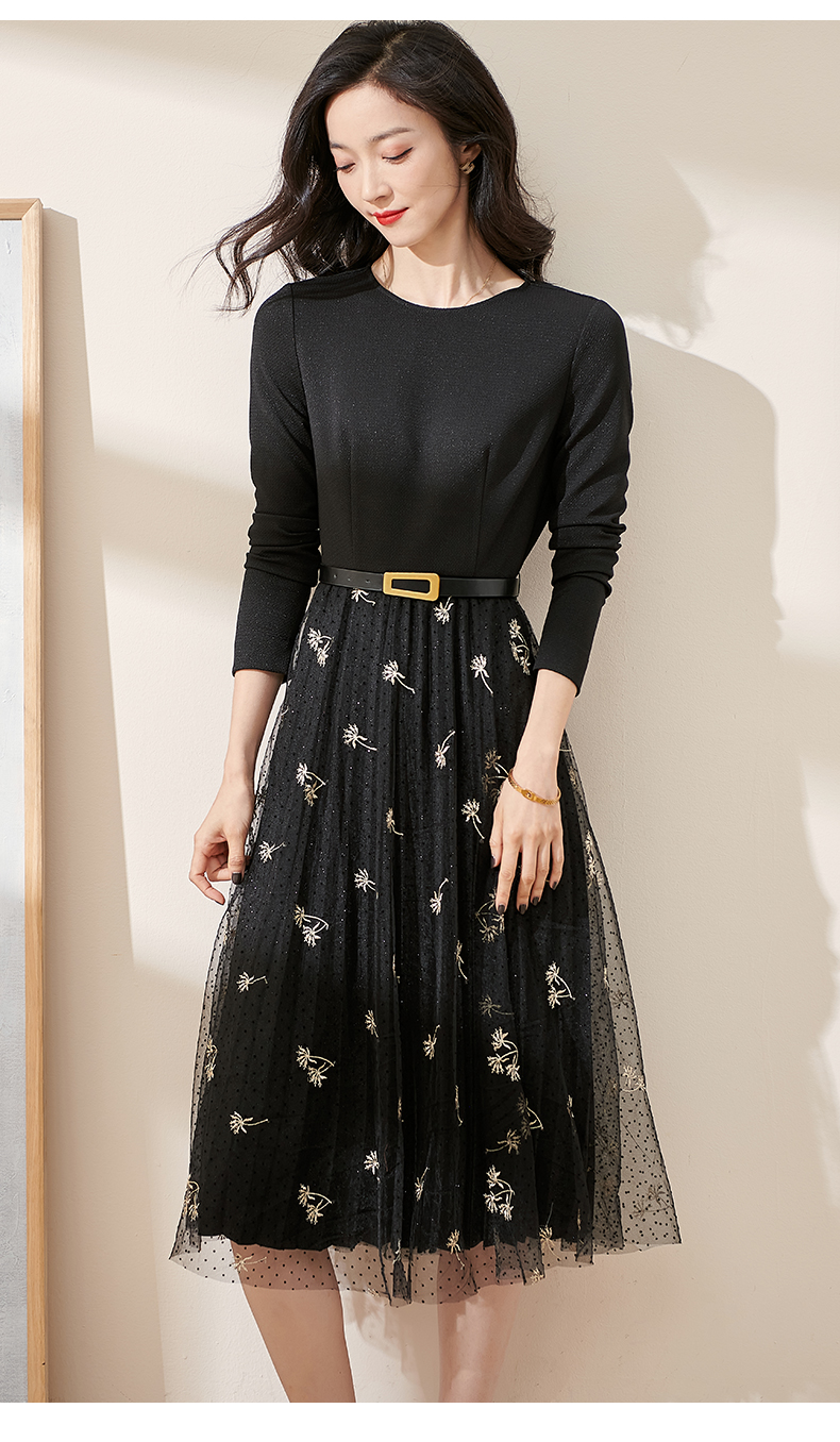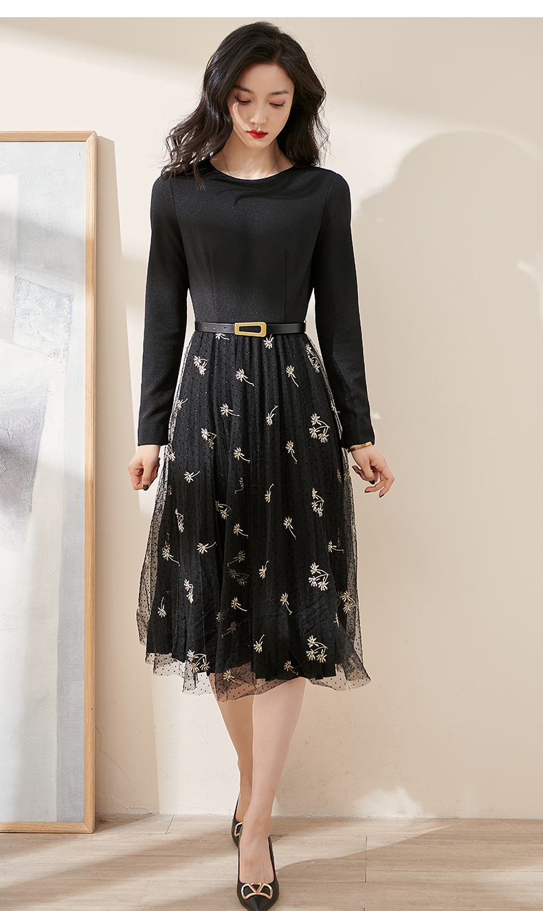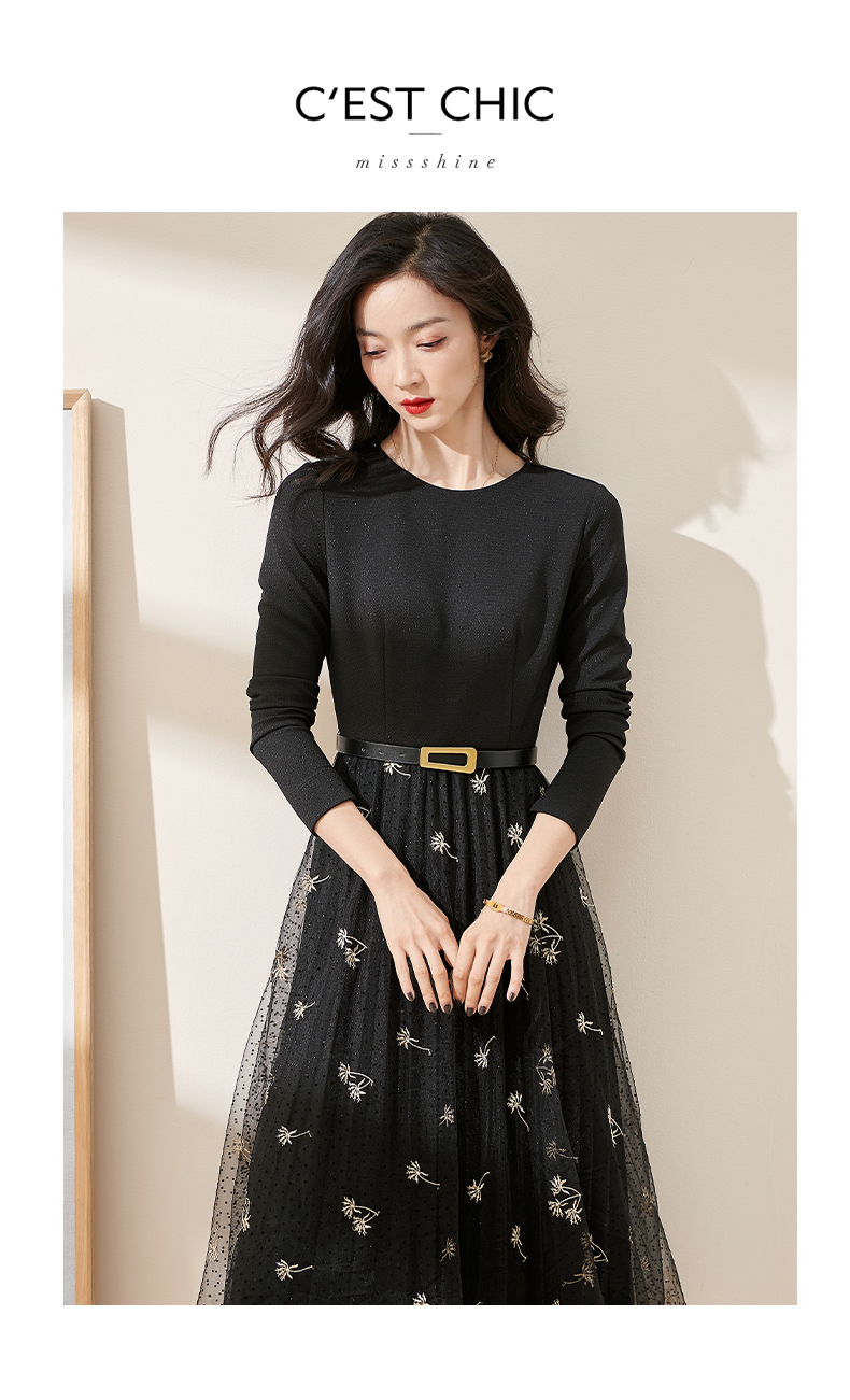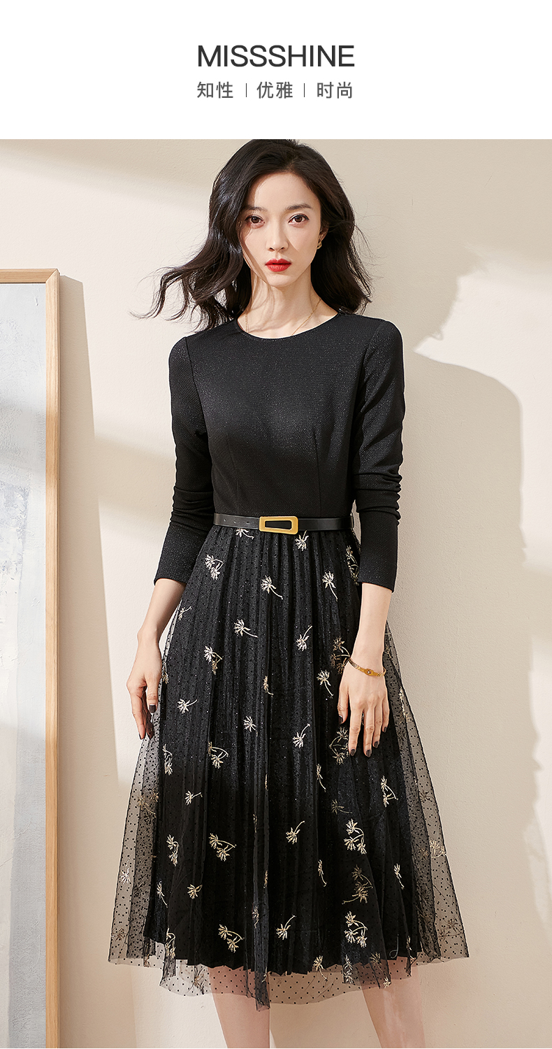 剩S/M/XL 米思阳2026春新款气质淑女拼接网纱连衣裙显瘦中长飘逸裙子0520