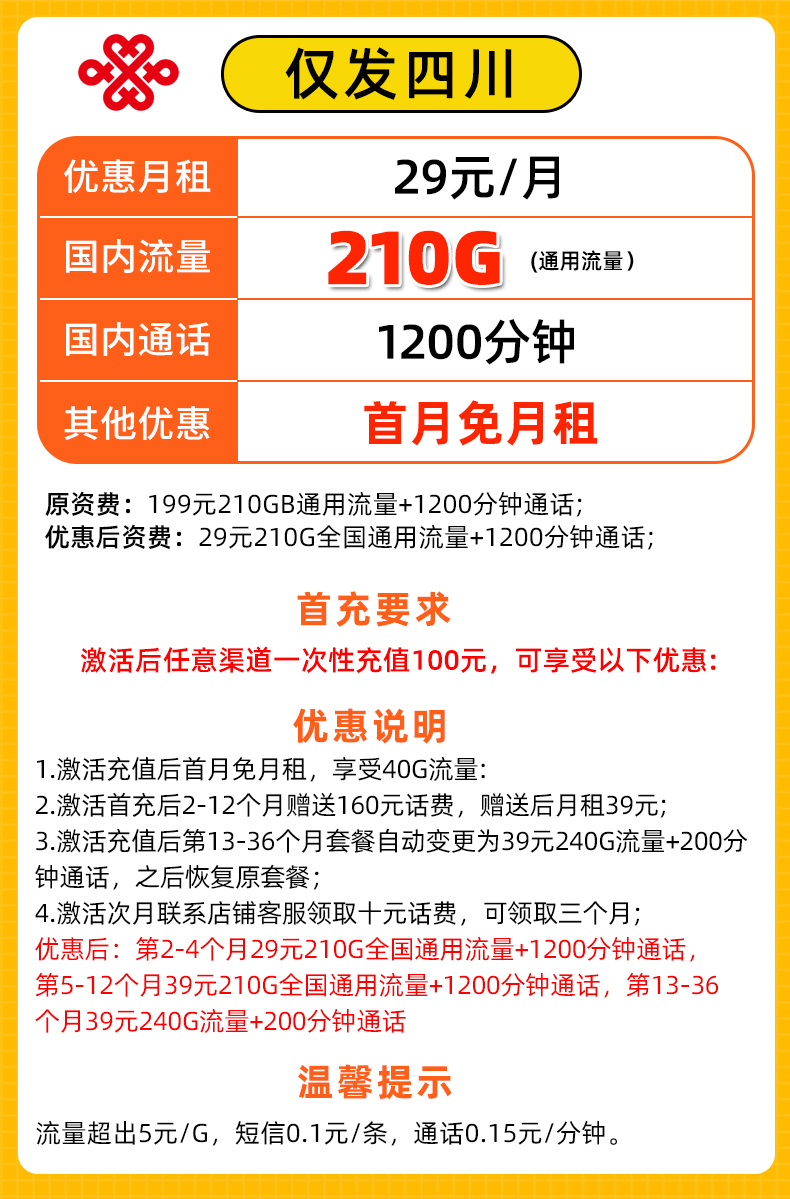 【只发四川】联通29元/月210G通用流量 1200分钟