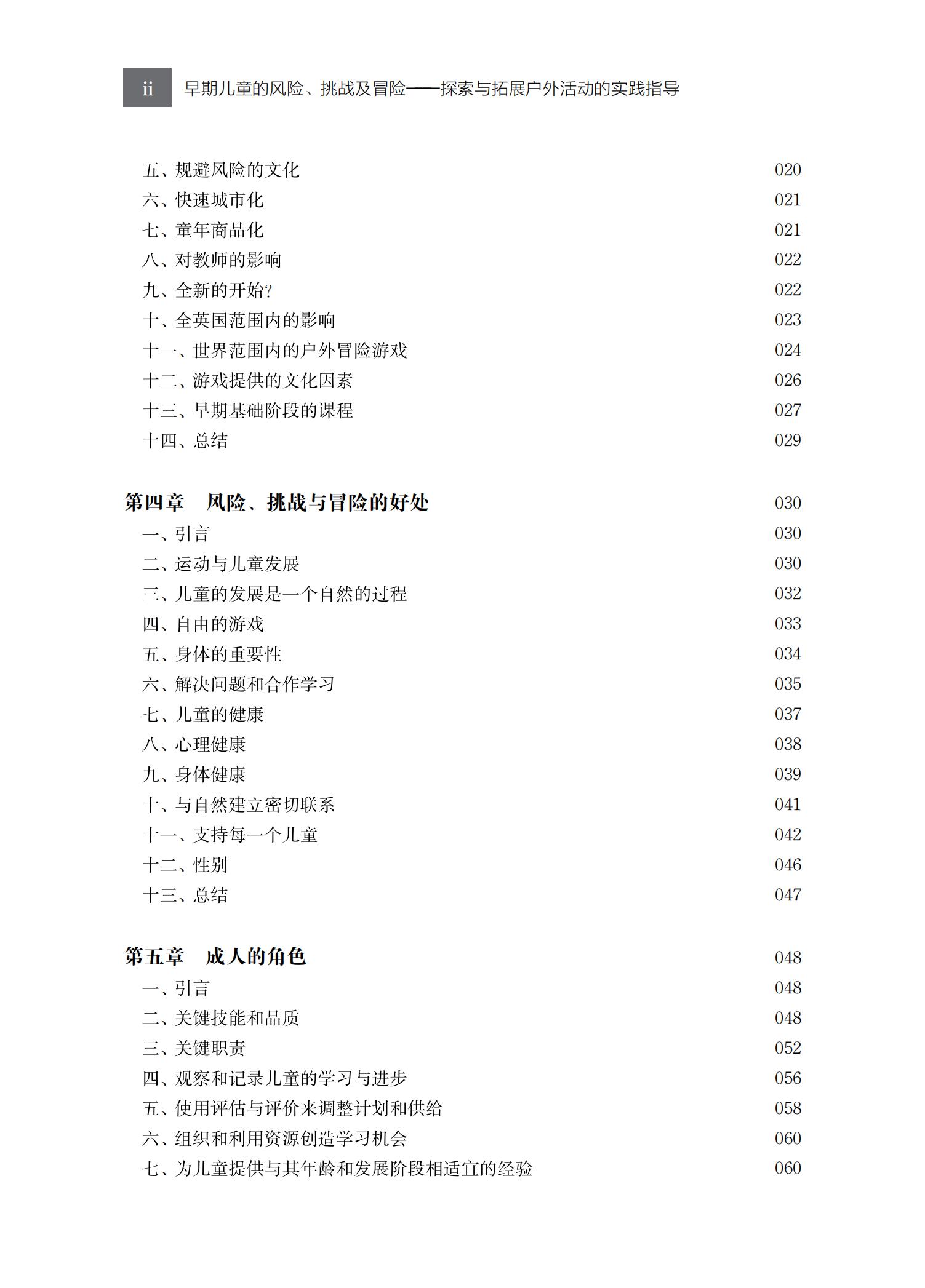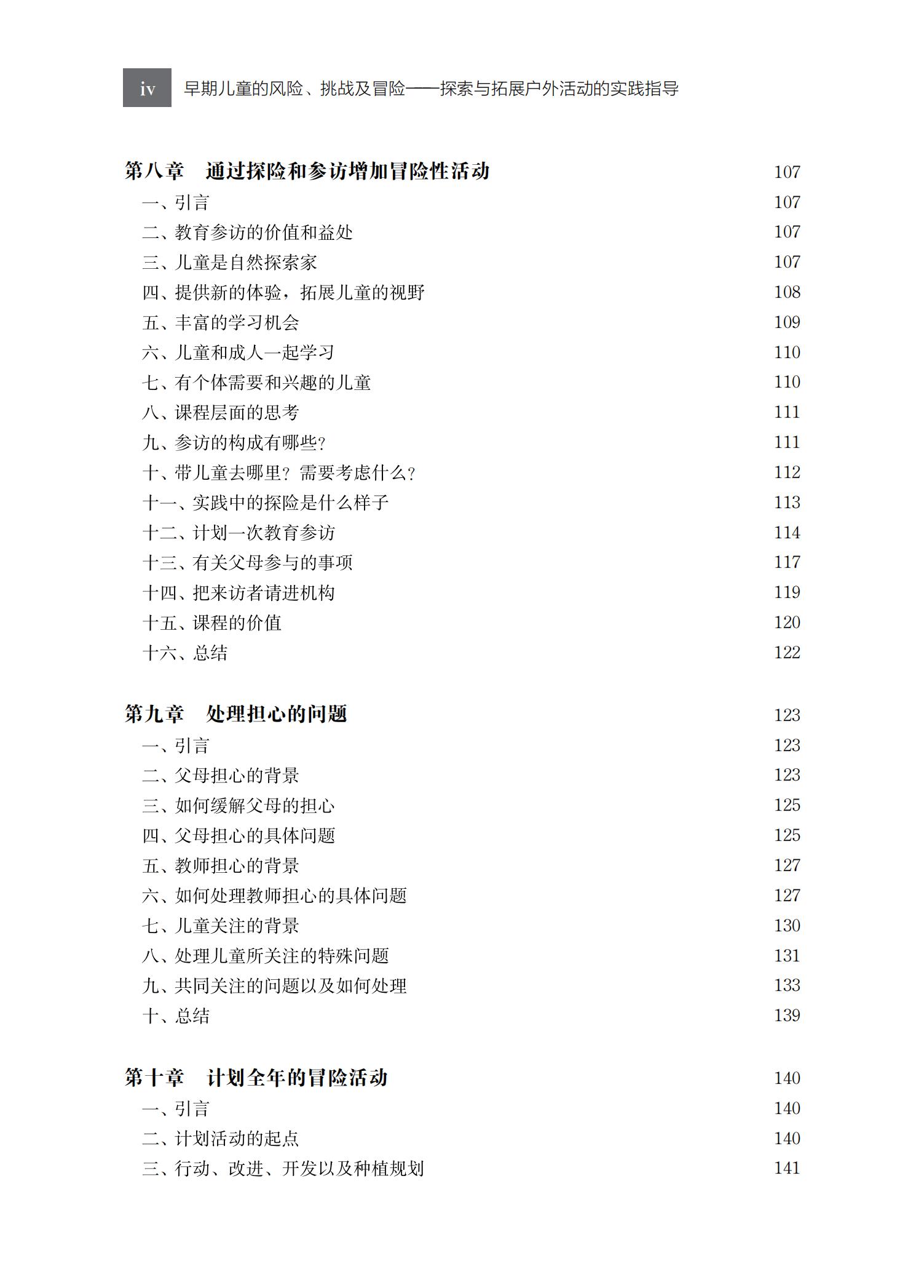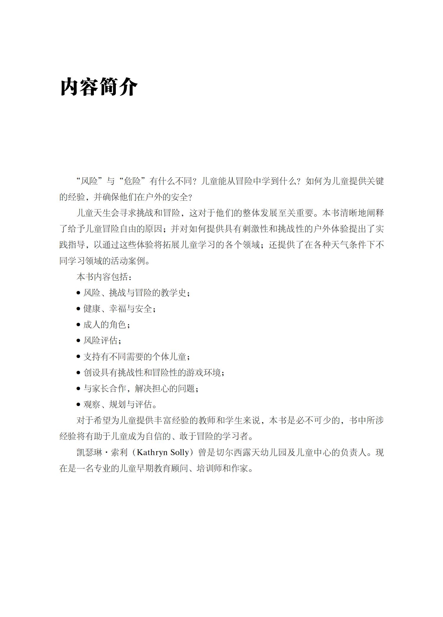 本书还提供了在各种天气条件下不同学习领域的活动案例,从冒险、风险与挑战的教育学史,健康、幸福以及保持安全,成人的角色,风险评估,支持有不同需要的个体儿童,创设具有挑战性和冒险性的游戏环境,与家长合作、处理担心的问题,观察、规划与评估等角度进行了论述。