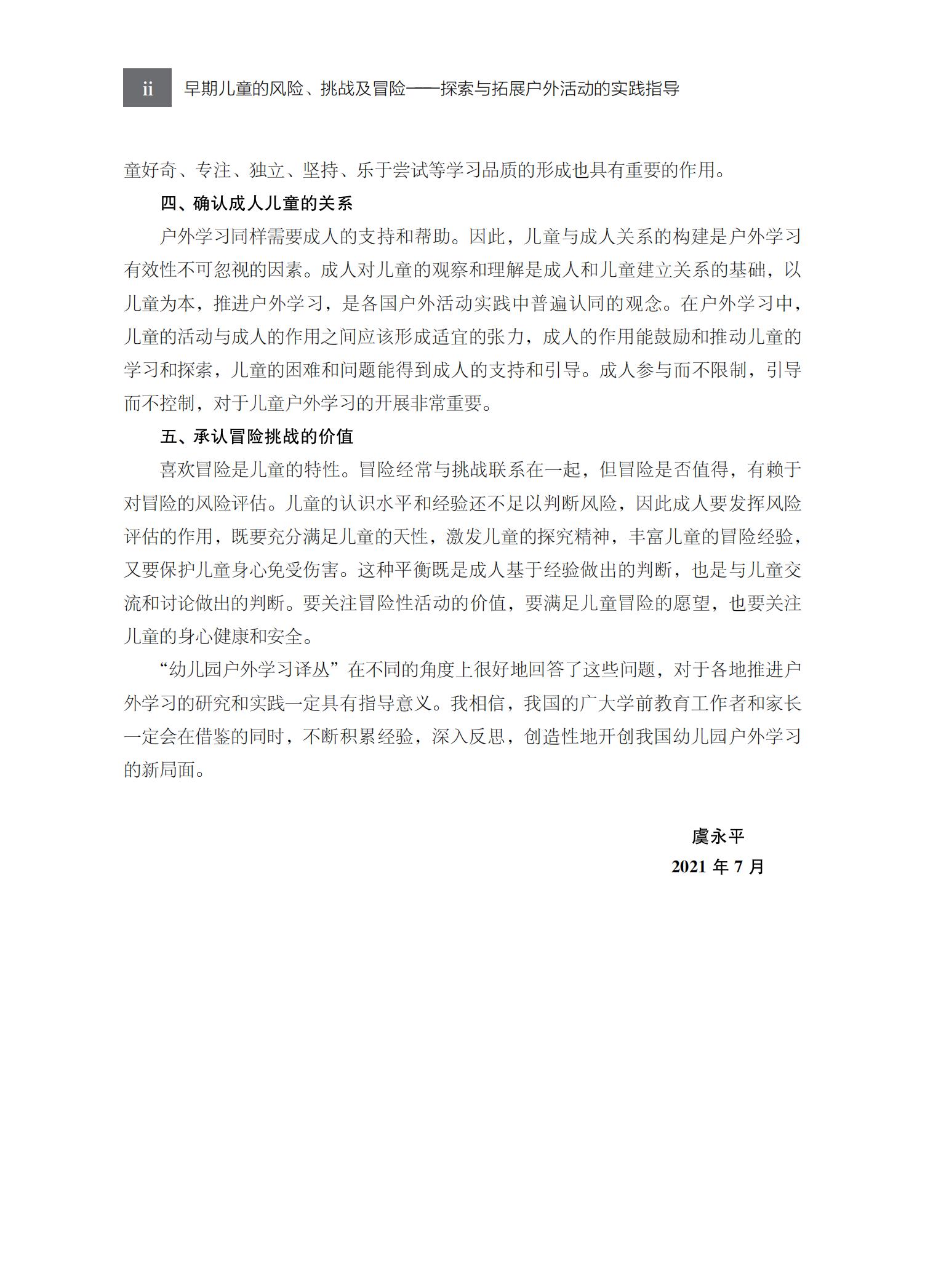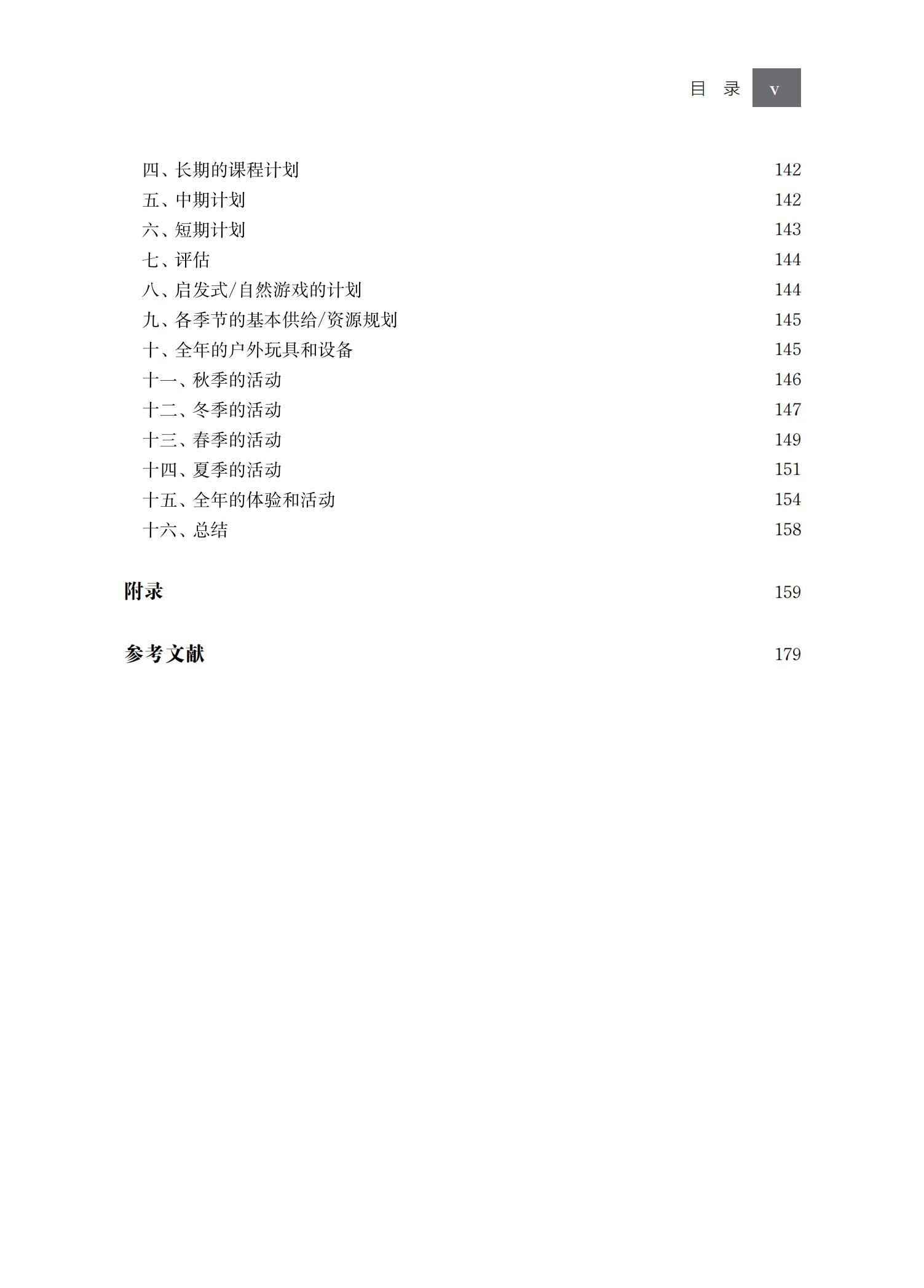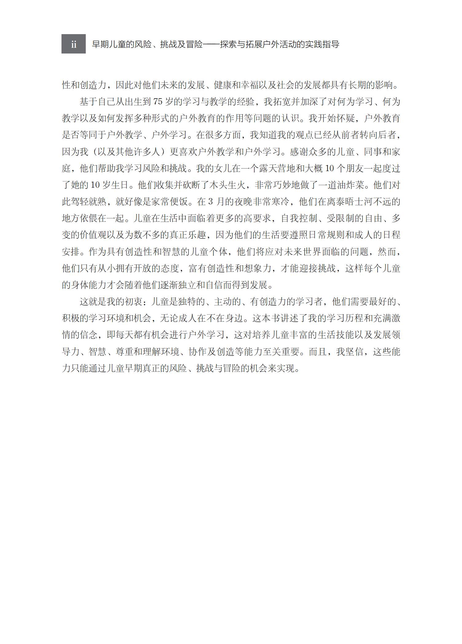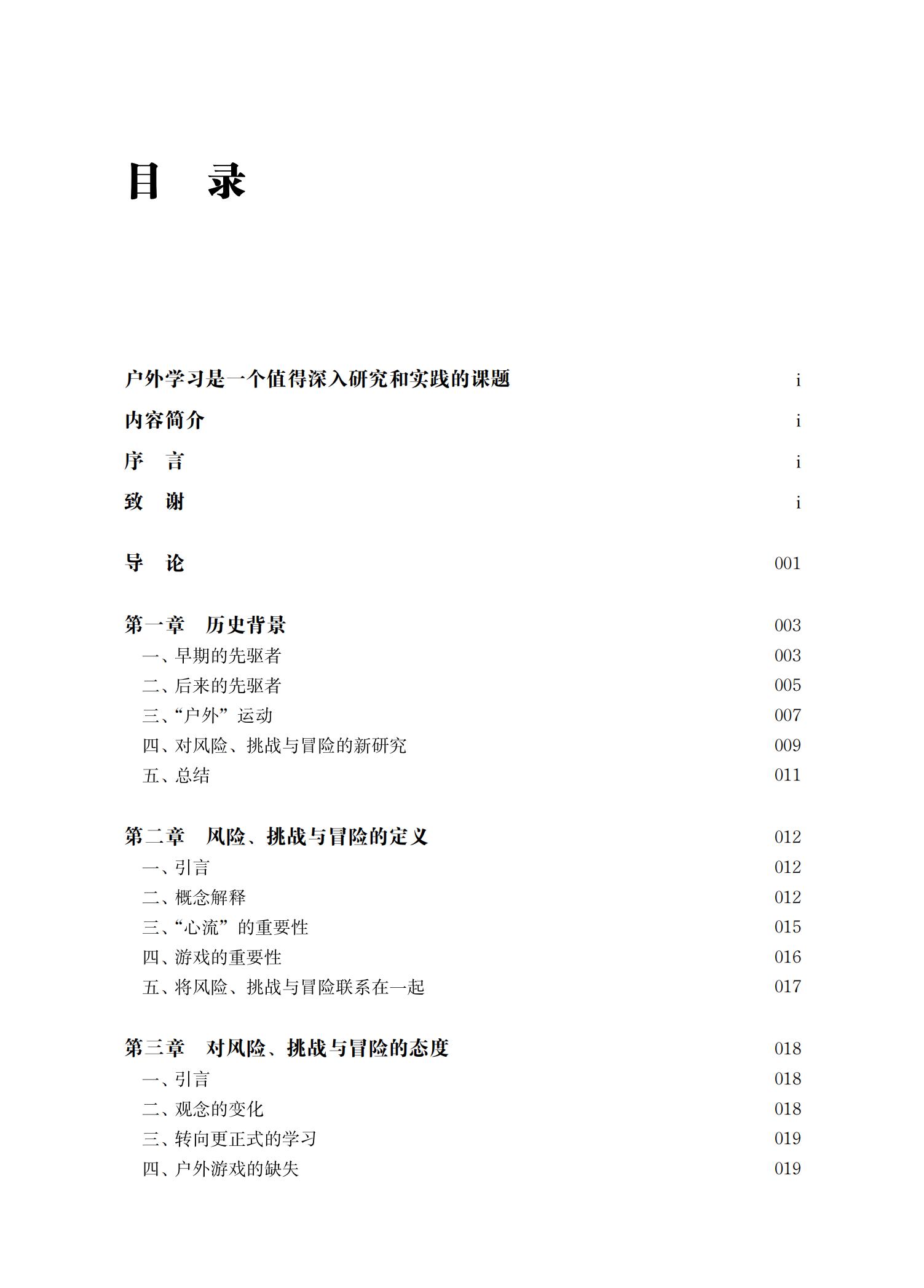 本书还提供了在各种天气条件下不同学习领域的活动案例,从冒险、风险与挑战的教育学史,健康、幸福以及保持安全,成人的角色,风险评估,支持有不同需要的个体儿童,创设具有挑战性和冒险性的游戏环境,与家长合作、处理担心的问题,观察、规划与评估等角度进行了论述。
