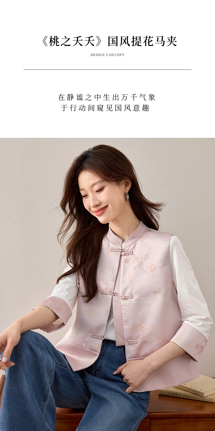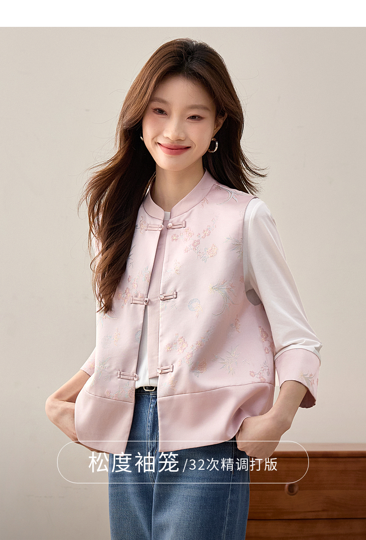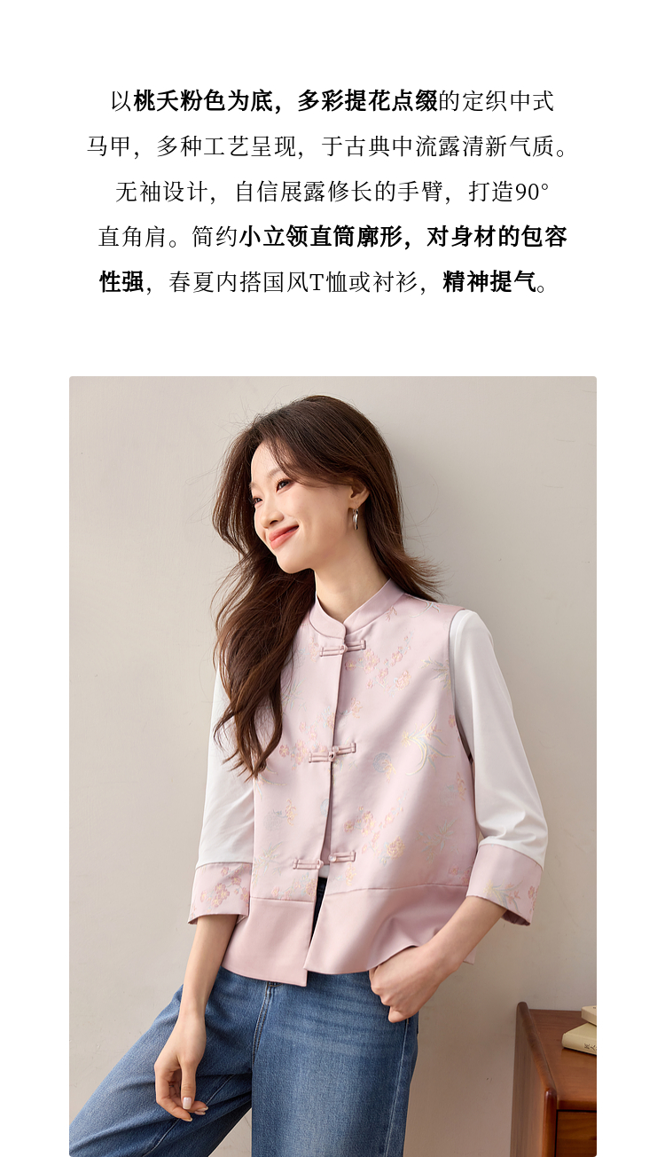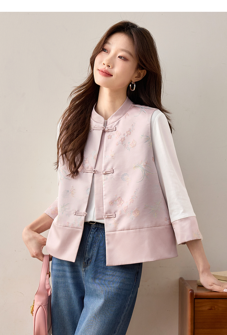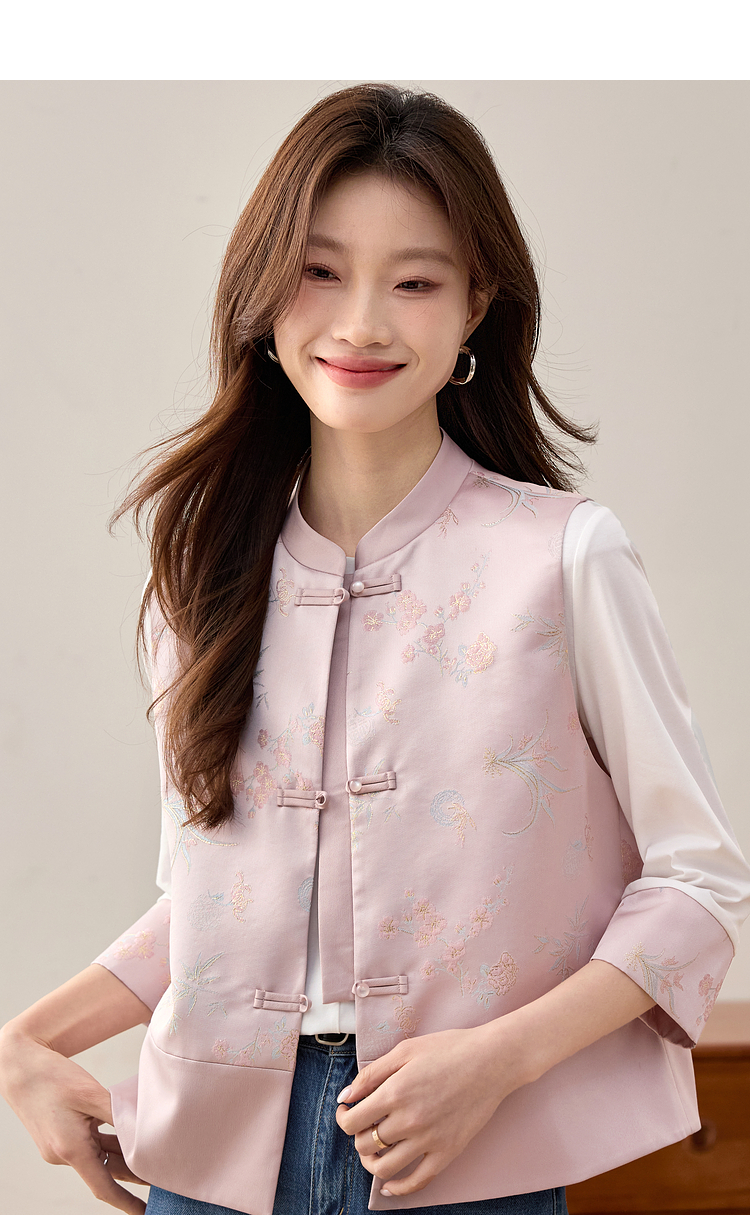 【周四狂欢价】熙世界粉色新中式提花马甲背心女春新款国风盘扣刺绣坎肩开衫上衣
