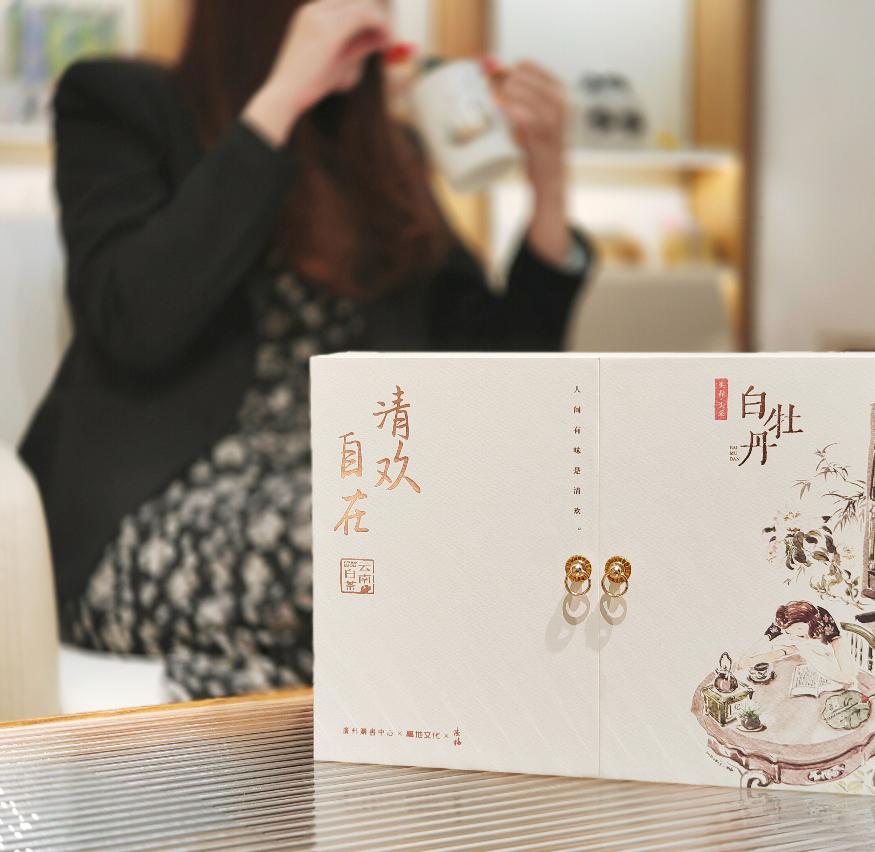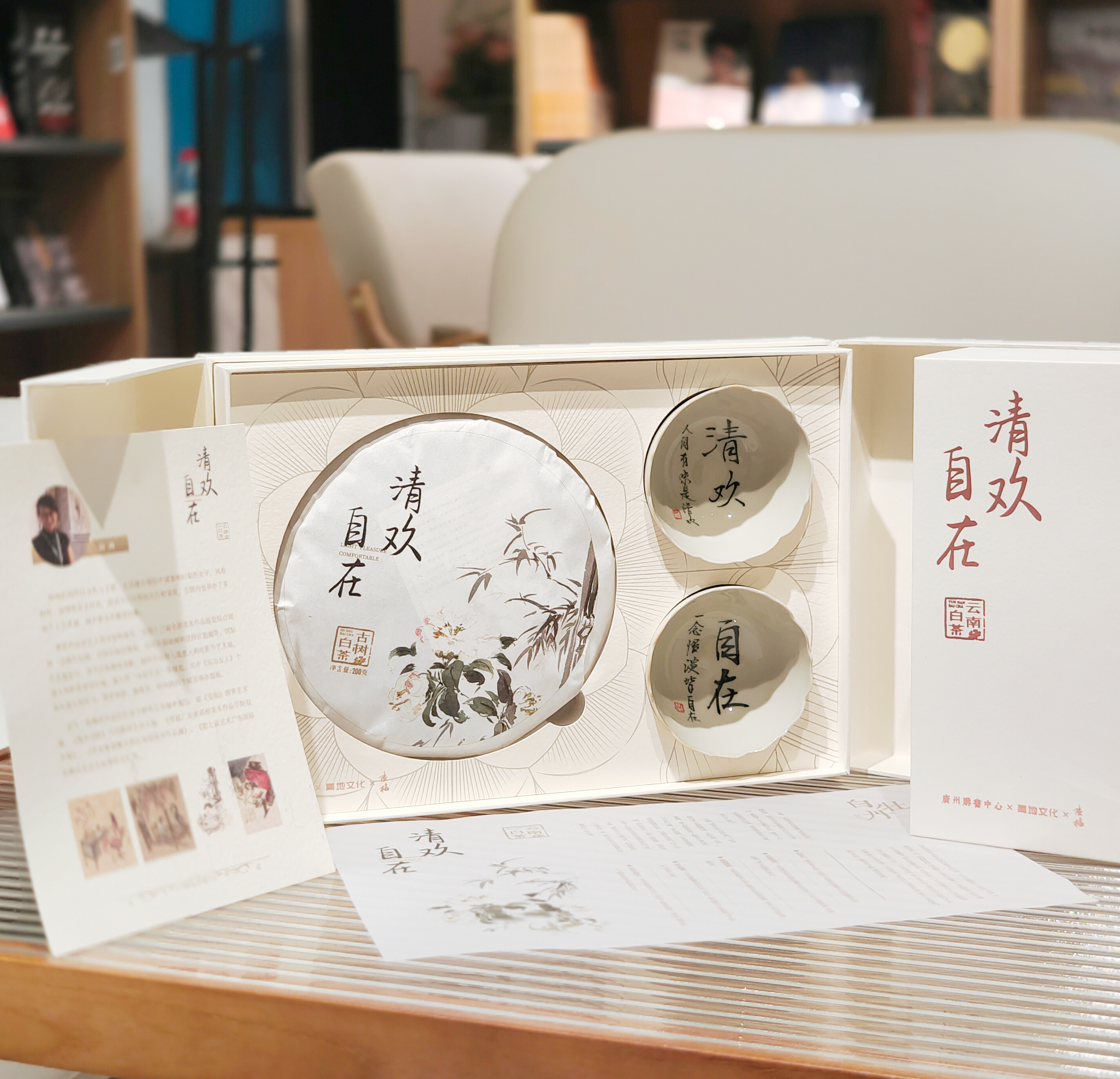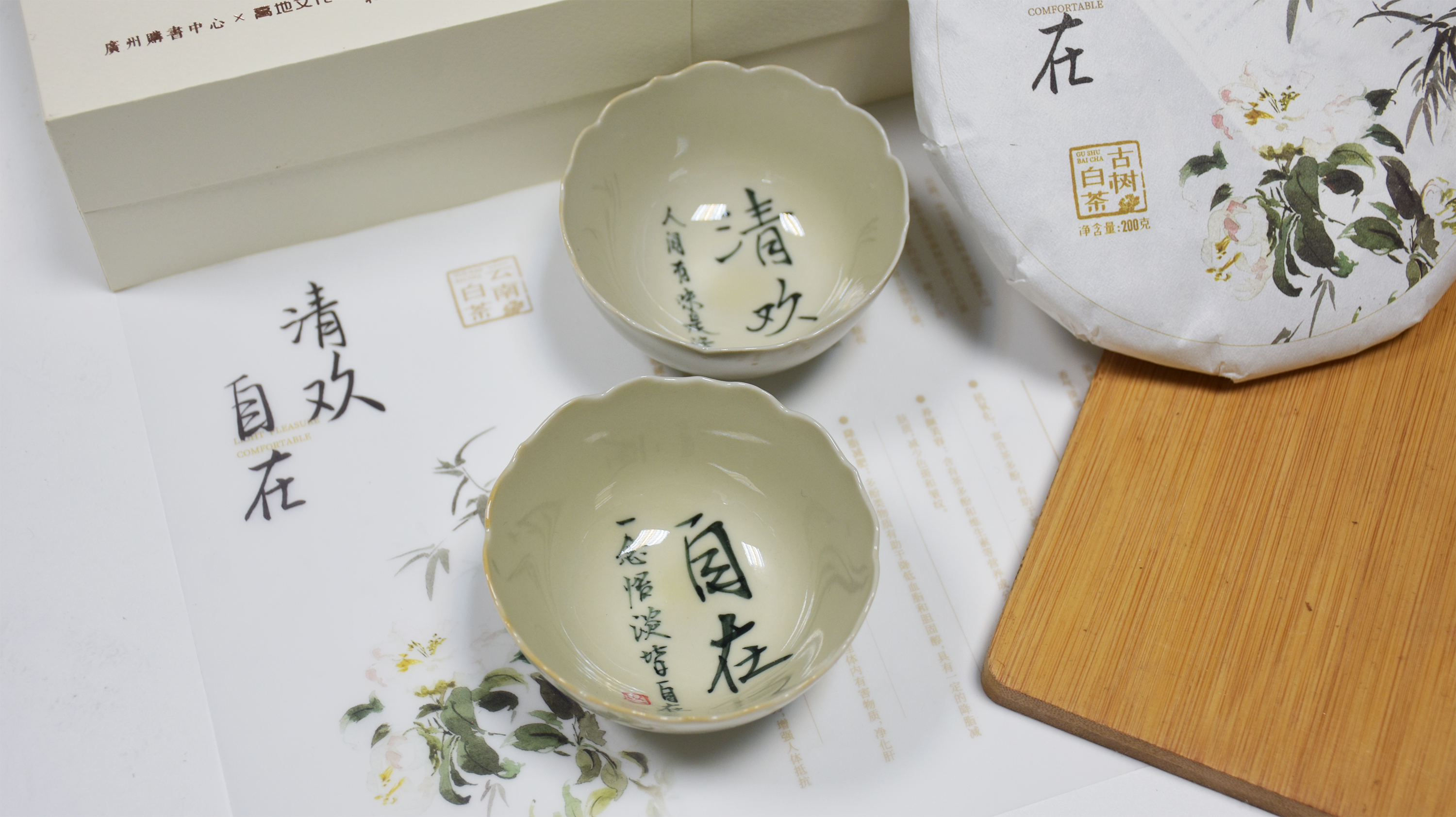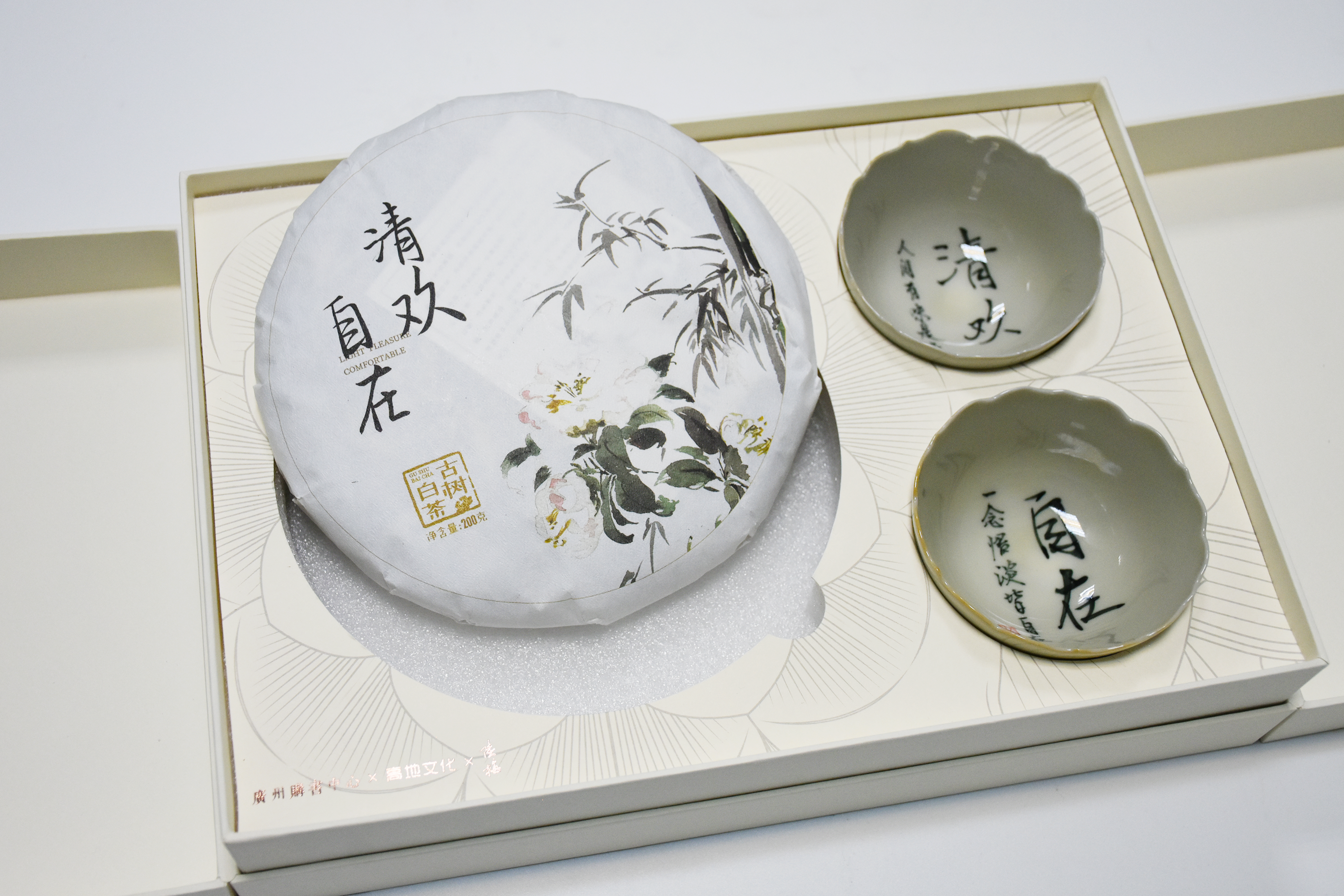 《清欢自在》白茶礼盒,是高地文化原创的一款结合了艺术与茶文化的文化创意产品。提取陆梅老师的画作元素(补充介绍)进行包装设计,呈现出清新、自然、高雅的美感。礼盒内包含精选的白牡丹白茶茶饼和一对手写陶瓷茶杯。