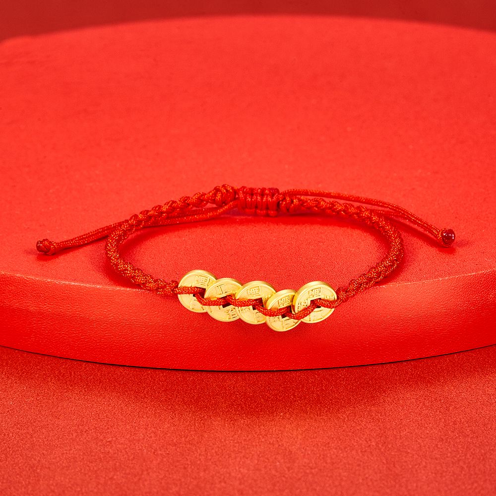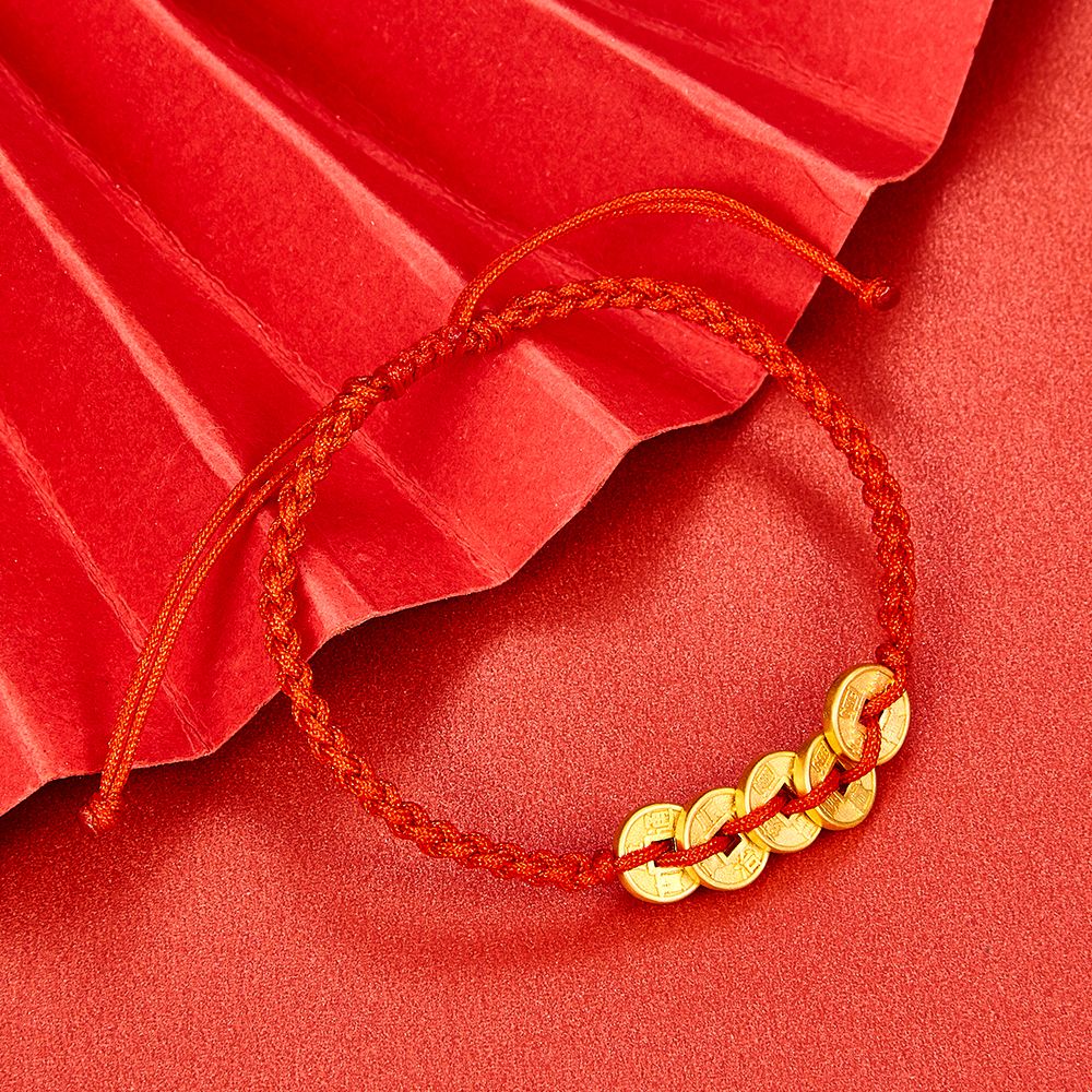 【限时7.5折】【定价黄金】足金 #招财进宝 3D硬金五帝币通宝铜钱串红绳调节成品手串(AA3DSC00028)预售产品下单后不退款不退货不换货不补差价