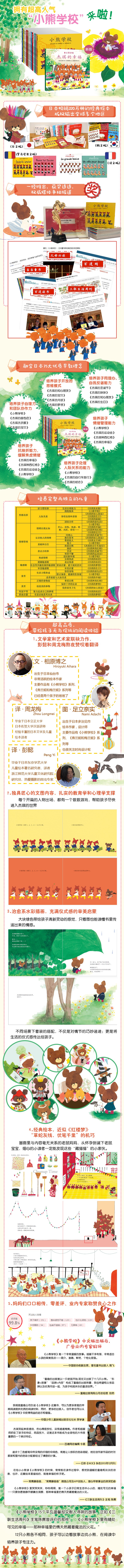 《三联生活周刊》的主编陈赛在《关于人生,我所知道的一切都来自童书》一书中提到:“我一直觉得,将日常生活过成诗,是日本人的天赋。《小熊学校》里的哭哭笑笑,吵吵闹闹,日子一个个晃晃悠悠地过去,有时候平淡无奇,有时候又好像很奇幻,不是《哈利·波特》那种上天入地的魔幻,而是一个小孩子日常生活中小小的、随处可见的幸福——只要你愿意睁开眼睛去观察,那种幸福里仿佛天然藏着魔法的火花。”“小熊学校”系列,通过平凡生活中不平凡的故事带给孩子不一样的榜样力量。