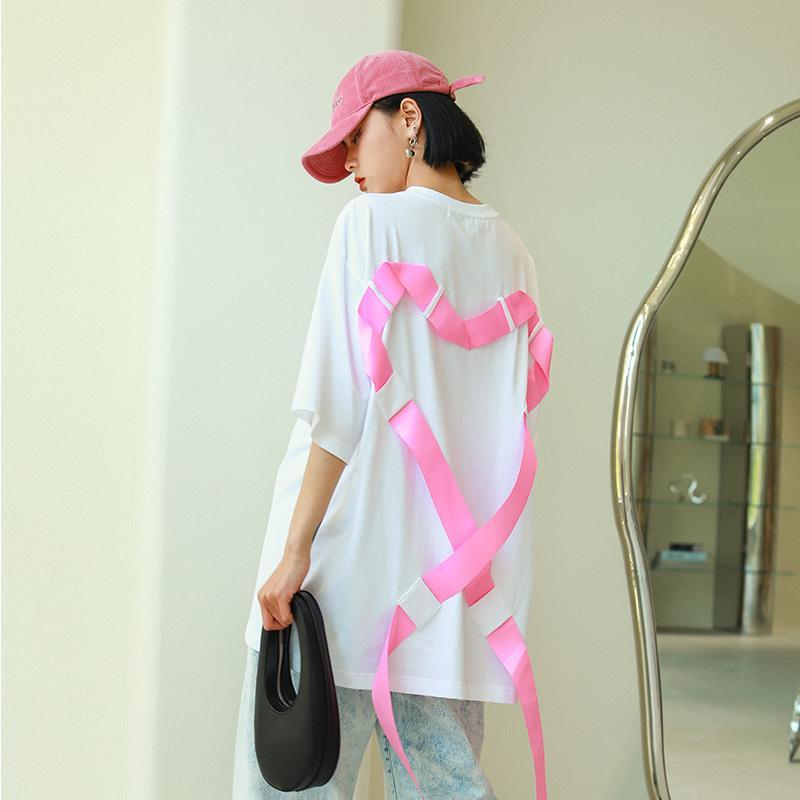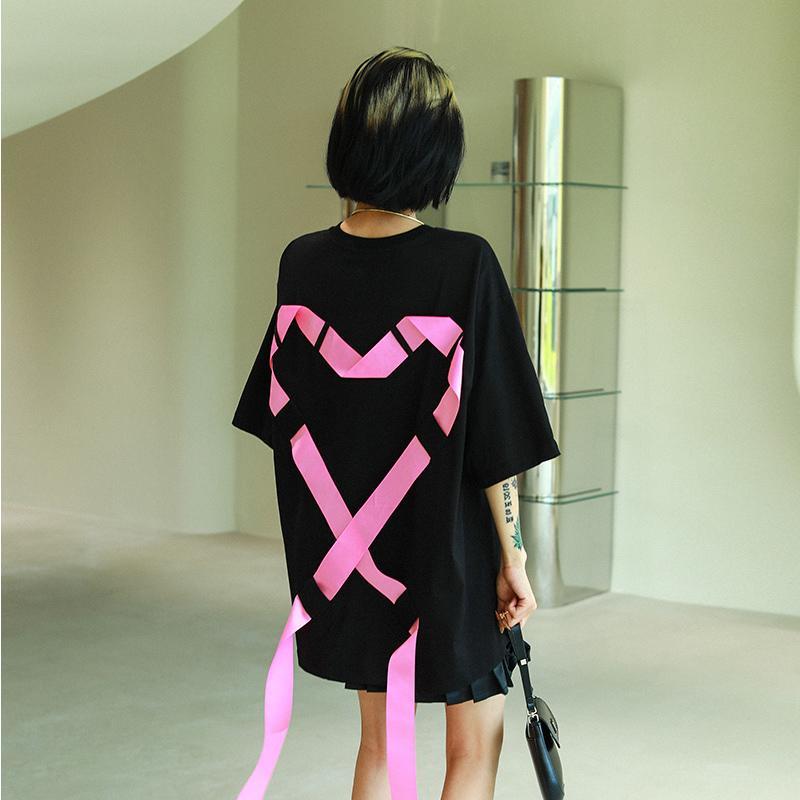 【时尚又新颖的T恤】黛唯梵 夏季大码飘带爱心短袖T恤女,宽松设计感小众上衣ins潮热卖
