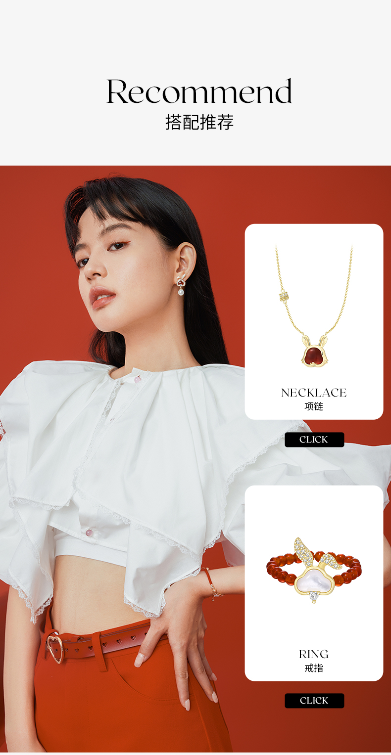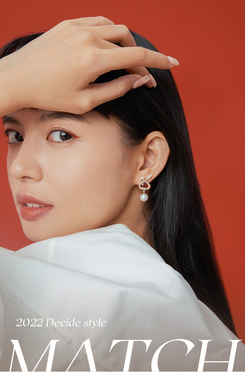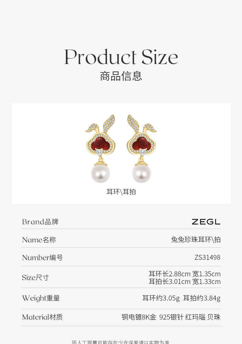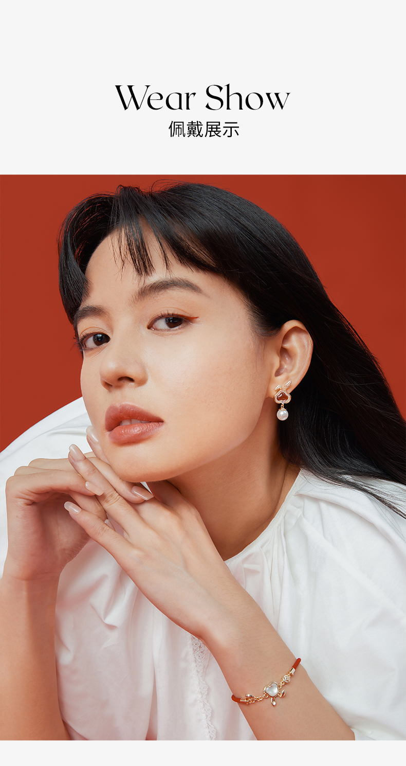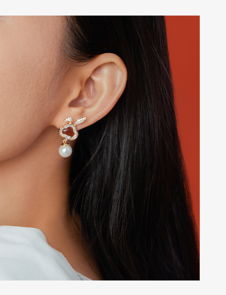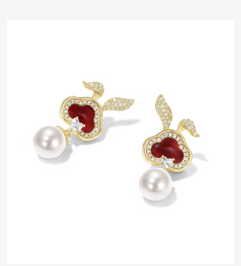 ZEGL设计师本命年系列如意兔子耳环女红玛瑙耳钉耳夹人造珍珠耳饰