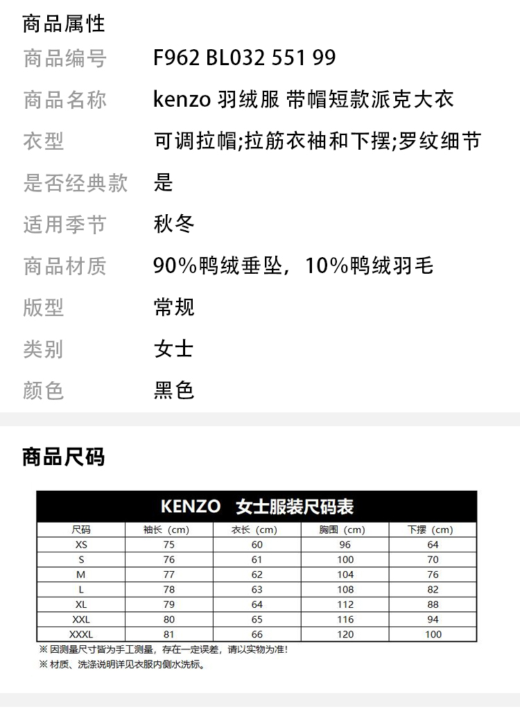 KENZO 高田贤三 女士羽绒服 黑色 F962 BL032 551 99