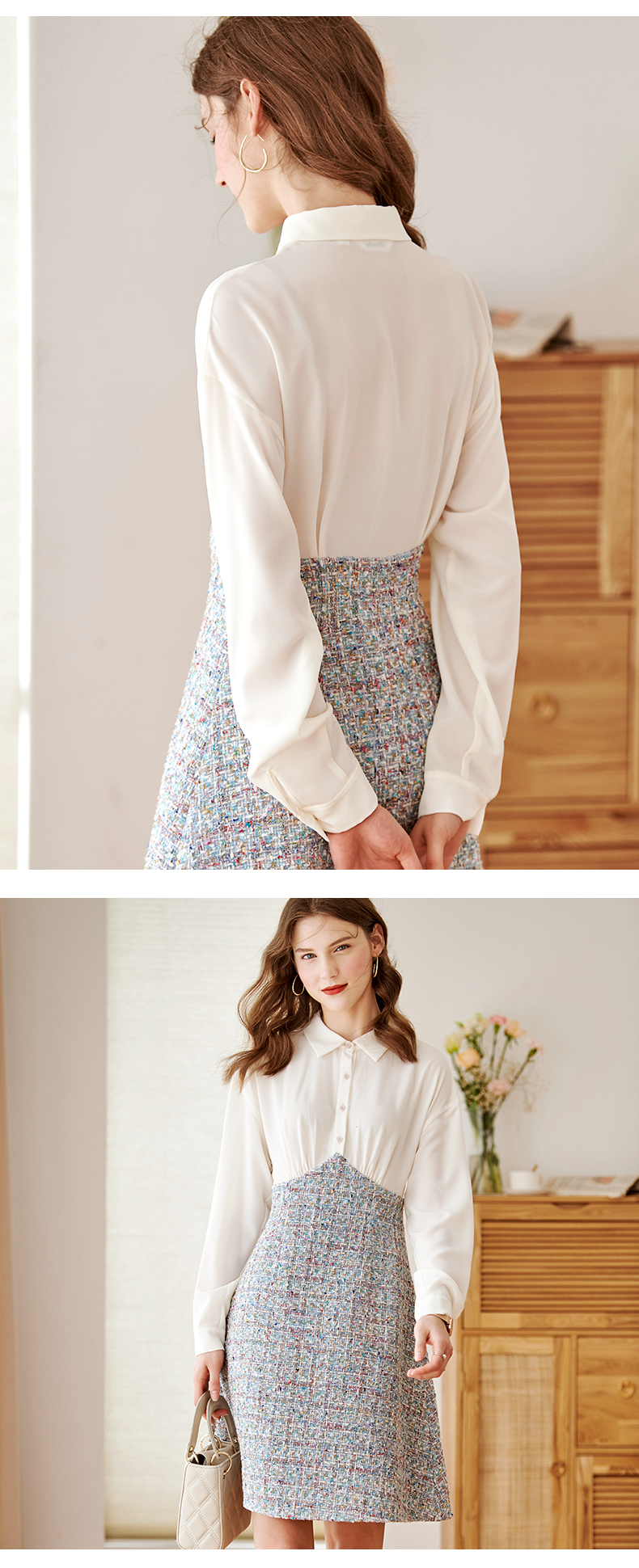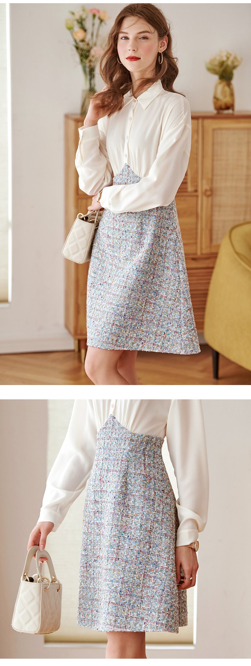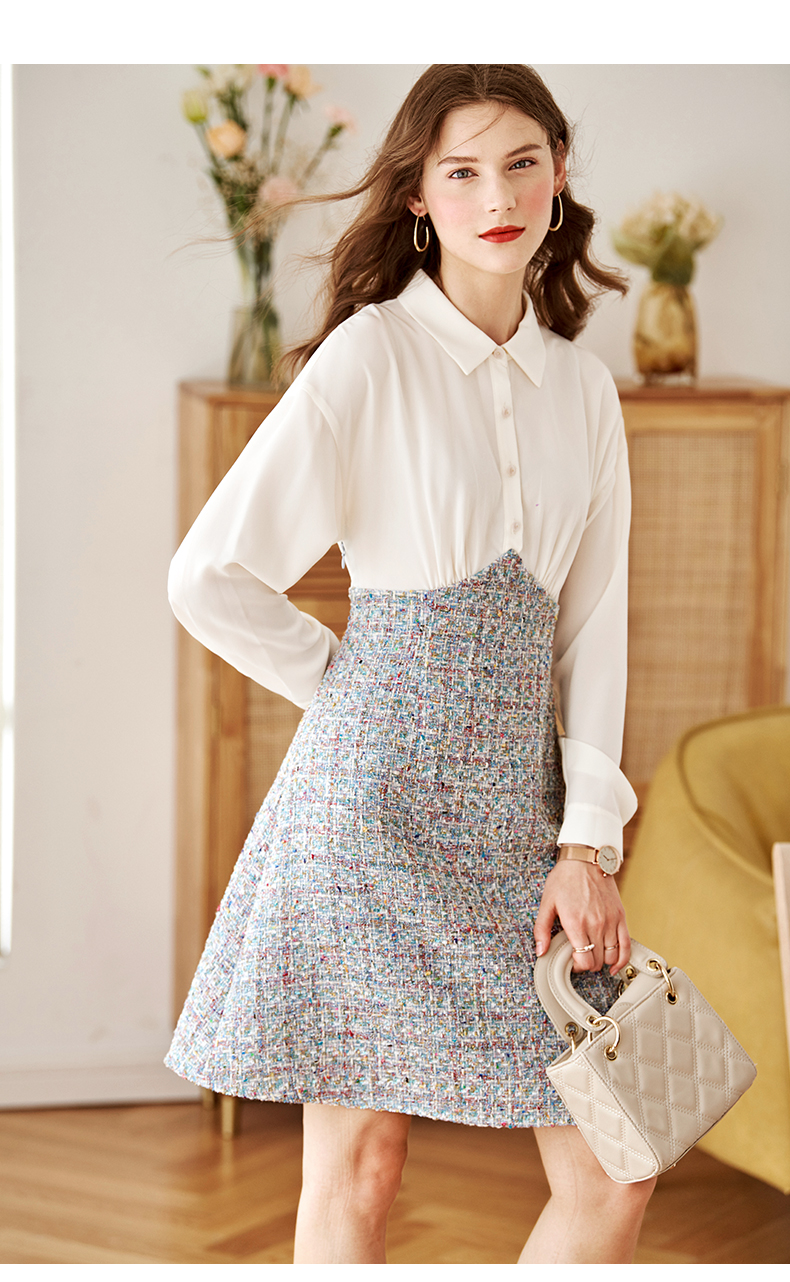 白色针织小衫搭配蓝色大A字裙摆,如同空中明珠,