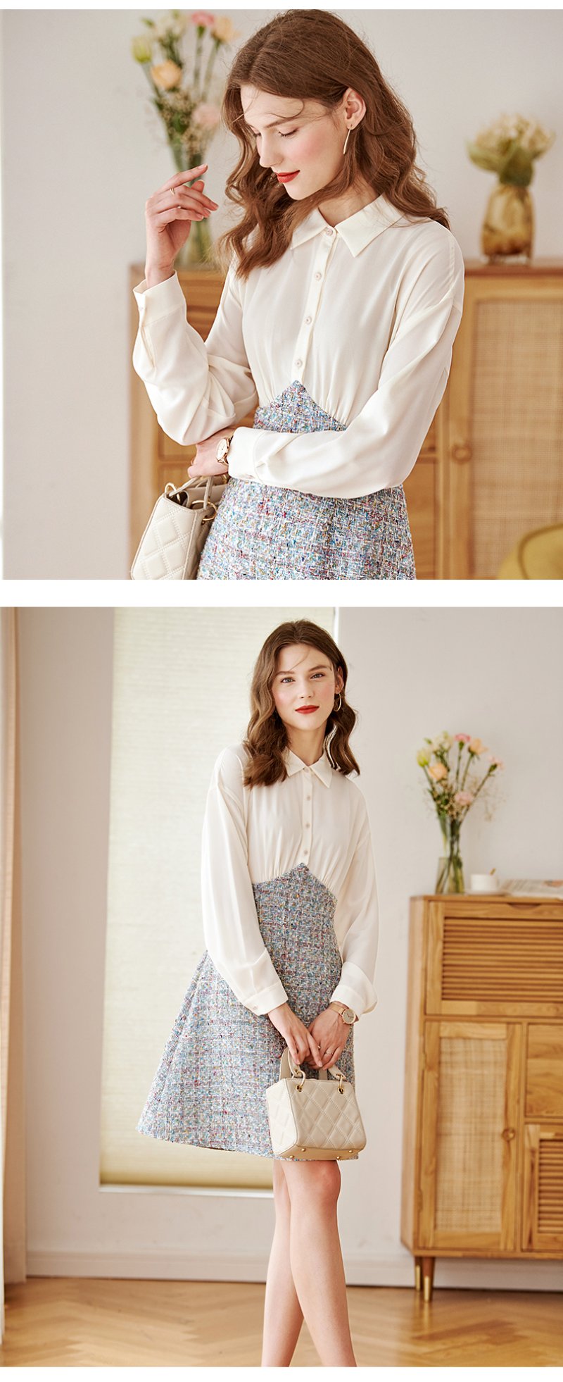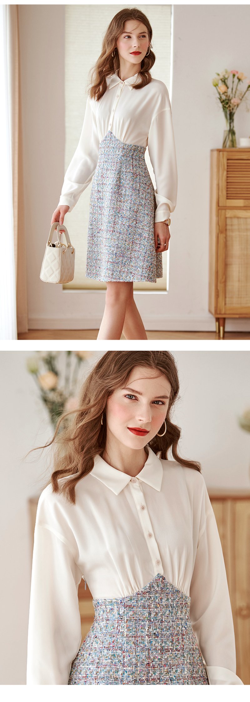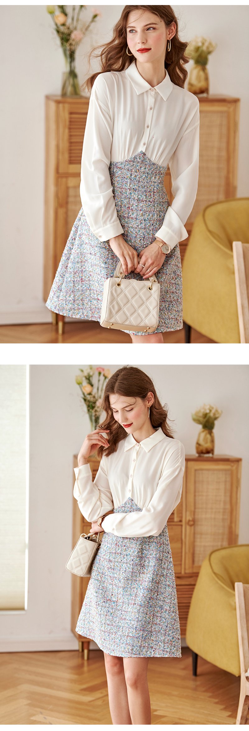 白色针织小衫搭配蓝色大A字裙摆,如同空中明珠,