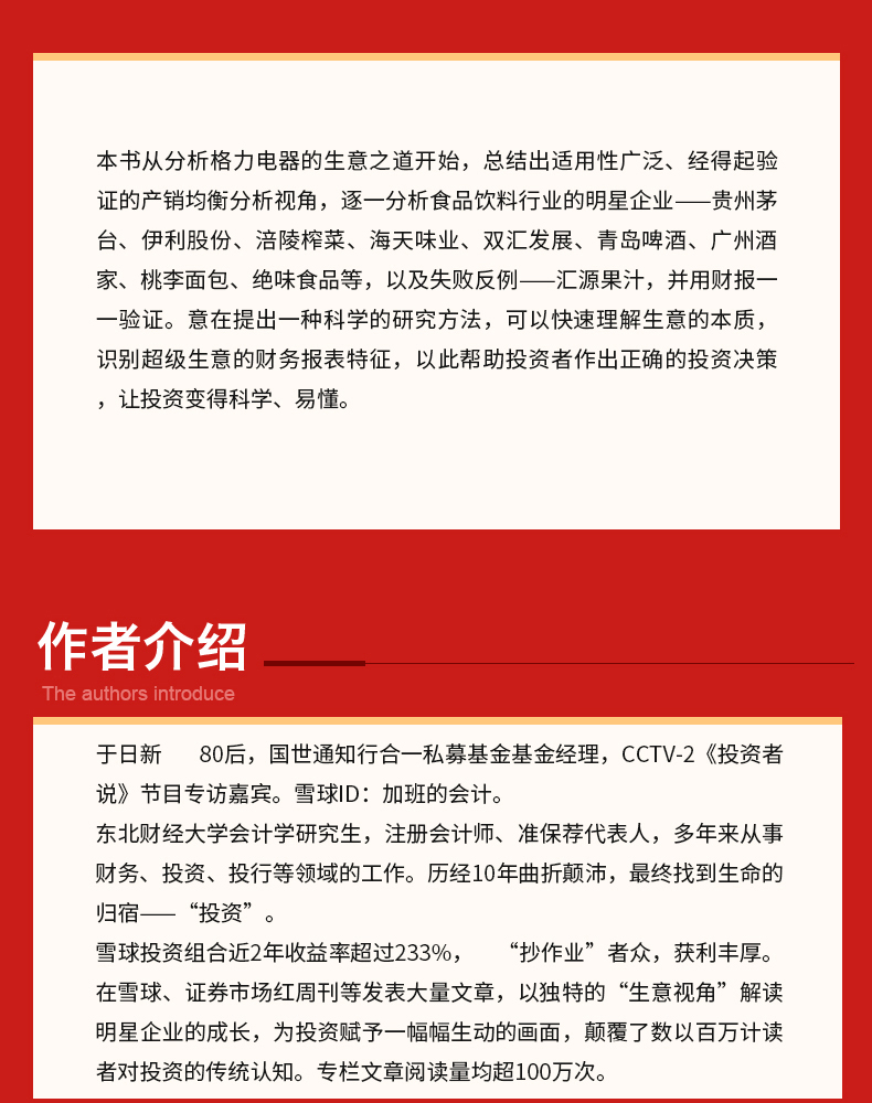 本书从分析格力电器的生意之道开始,总结出适用性广泛、经得起验证的产销均衡分析视角,逐一分析食品饮料行业的明星企业——贵州茅台、伊利股份、涪陵榨菜、海天味业、双汇发展、青岛啤酒、广州酒家、桃李面包、绝味食品等,以及失败反例——汇源果汁,并用财报一一验证。意在提出一种科学的研究方法,可以快速理解生意的本质,识别*生意的财务报表特征,以此帮助投资者作出正确的投资决策,让投资变得科学、易懂。