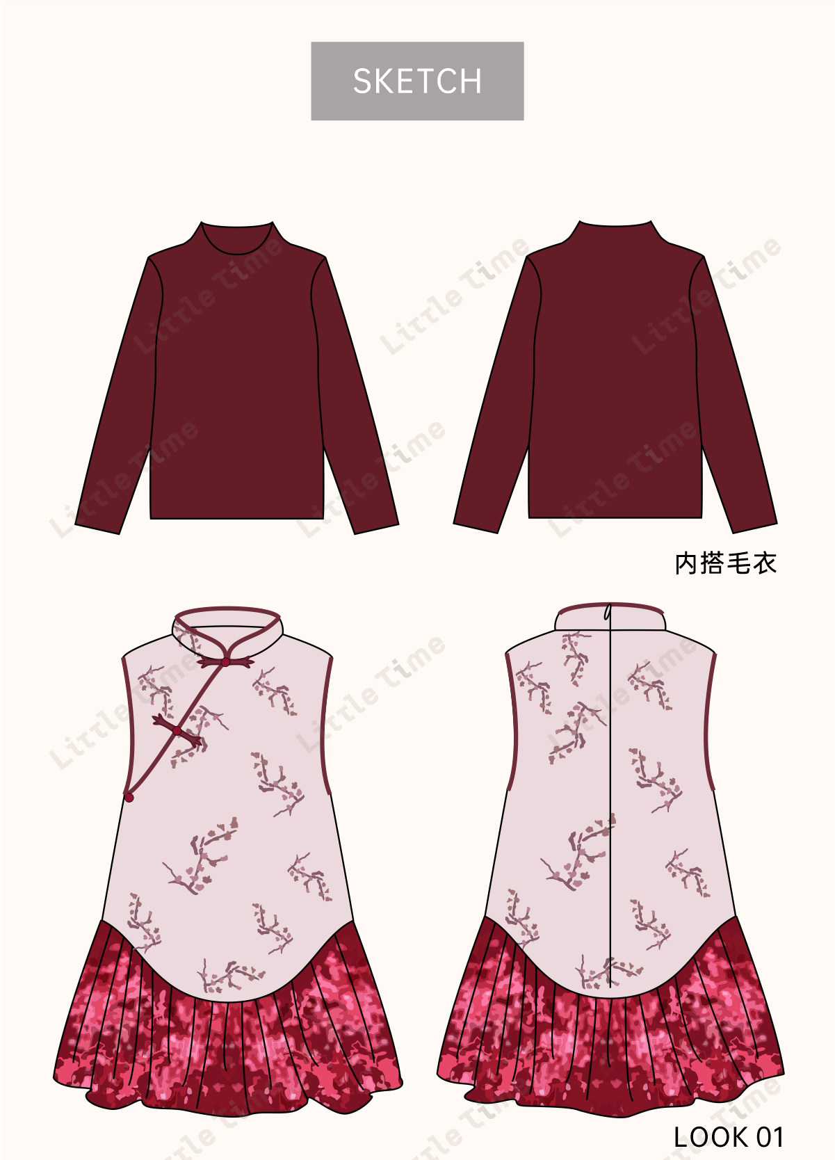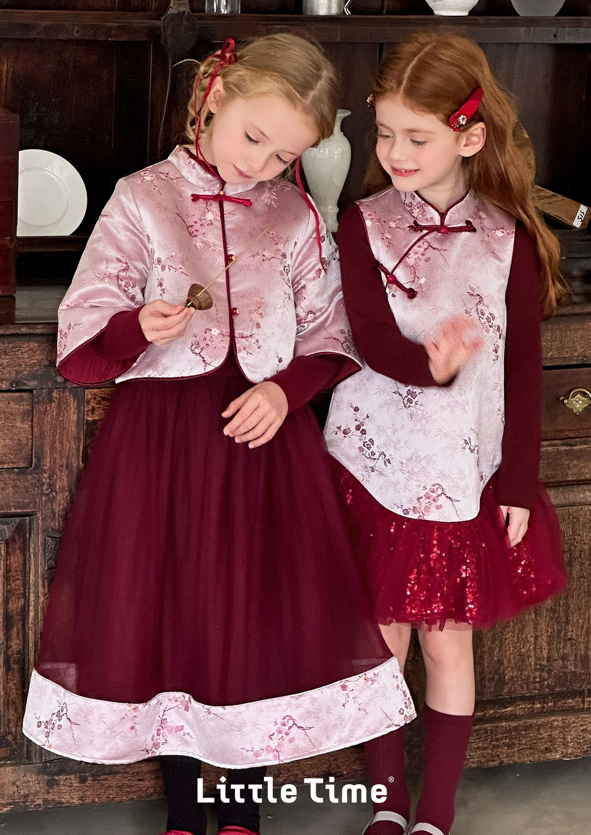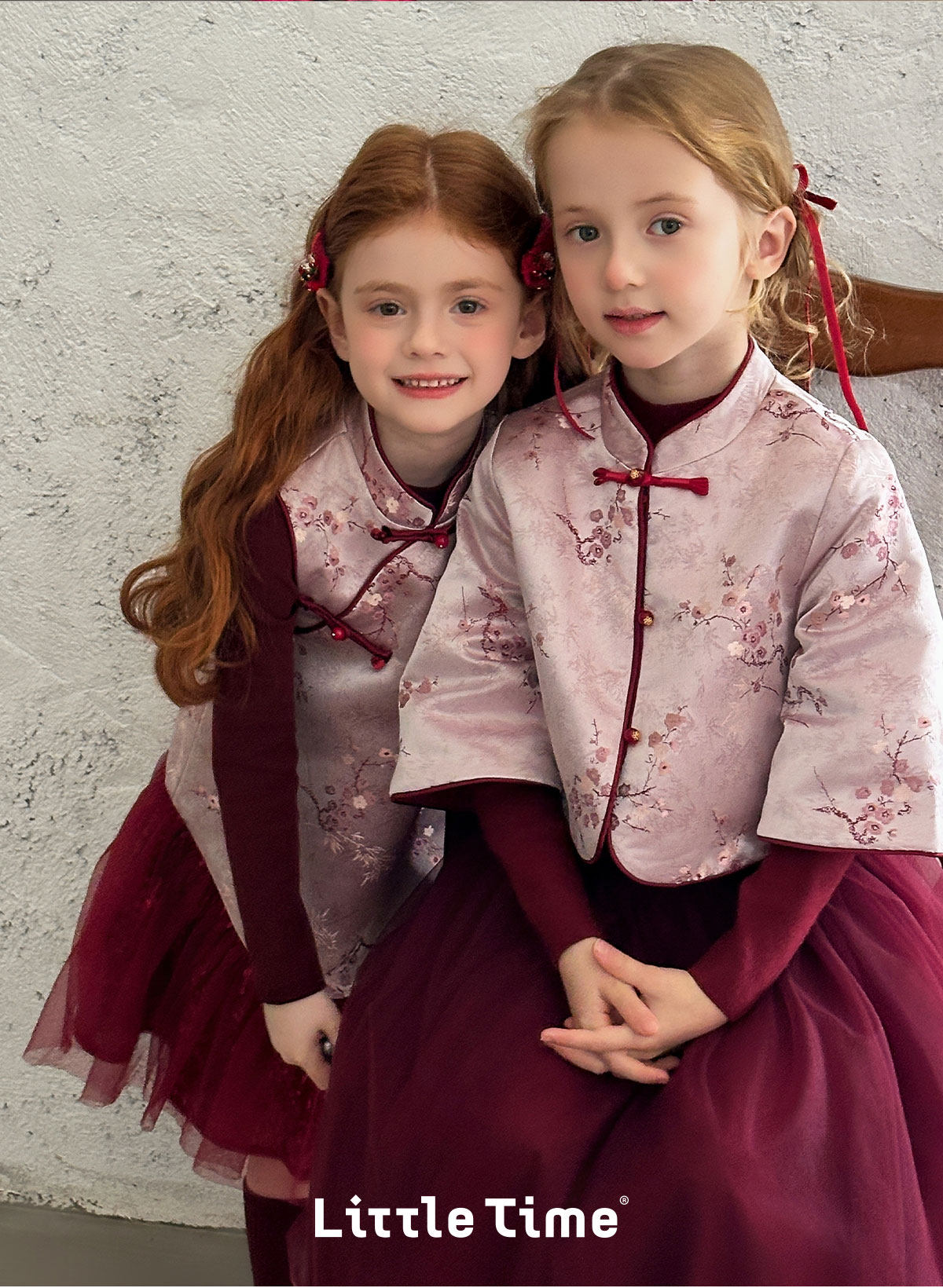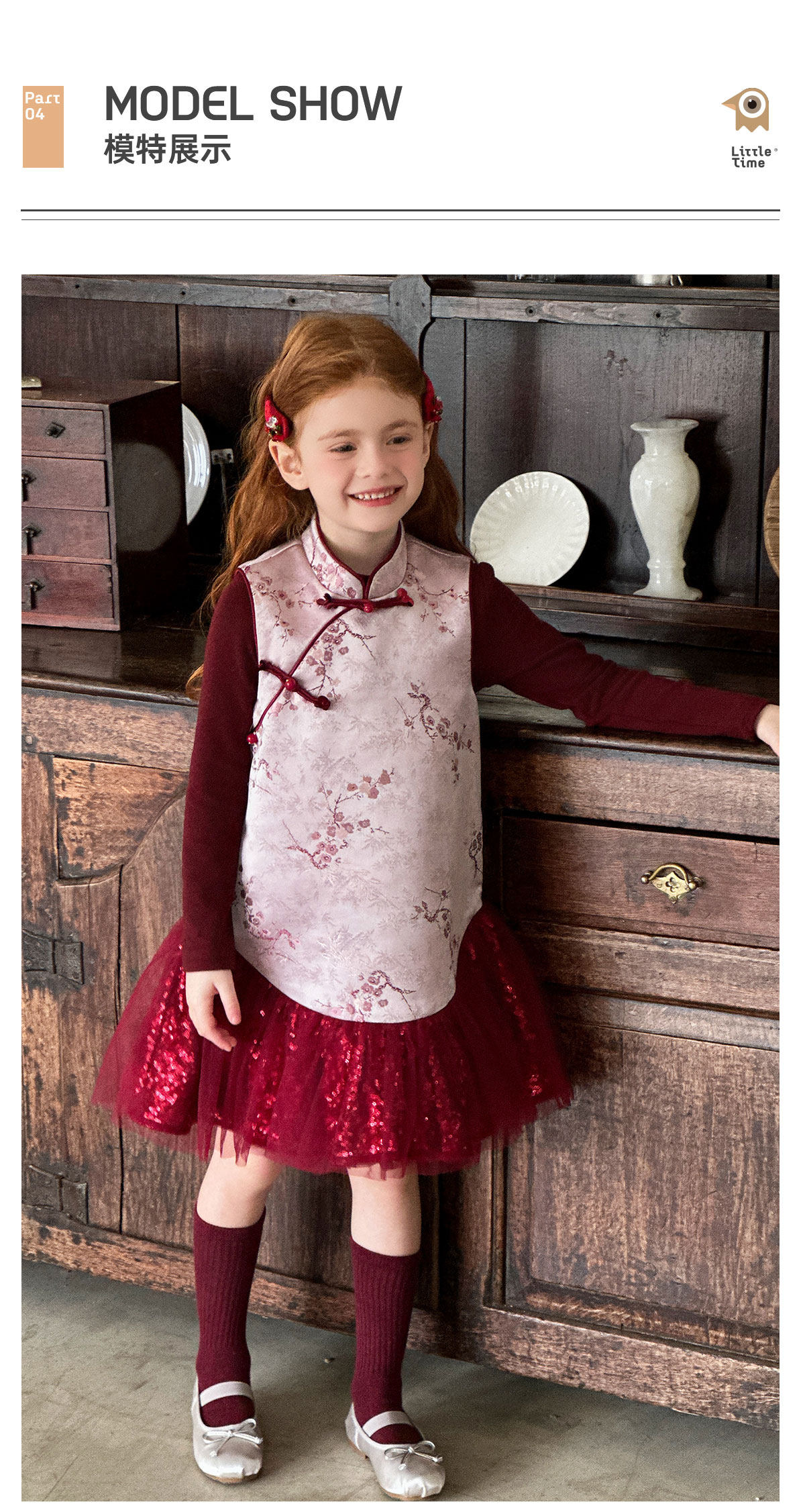 littletime新中式女童旗袍连衣裙拜年服立领盘扣花卉喜庆拜年服