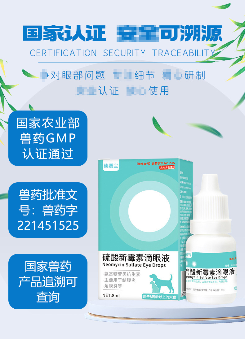 【德赛宝】硫酸新霉素宠物滴眼液8ml/瓶狗狗猫咪眼药水洗眼液