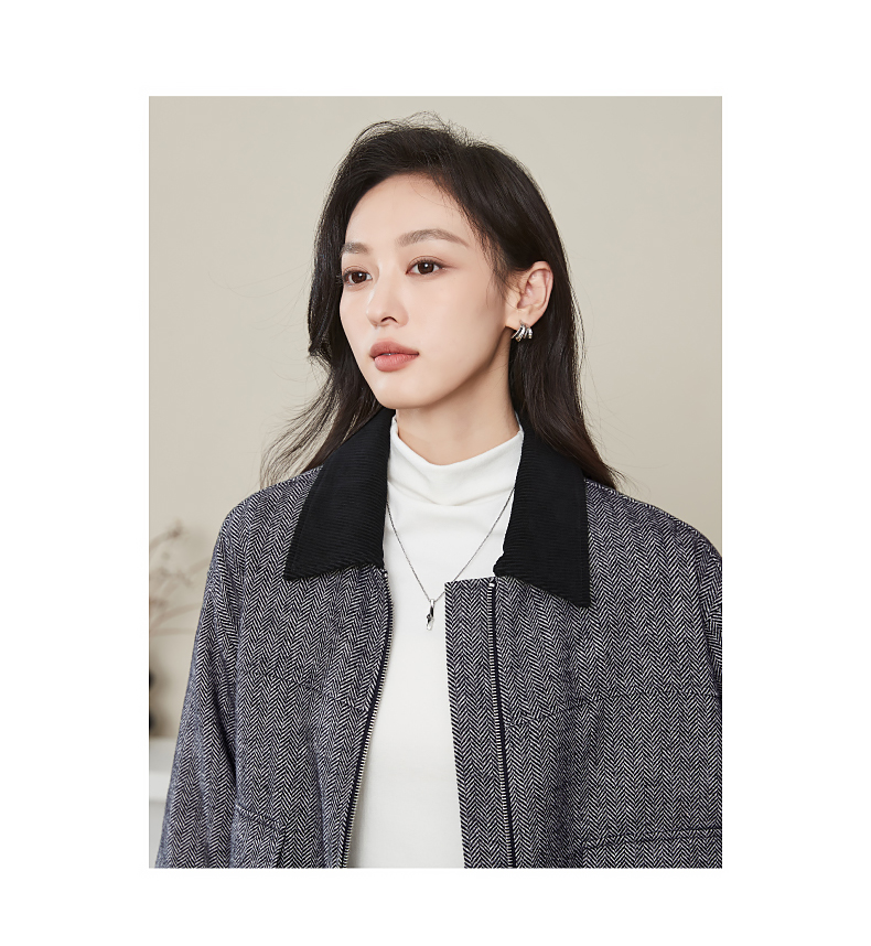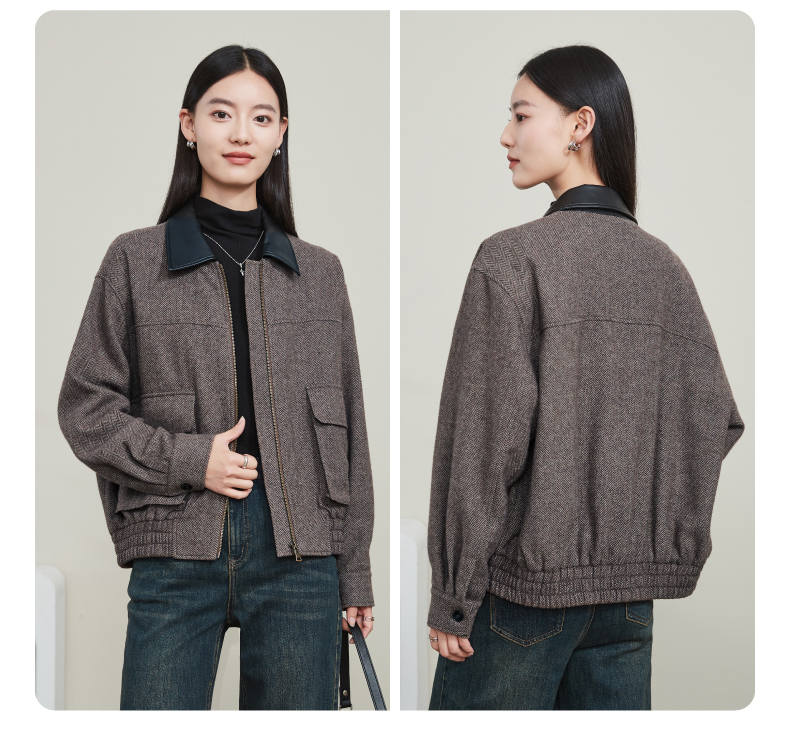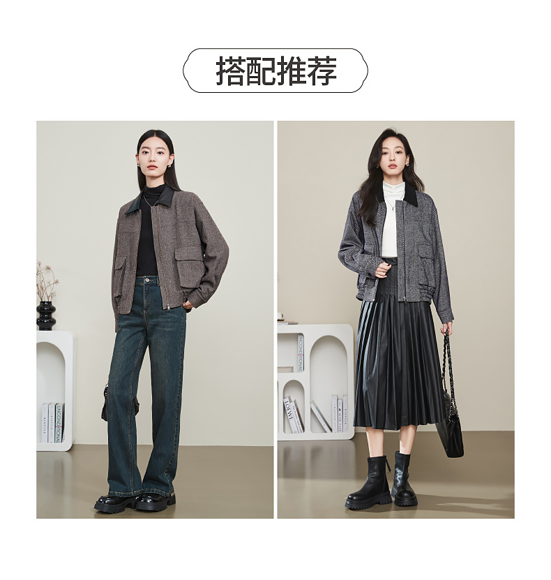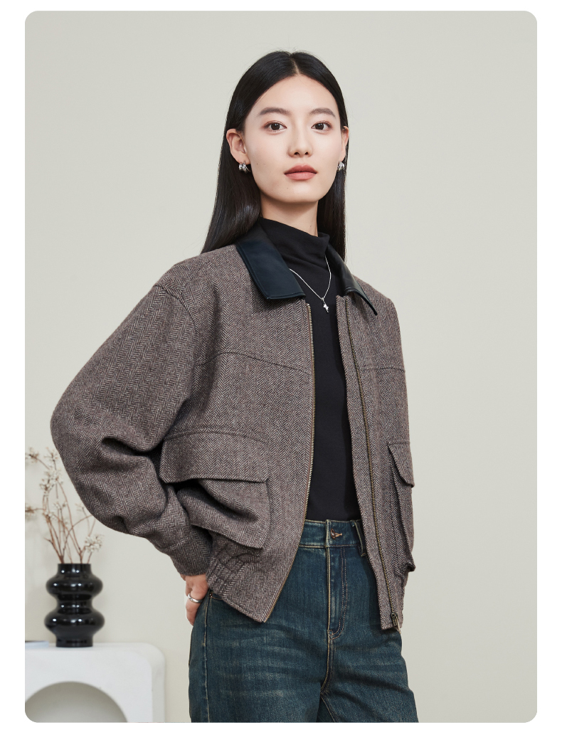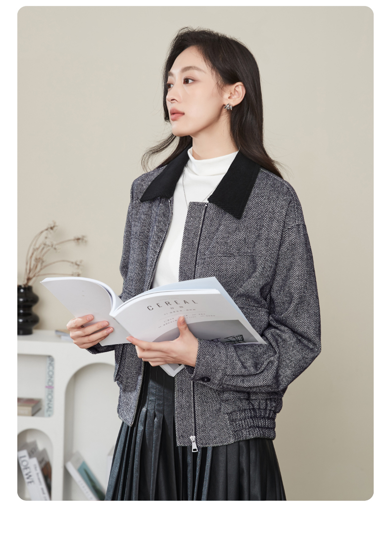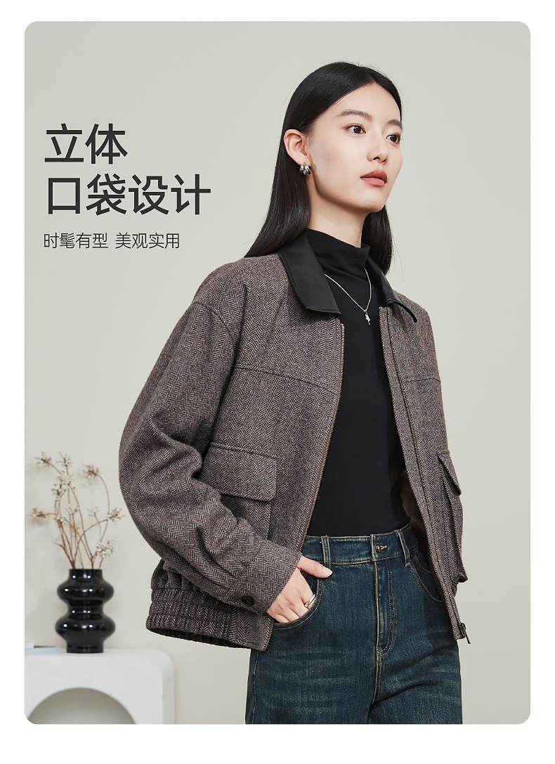 【超值!羊毛夹克外套】逸阳复古翻领人字纹短款宽松简约通勤外套3904