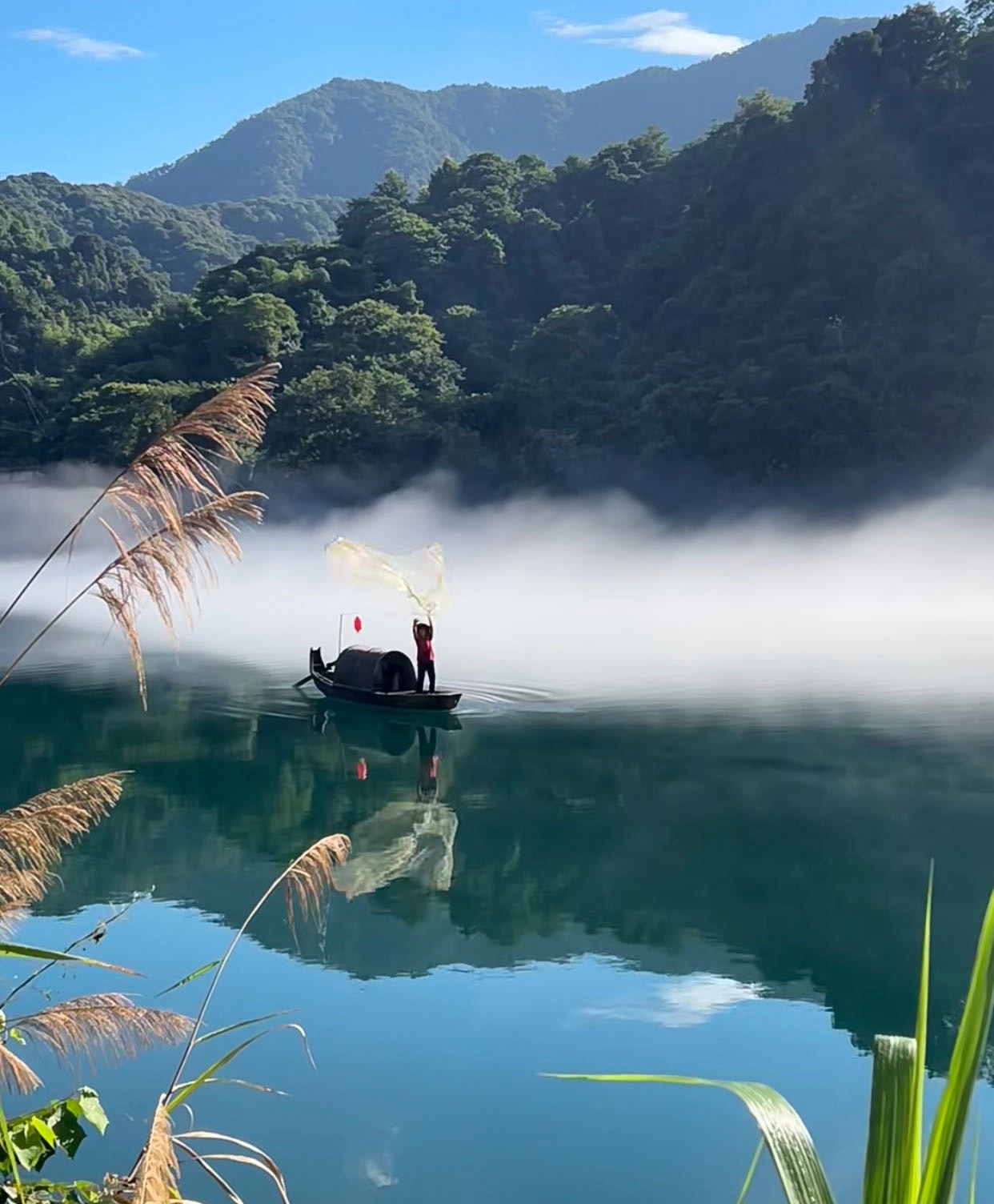 当晨光初破晓,小东江被一层轻纱般的雾气笼罩,整个世界都沉浸在一片神秘之中。湖面轻泛的涟漪,加上渔舟唱晚的画面,美得让人窒息。