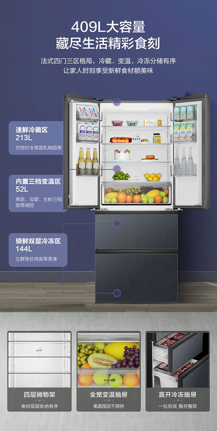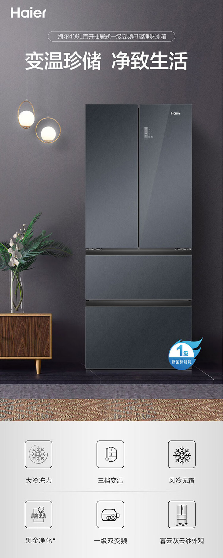 海尔(Haier)(202767 )冰箱法式多门一级能效智能双变频 钢化玻璃面板 风冷无霜电冰箱四门四开门 家用大容量 409升BCD-409WLHFD7DSR