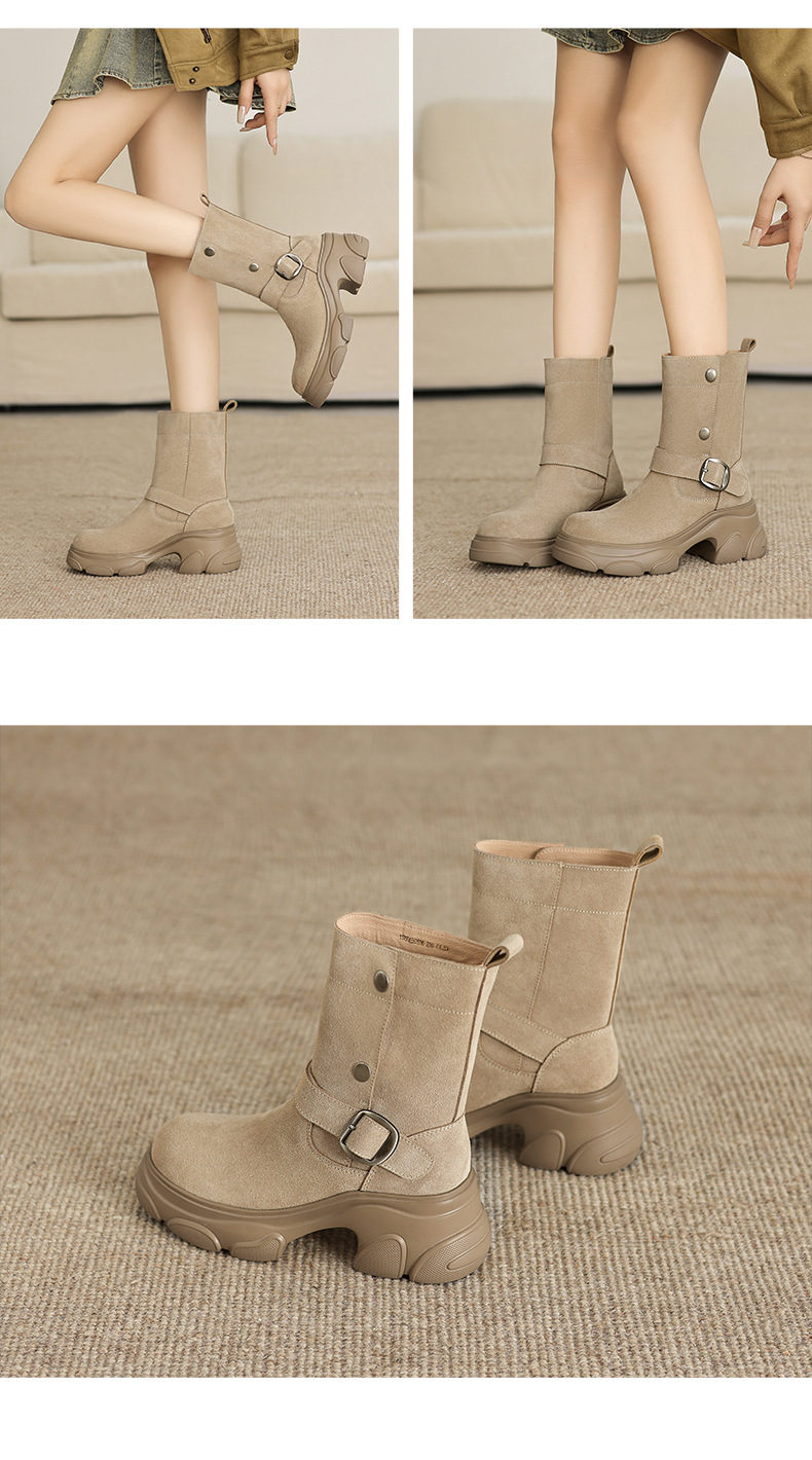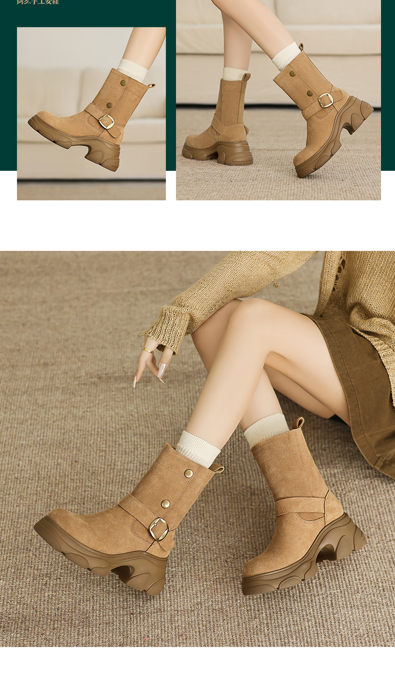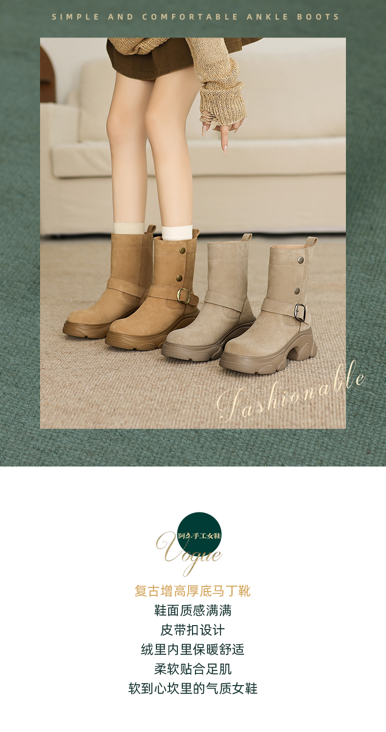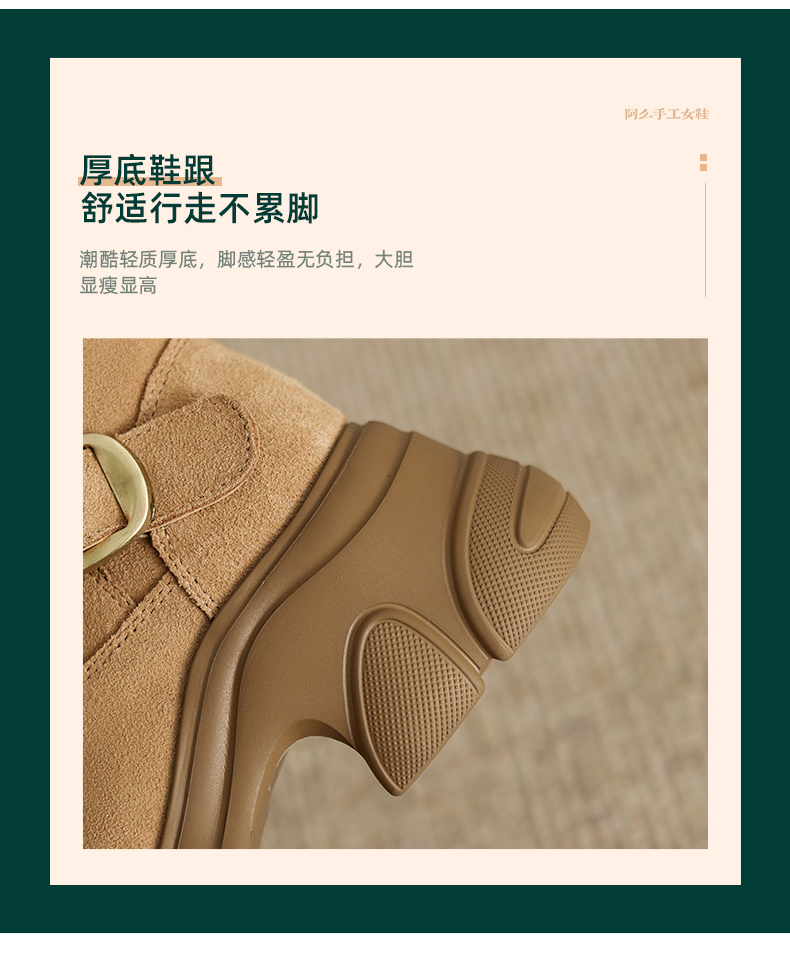 阿么手工女鞋超厚加绒【羊毛】小个子中筒靴子真皮时髦潮堆堆靴7CM