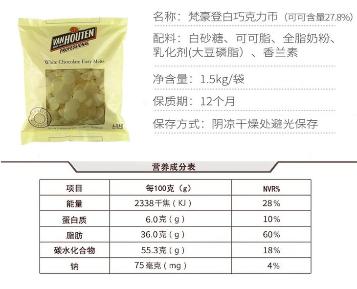 百乐嘉利宝梵豪登 【白巧克力币】 可可脂含量30.5%重量1.5kg