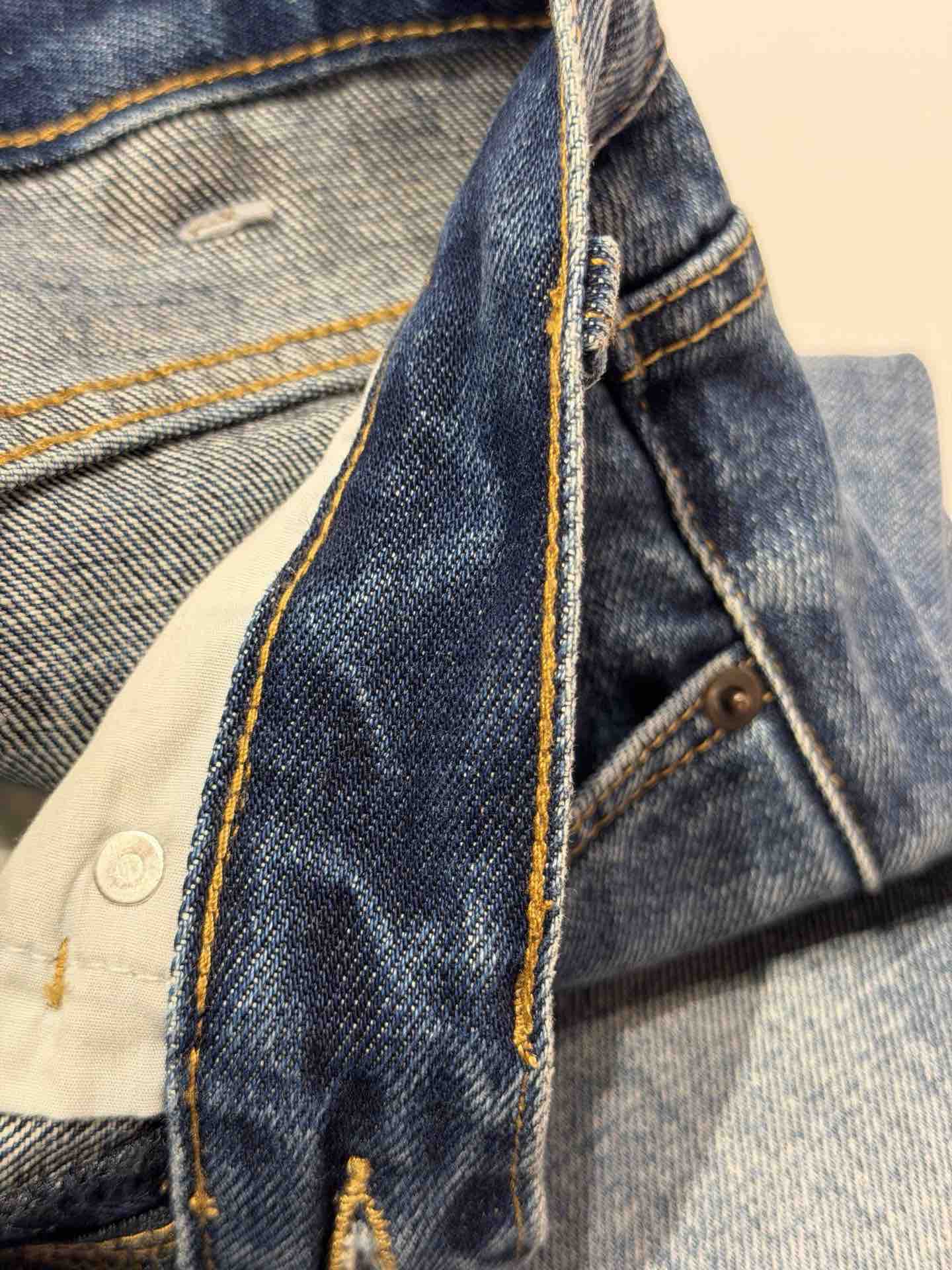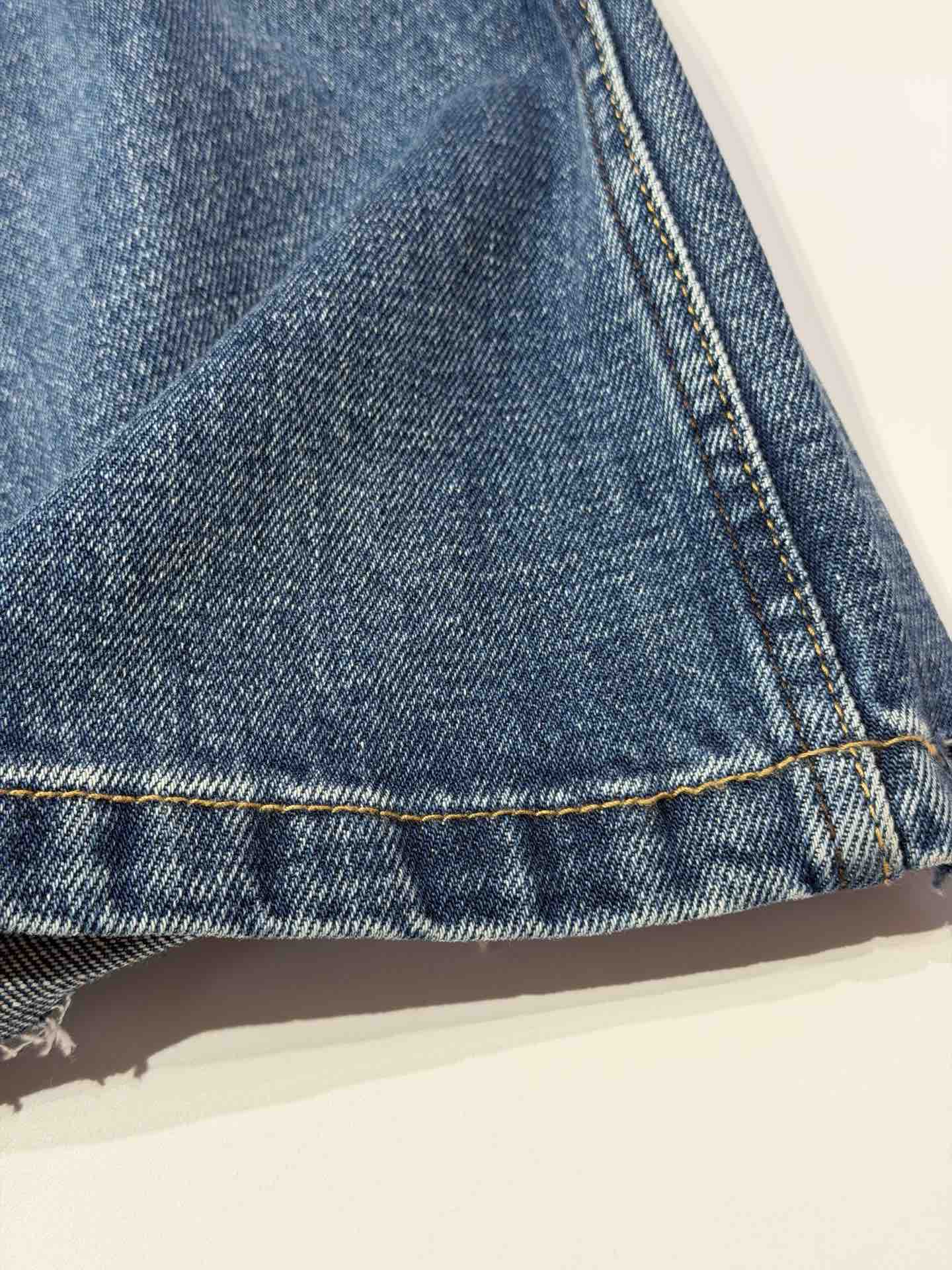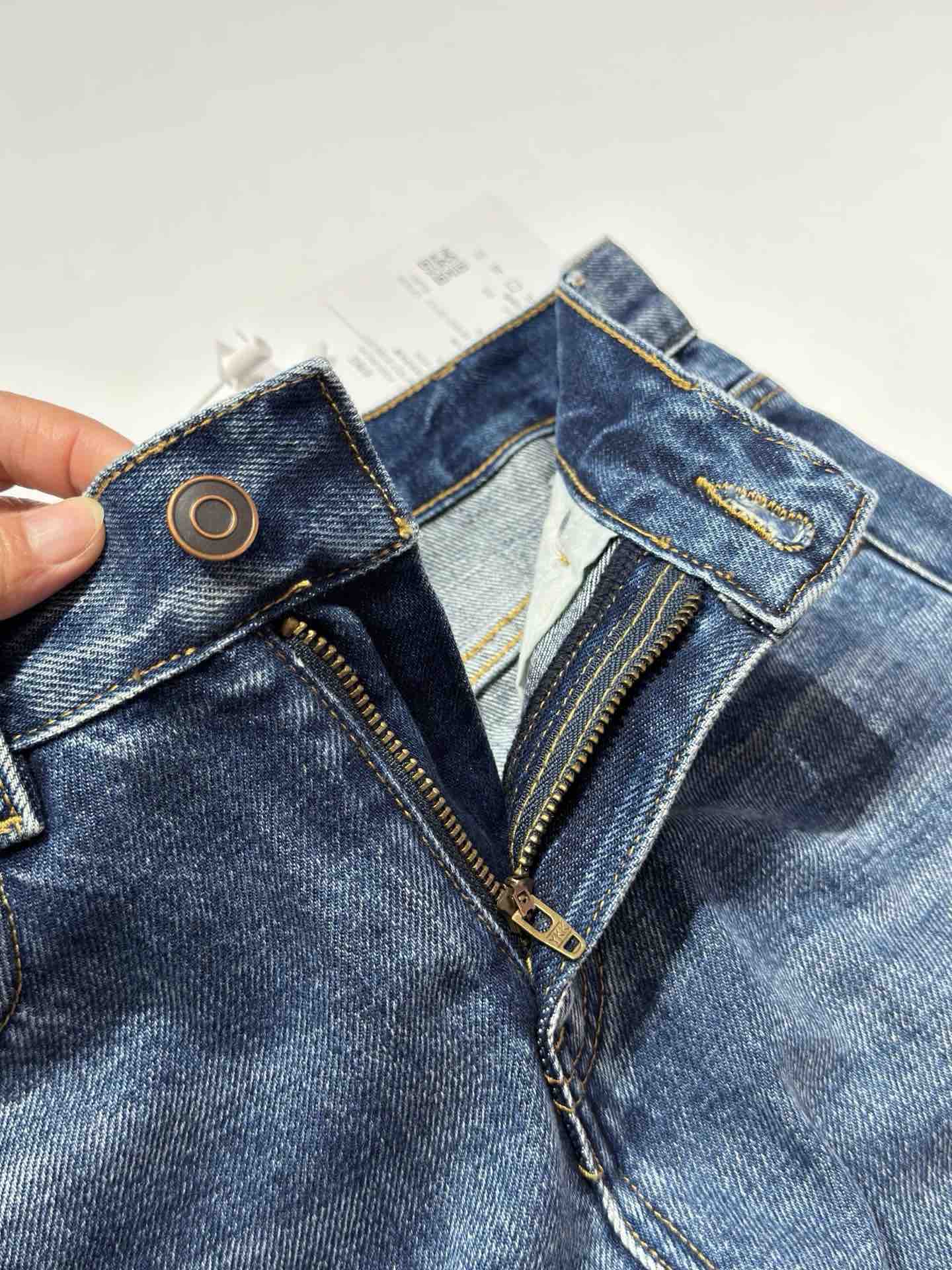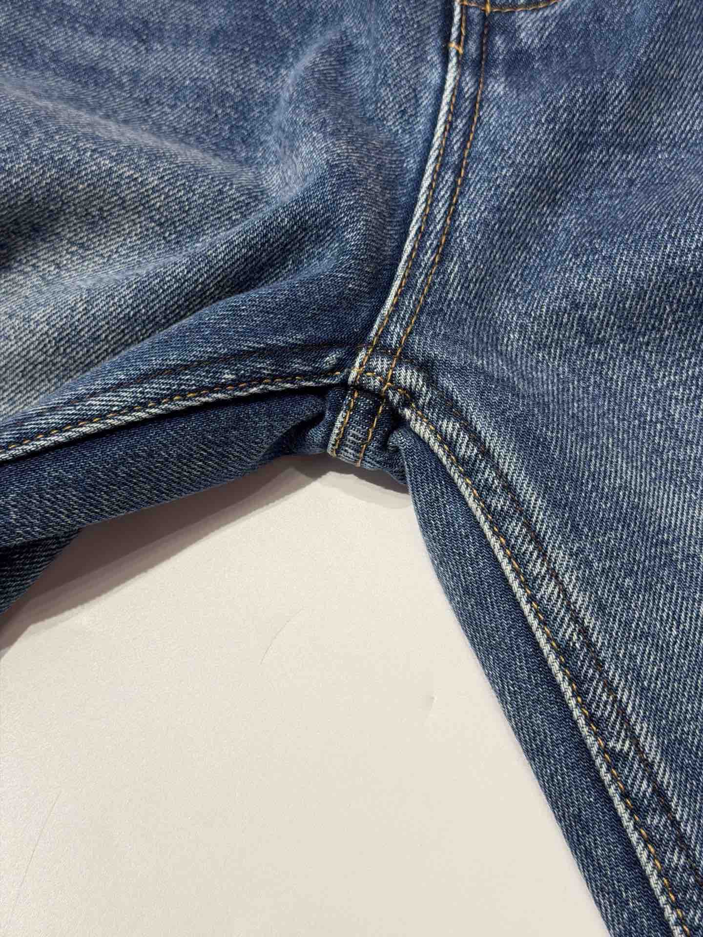 除了版型,面料是关键,经过三道水洗工艺,整条裤子的颜色呈现一种很漂亮的牛仔蓝颜色。而且大面积的磨白质感更好~