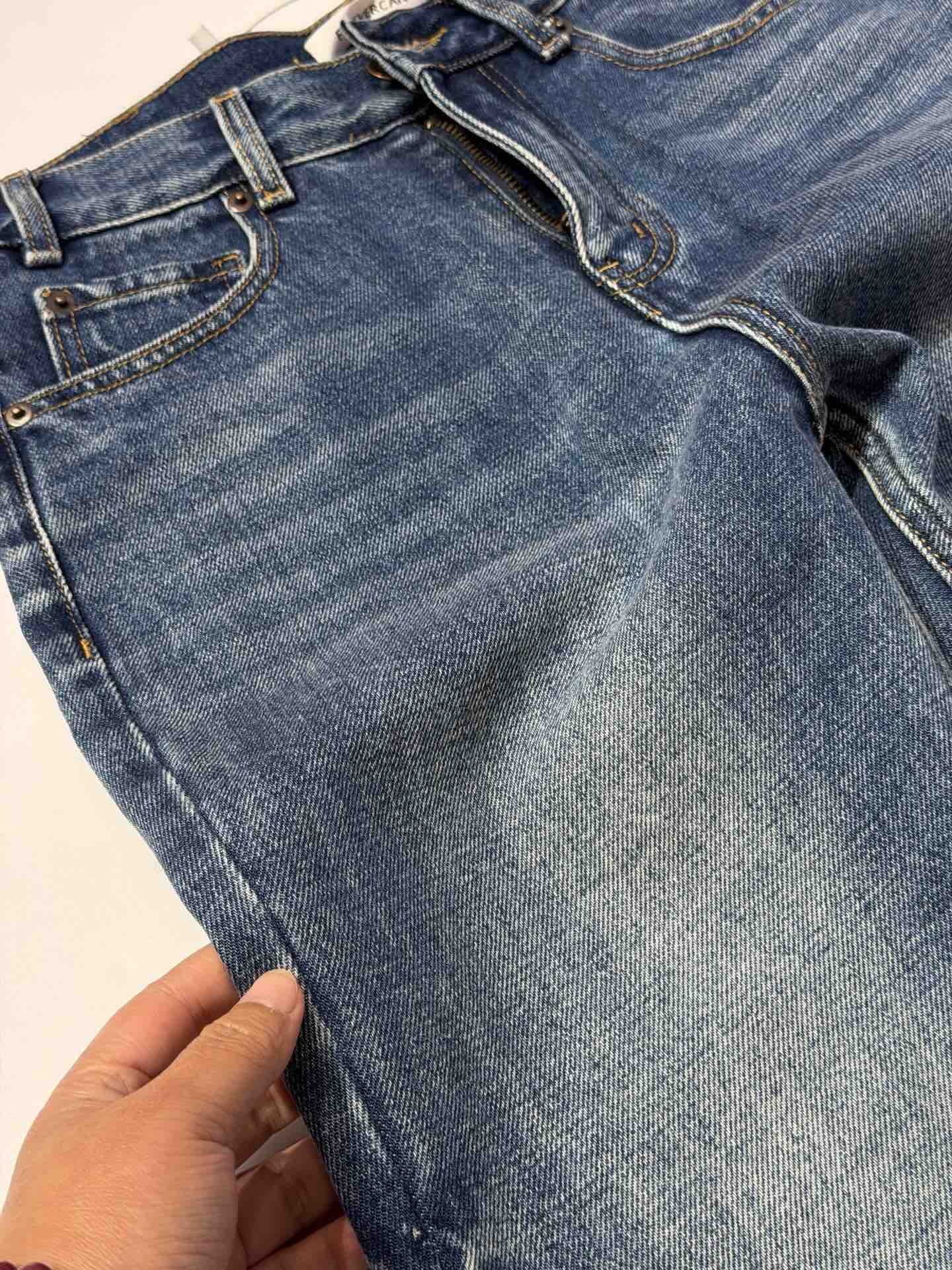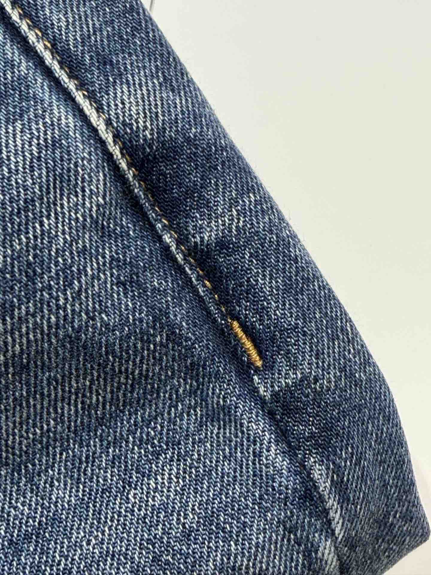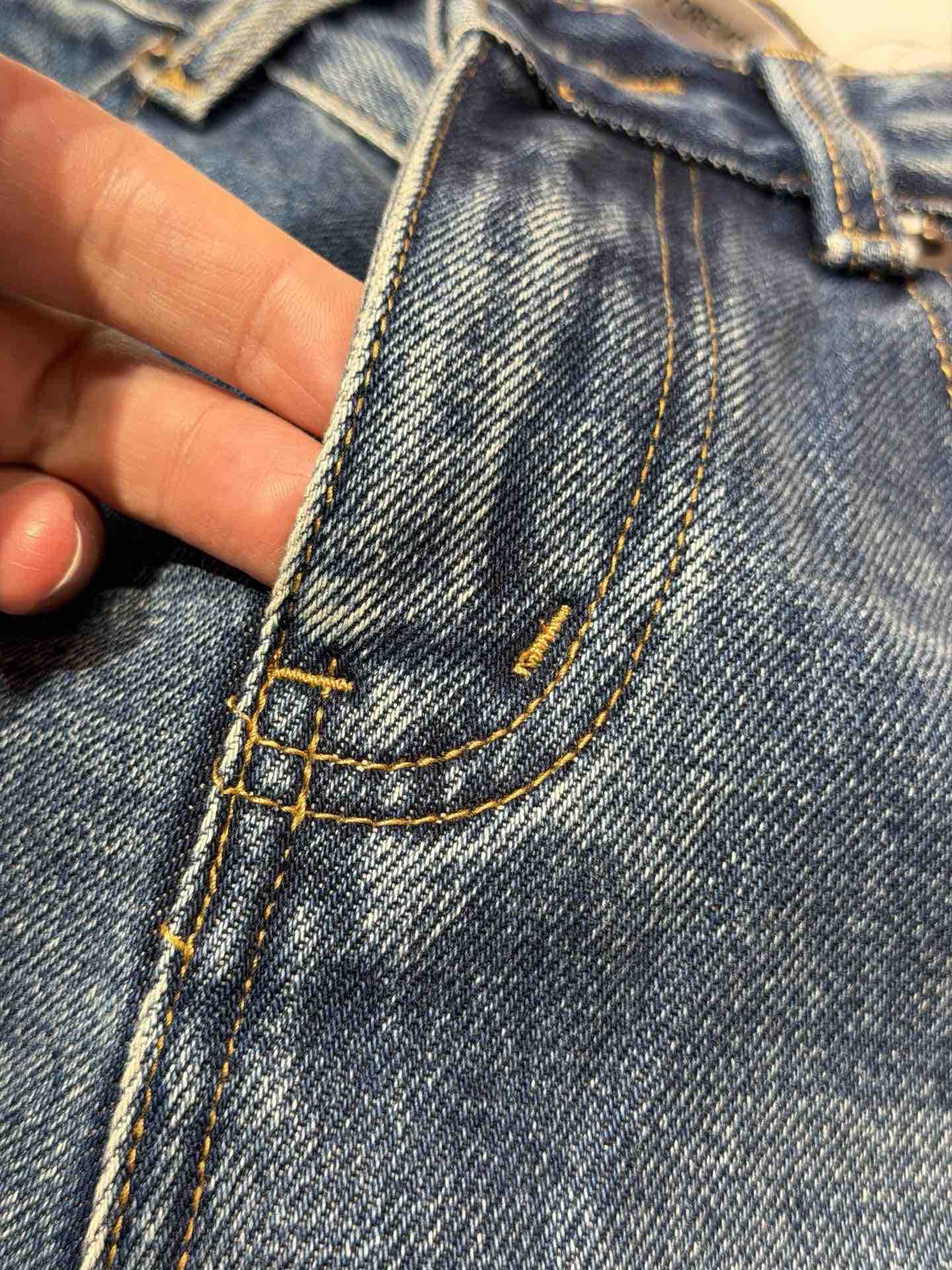 除了版型,面料是关键,经过三道水洗工艺,整条裤子的颜色呈现一种很漂亮的牛仔蓝颜色。而且大面积的磨白质感更好~