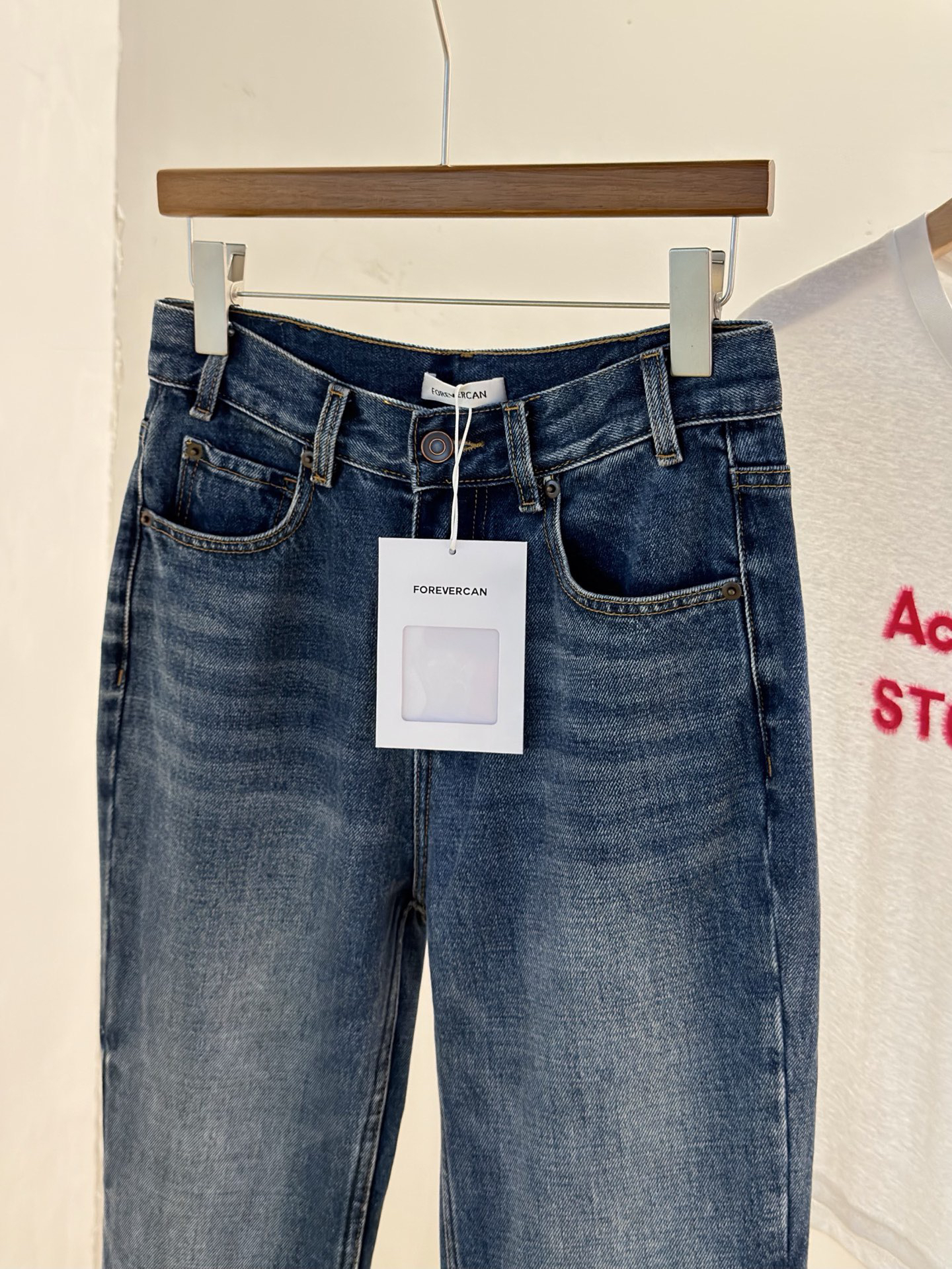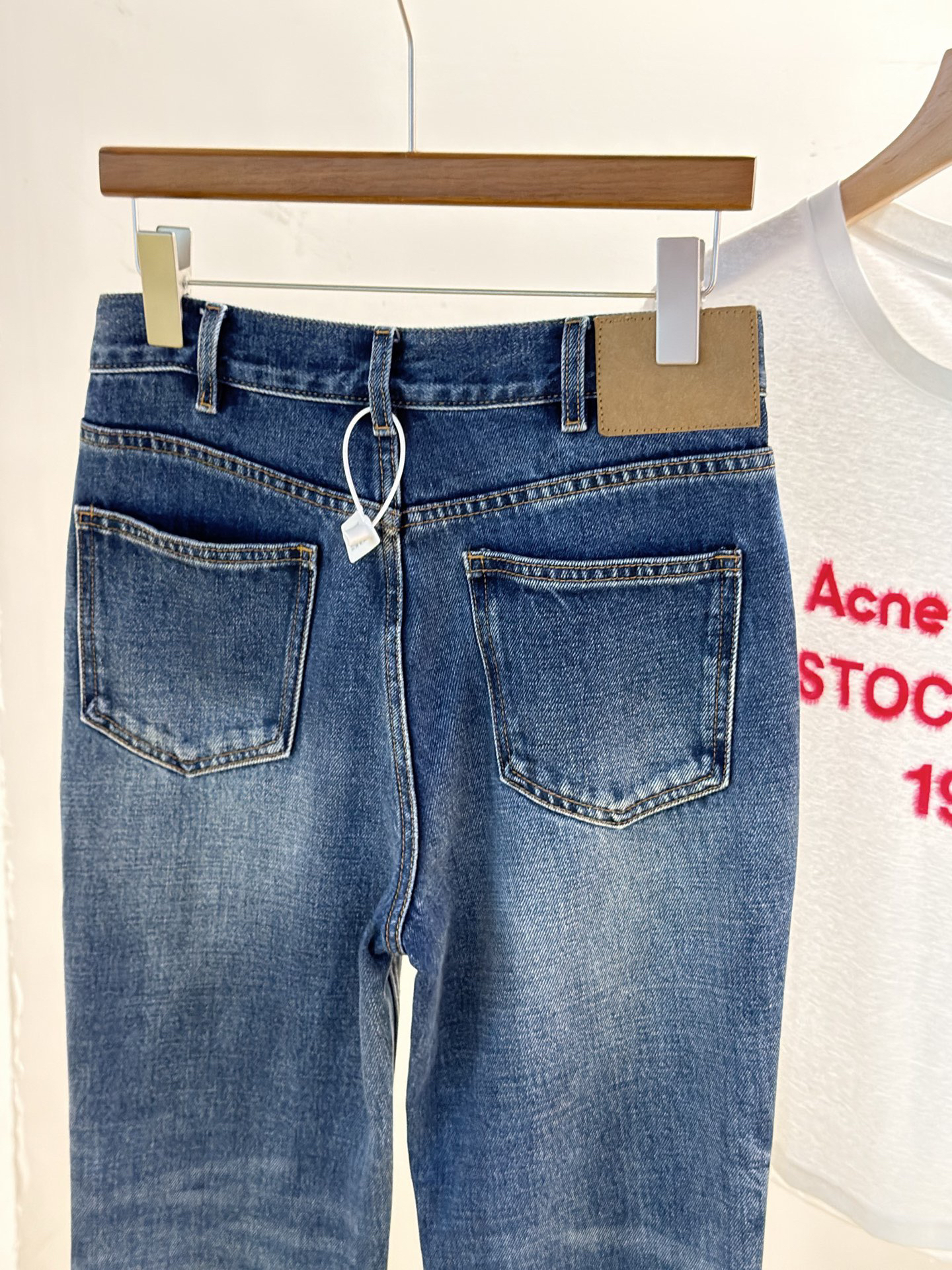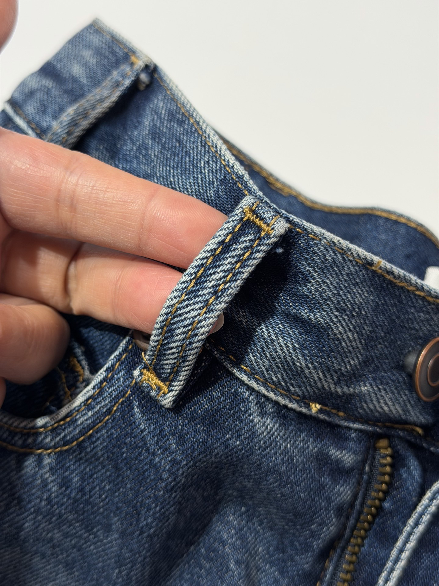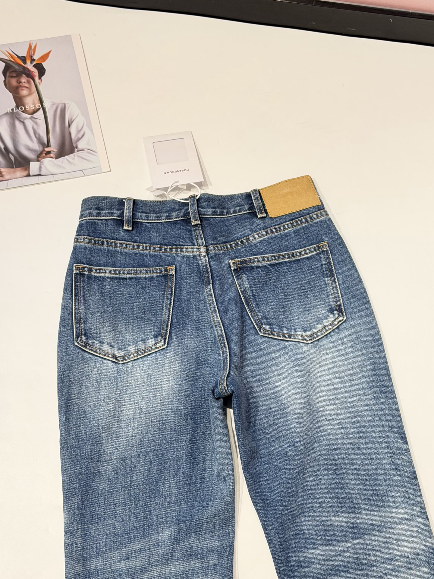 除了版型,面料是关键,经过三道水洗工艺,整条裤子的颜色呈现一种很漂亮的牛仔蓝颜色。而且大面积的磨白质感更好~