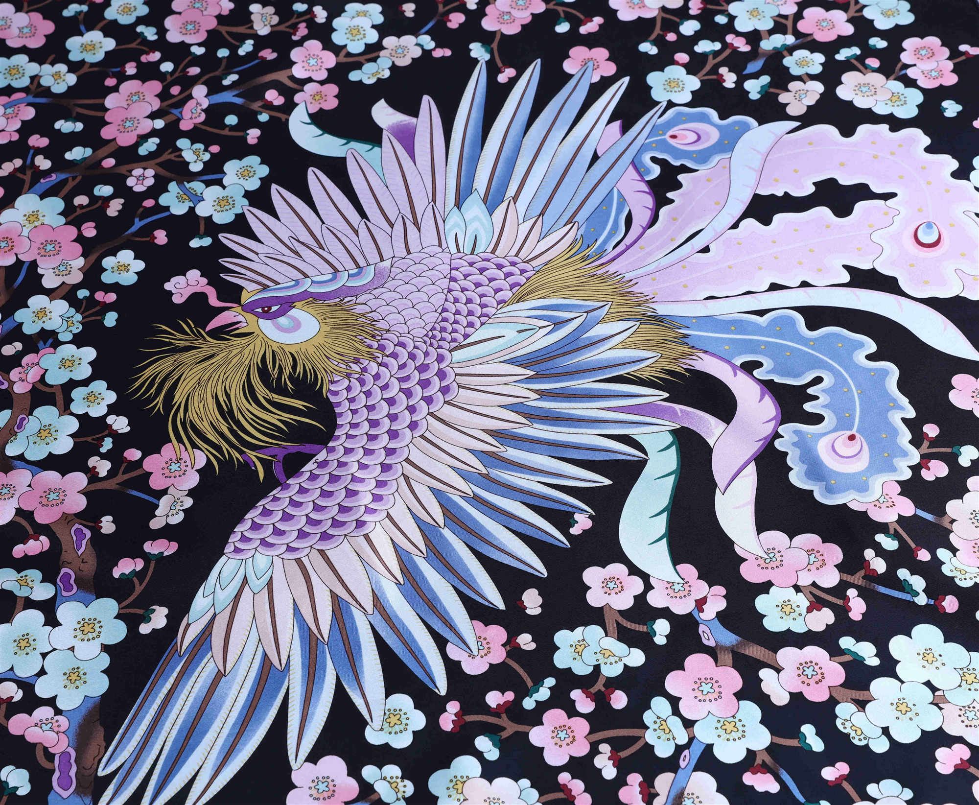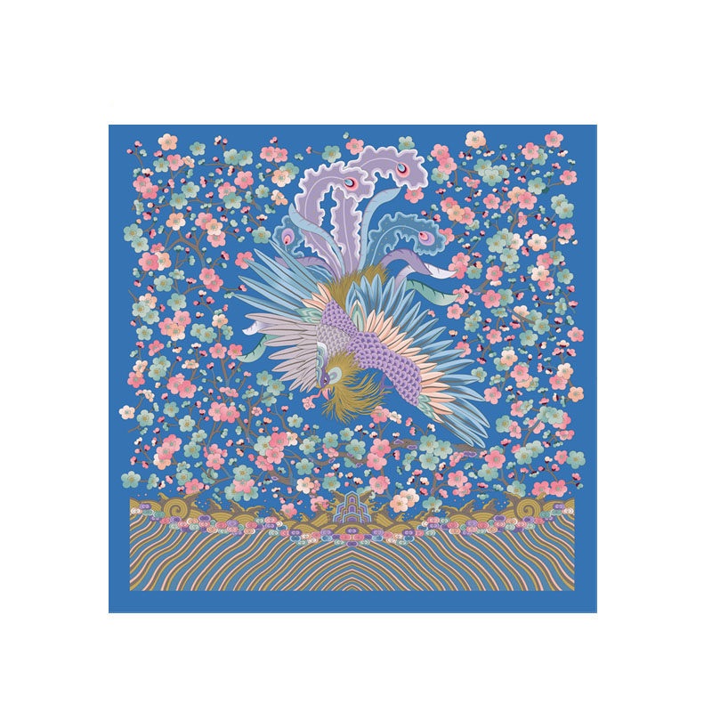 梅花大凤灵感源自故宫藏品"月白缂丝凤梅花灰鼠披氅衣",以七彩凤凰为主体图案,四周环绕梅花,风格清新秀丽,疏梅横斜绕以象征长寿的团寿字,是中国传统经典图案。