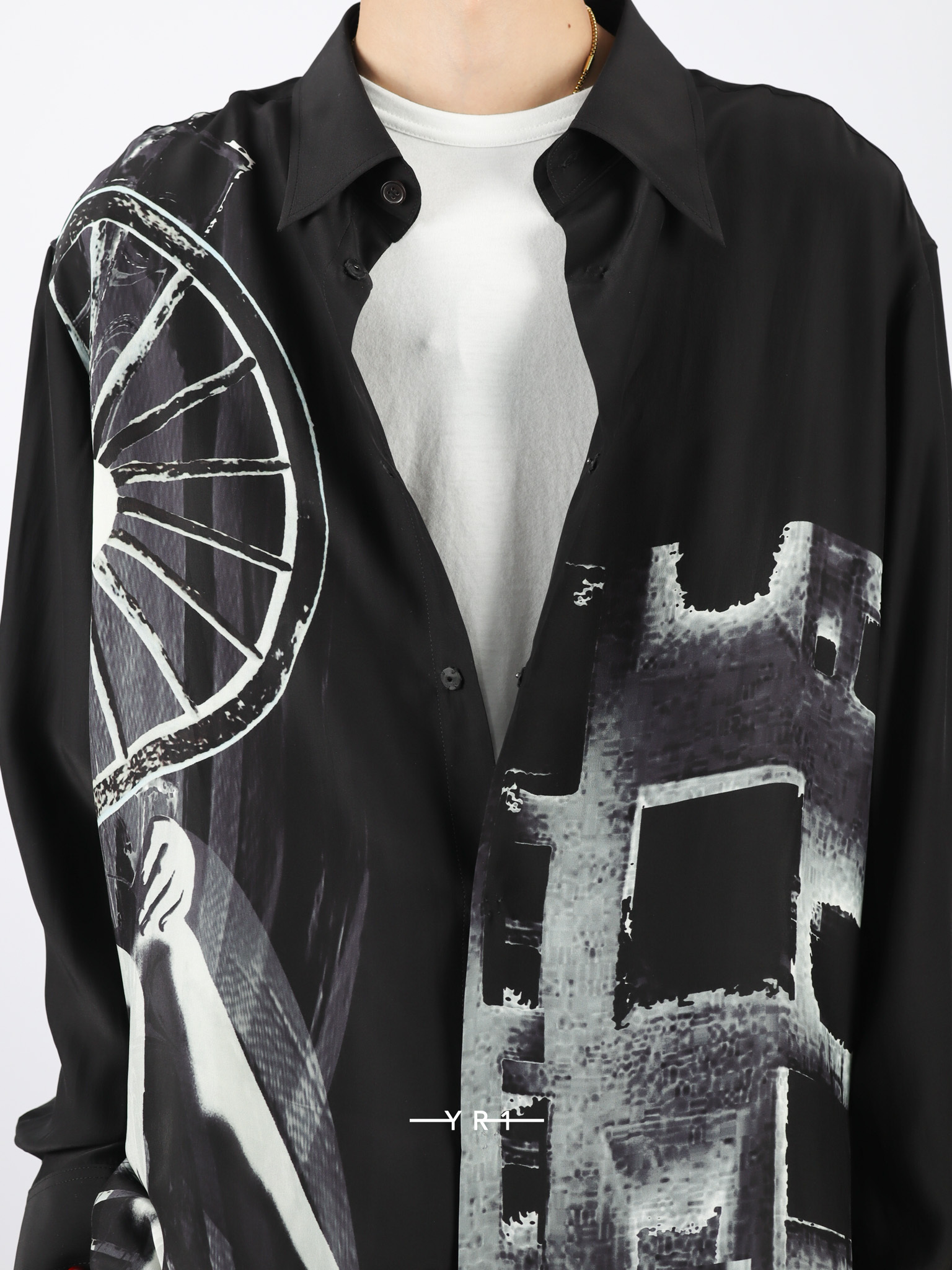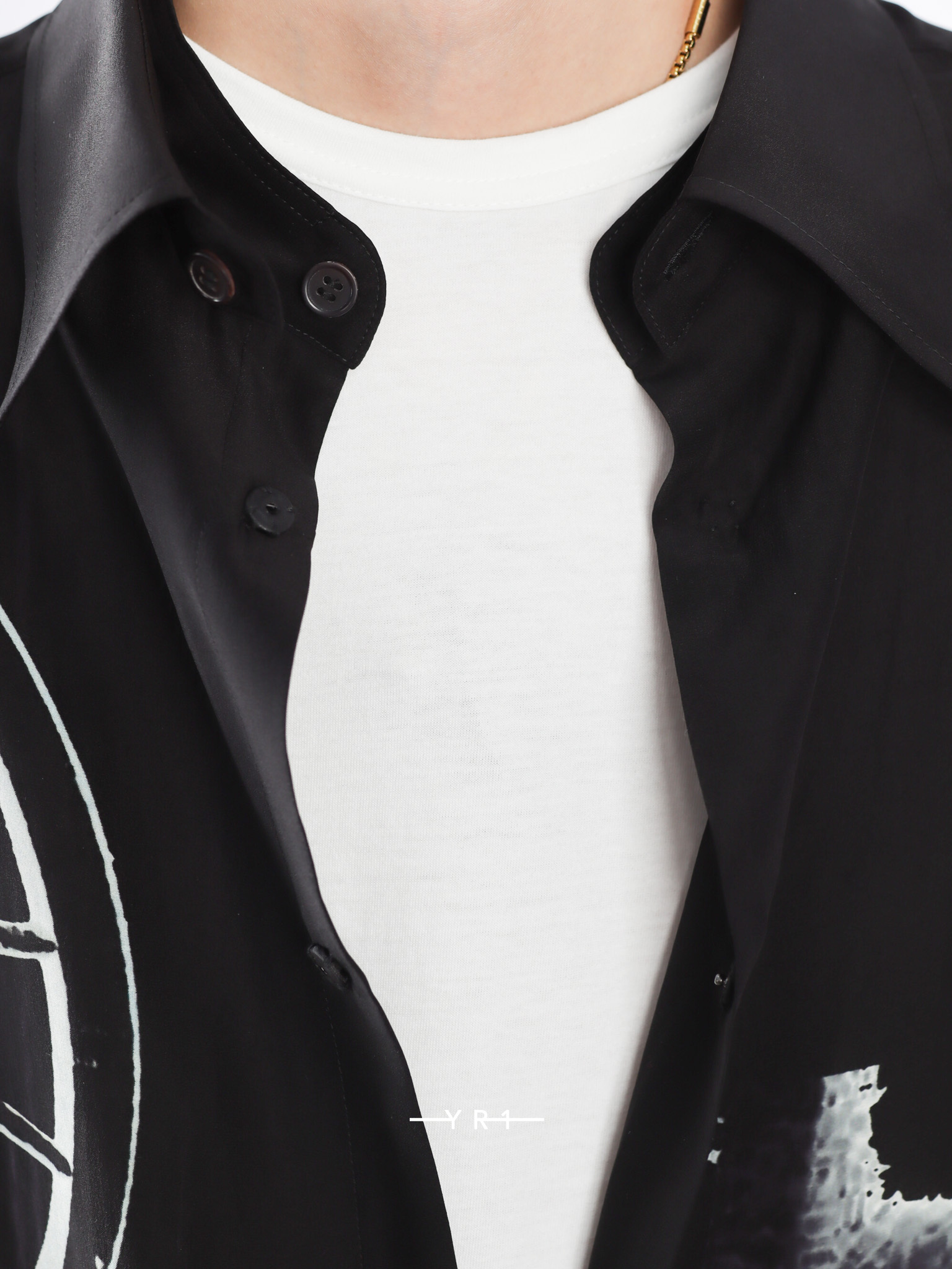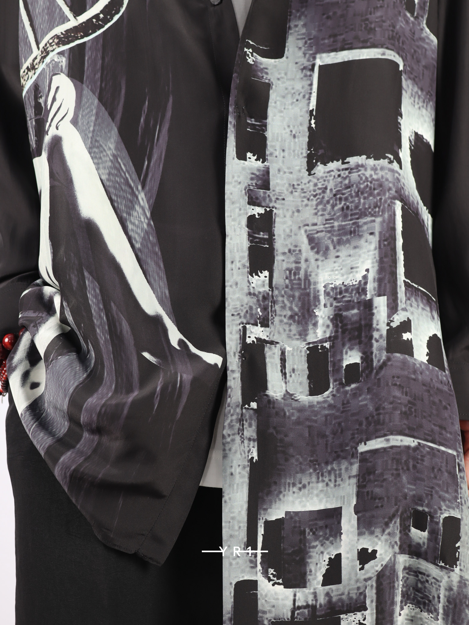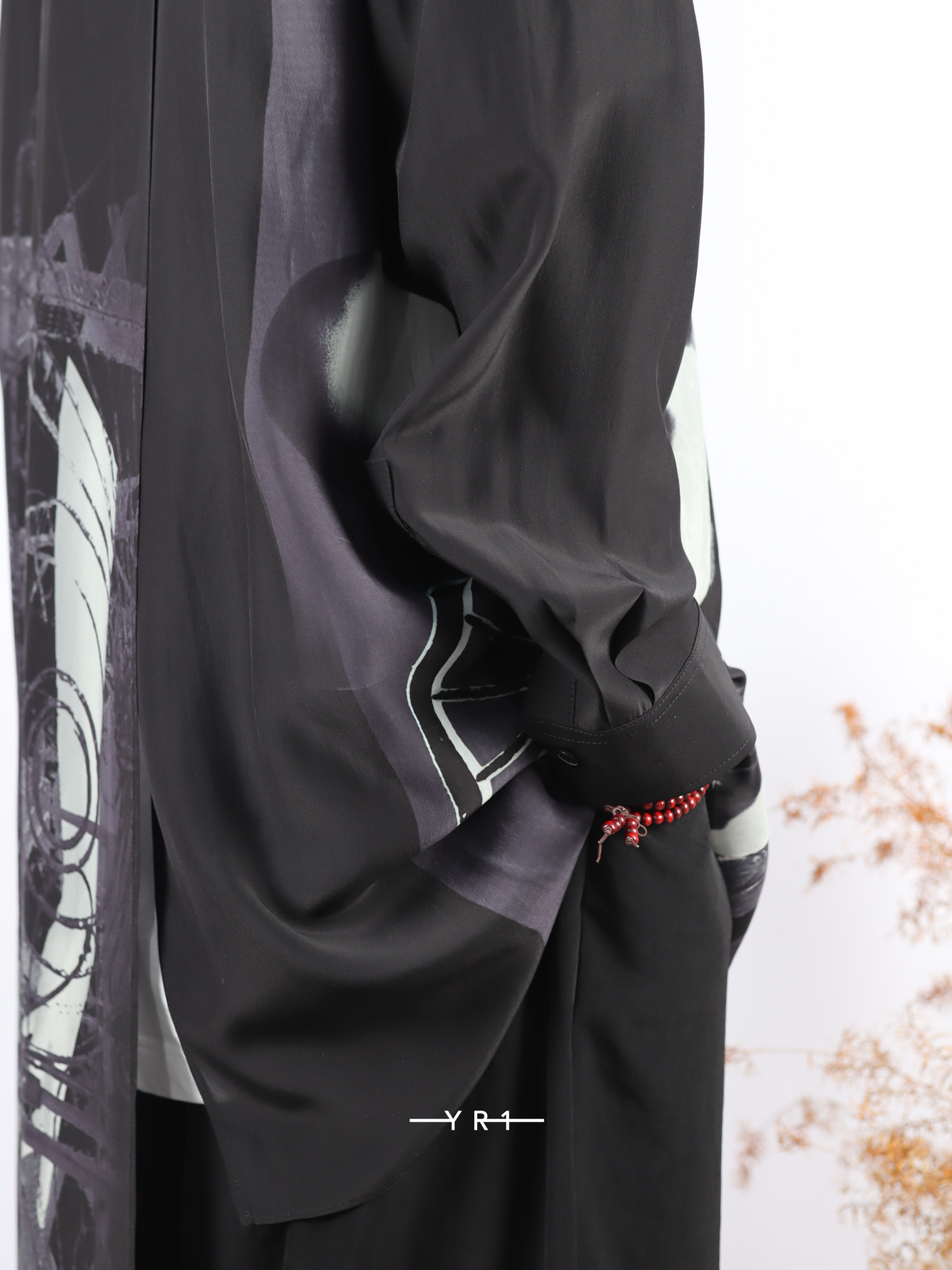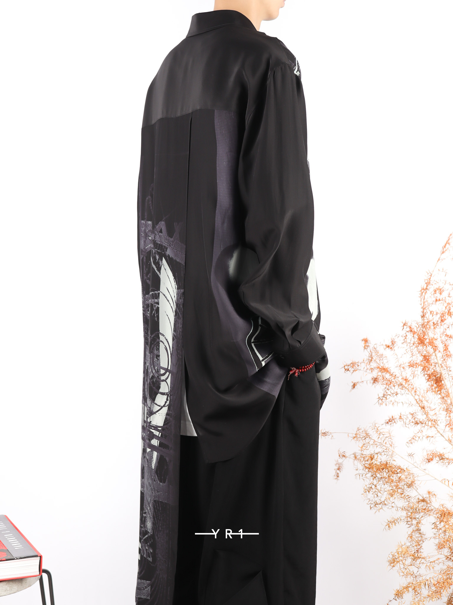 Yohji Yamamoto POUR HOMME 2025 春夏系列第 9 款不对称衬衫,以独特的垂坠感彰显奢华。采用 12 姆米丝缎制成,确保了高级光泽和柔和触感。这种材料展示了原创设计,在京都工厂喷墨打印,将传统工艺与现代时尚融为一体