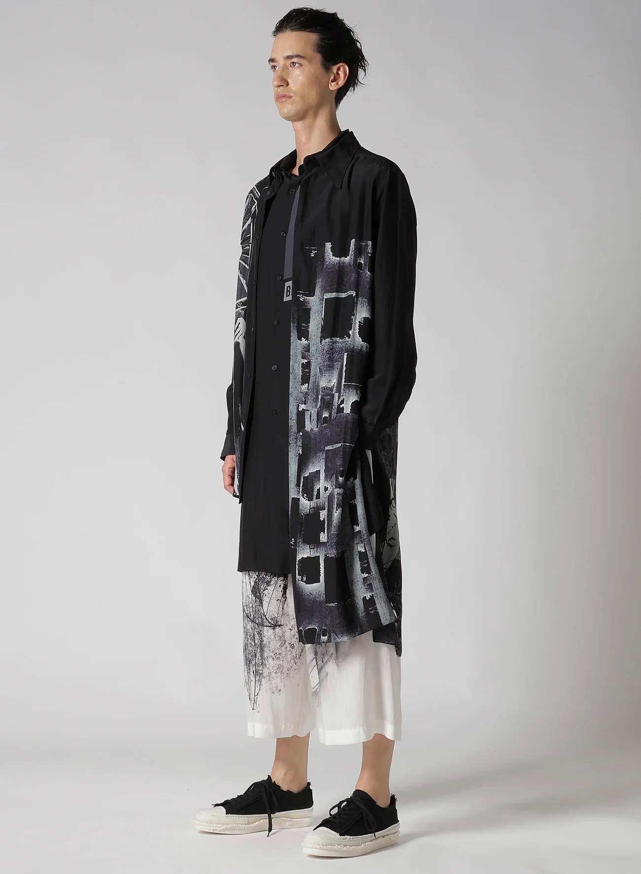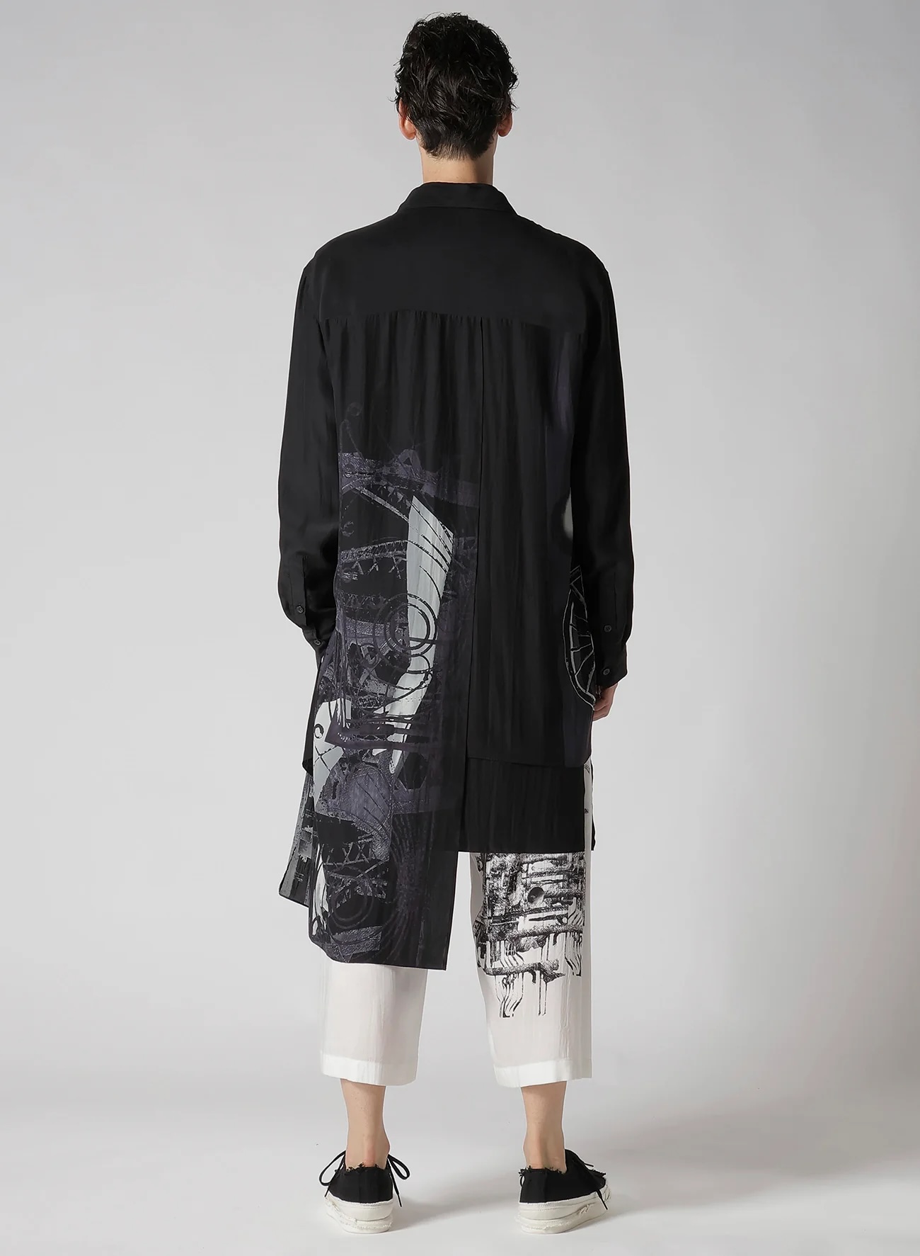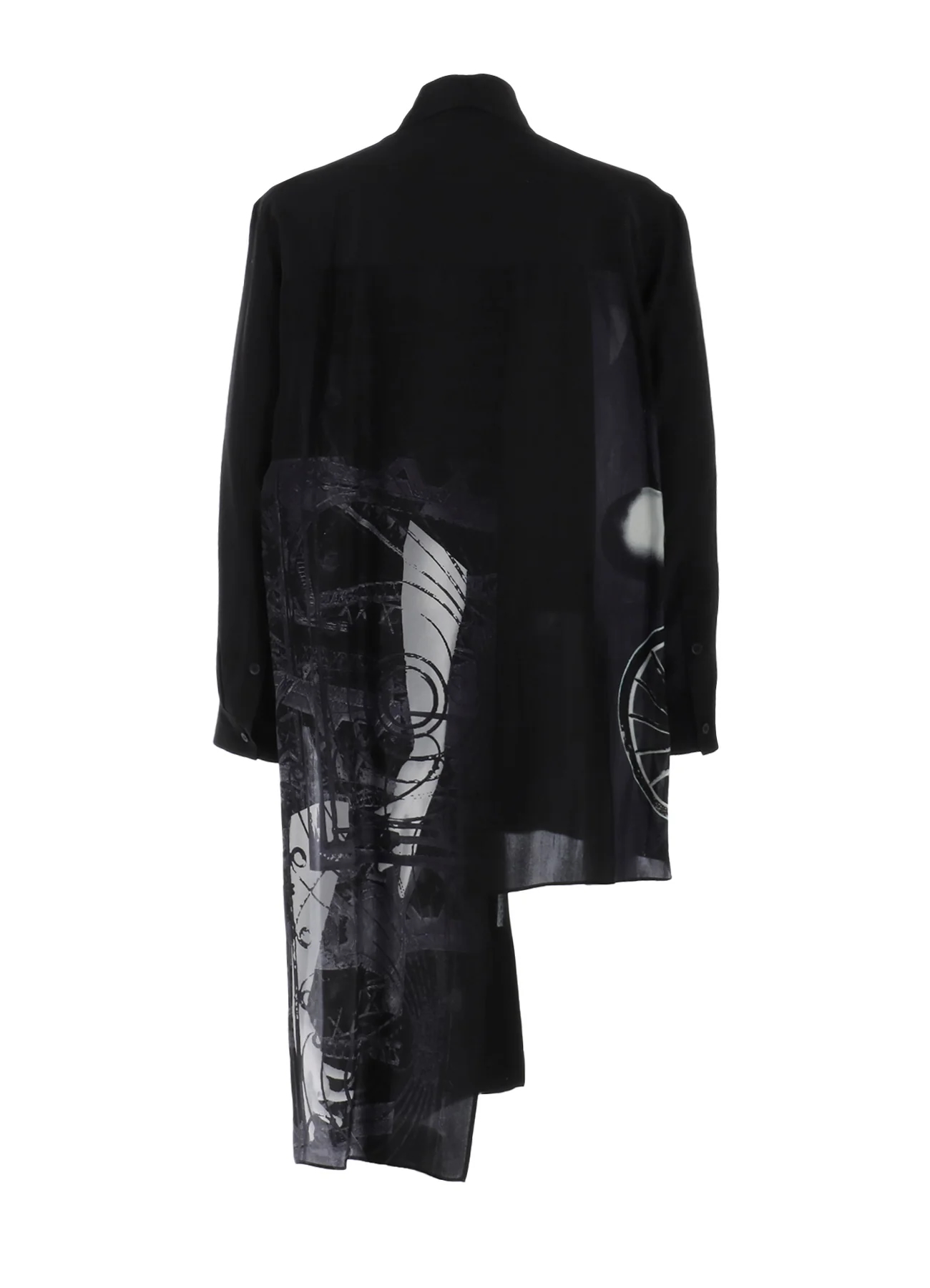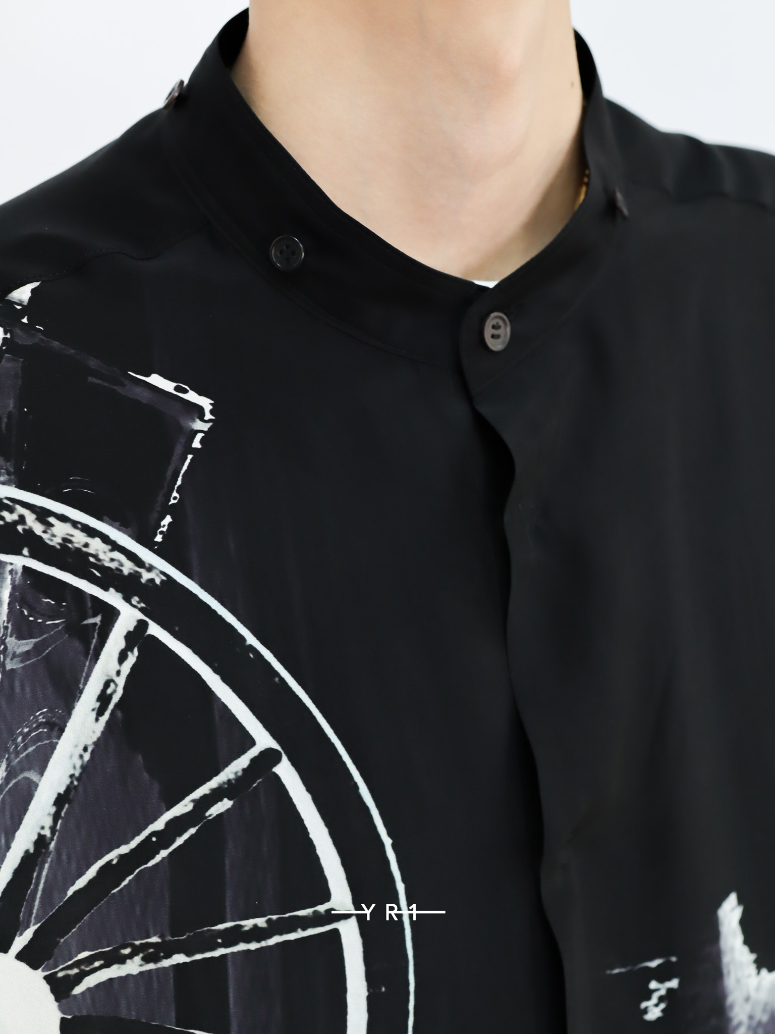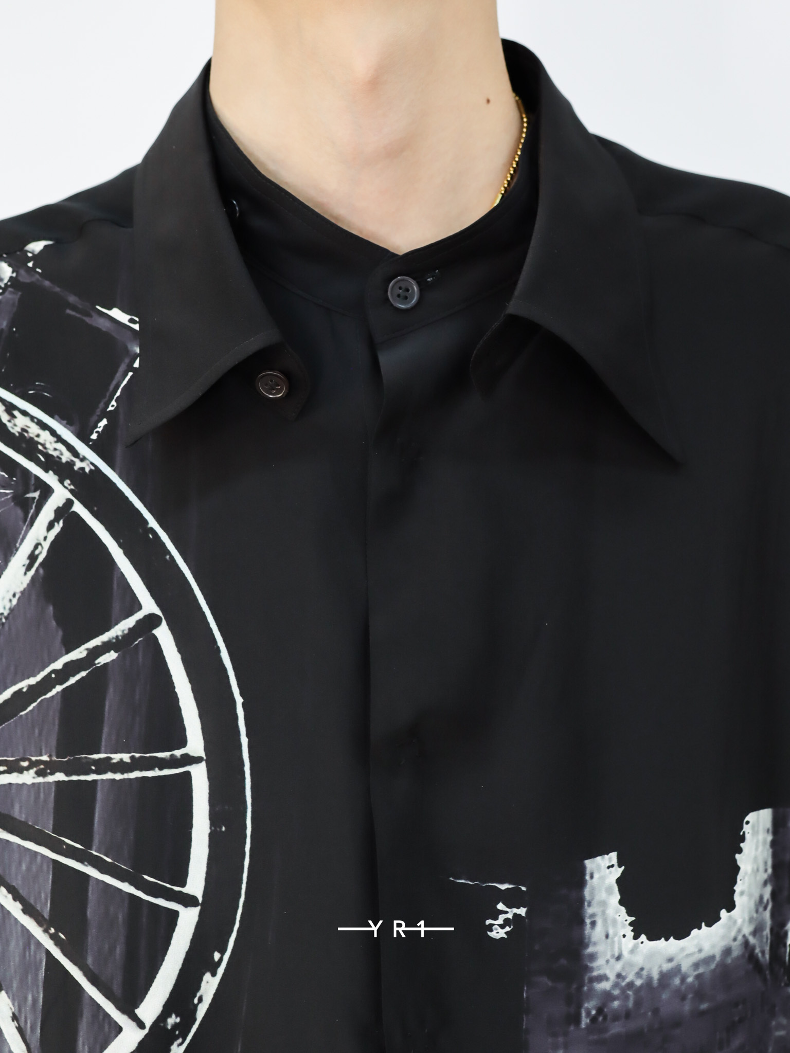 Yohji Yamamoto POUR HOMME 2025 春夏系列第 9 款不对称衬衫,以独特的垂坠感彰显奢华。采用 12 姆米丝缎制成,确保了高级光泽和柔和触感。这种材料展示了原创设计,在京都工厂喷墨打印,将传统工艺与现代时尚融为一体