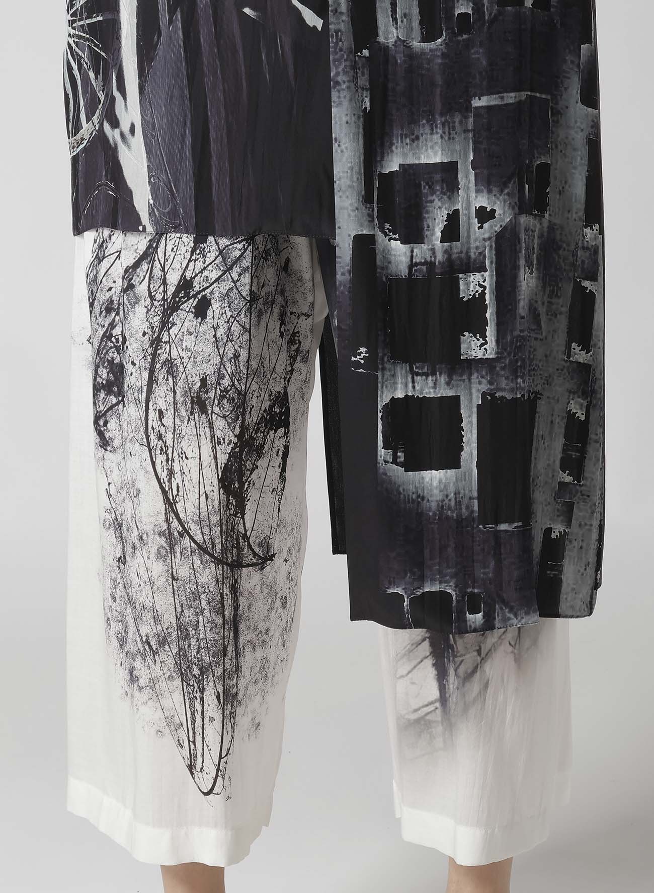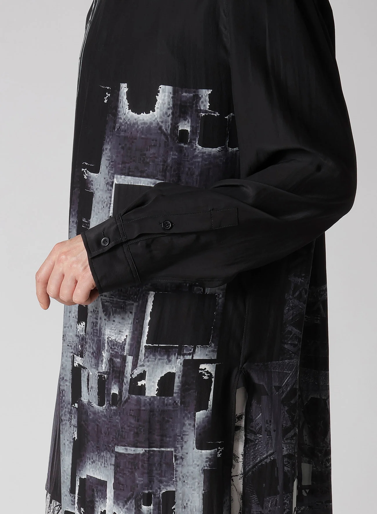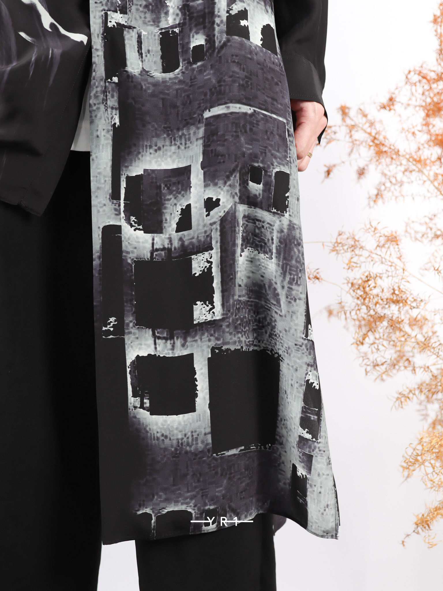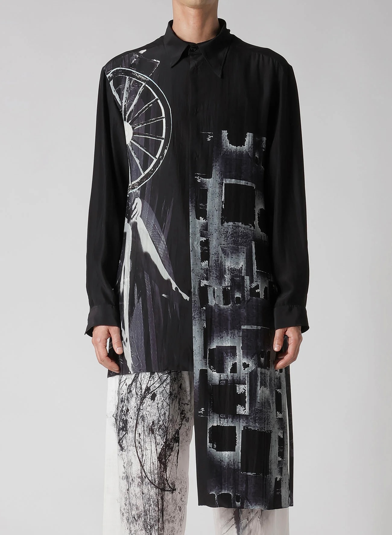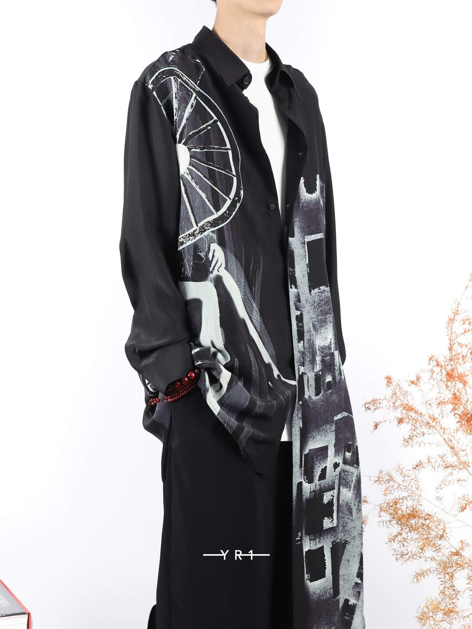 Yohji Yamamoto POUR HOMME 2025 春夏系列第 9 款不对称衬衫,以独特的垂坠感彰显奢华。采用 12 姆米丝缎制成,确保了高级光泽和柔和触感。这种材料展示了原创设计,在京都工厂喷墨打印,将传统工艺与现代时尚融为一体