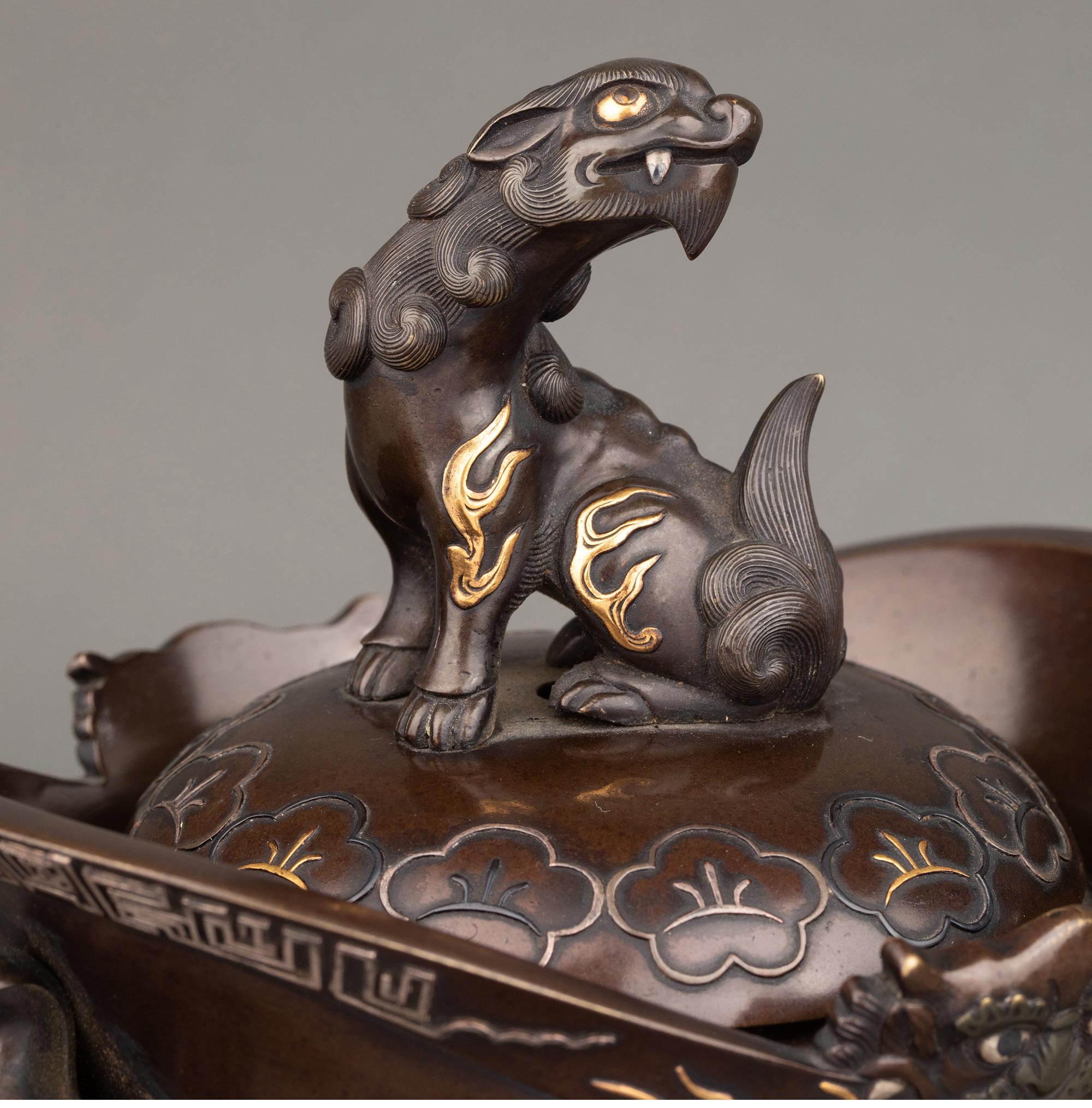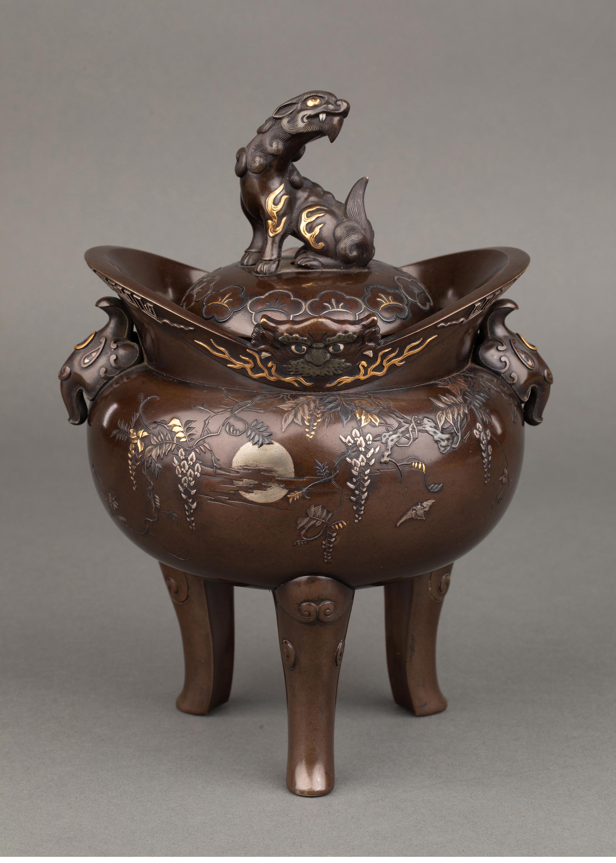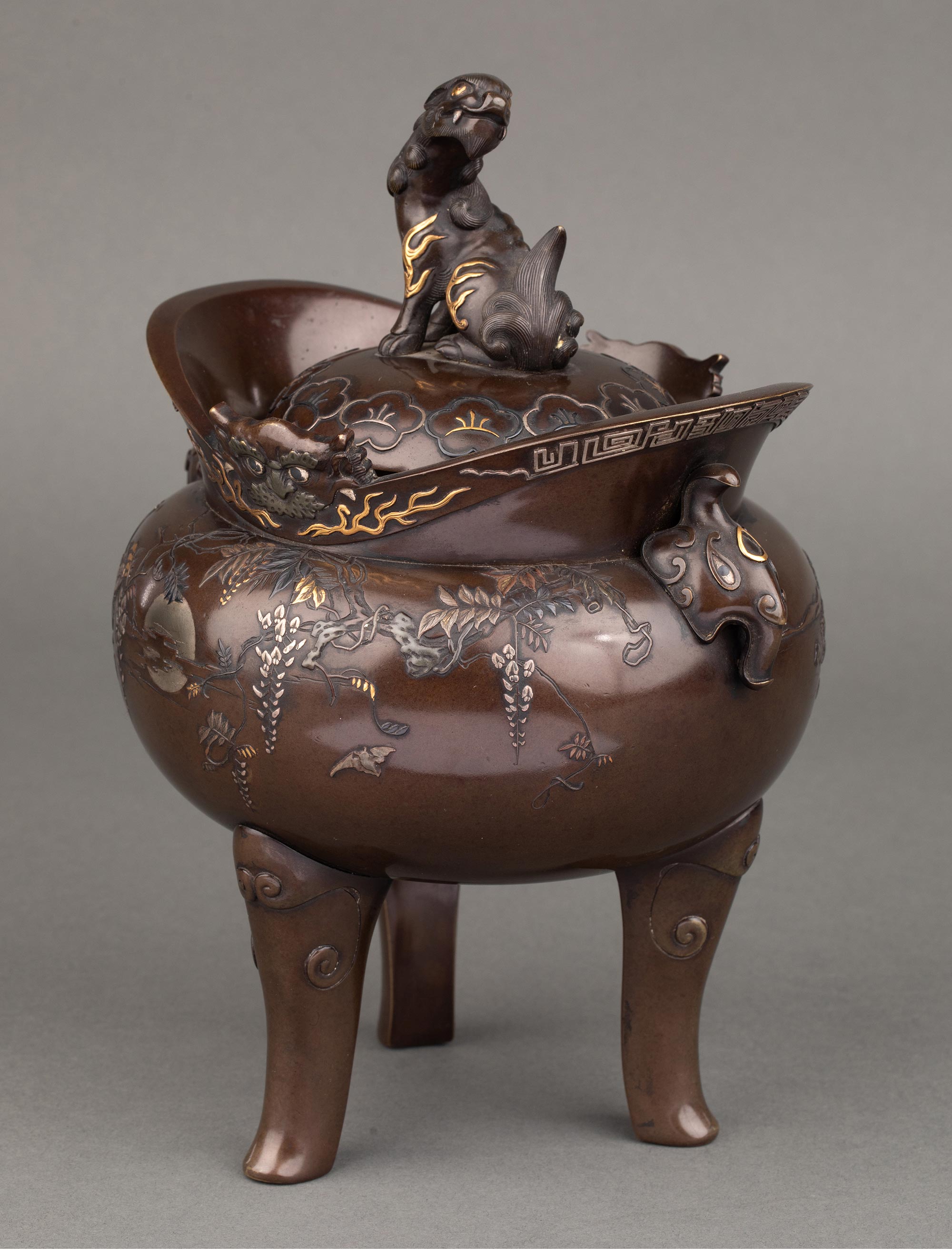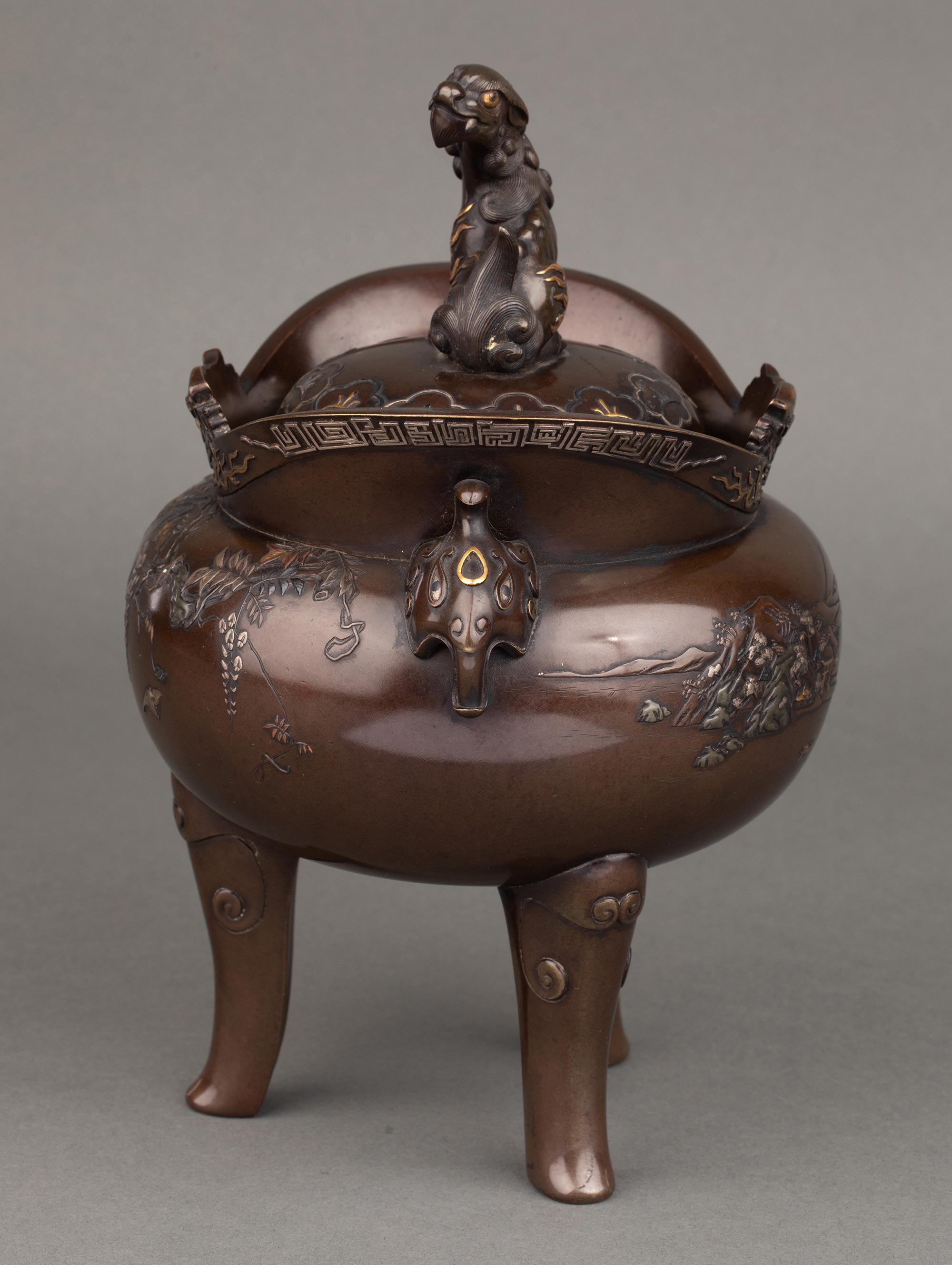 1880年代日本明治时期出品山水主题镀金银精雕装饰麒麟顶盖及祥纹三足底座赤铜香炉
