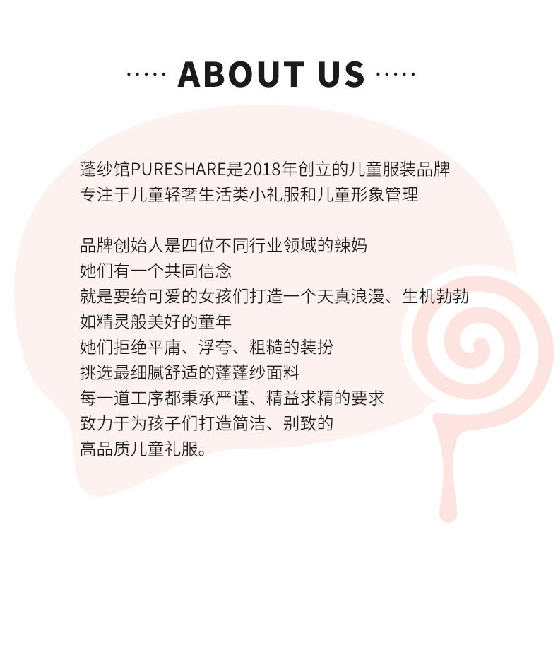 - PureShare蓬纱馆,2018年创立的儿童服装品牌,专注于儿童轻奢生活类小礼服,主张“让孩子做最独特的自己”的品牌理念,为孩子们提供时尚简洁、优雅而又不失童真的生活类礼服。