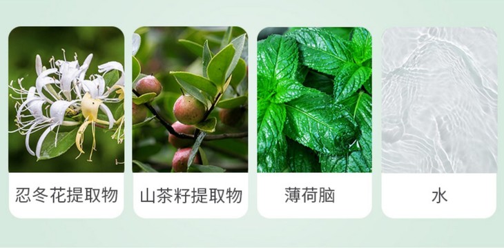 选用薄荷脑、忍冬花提取物、山茶籽提取物等;