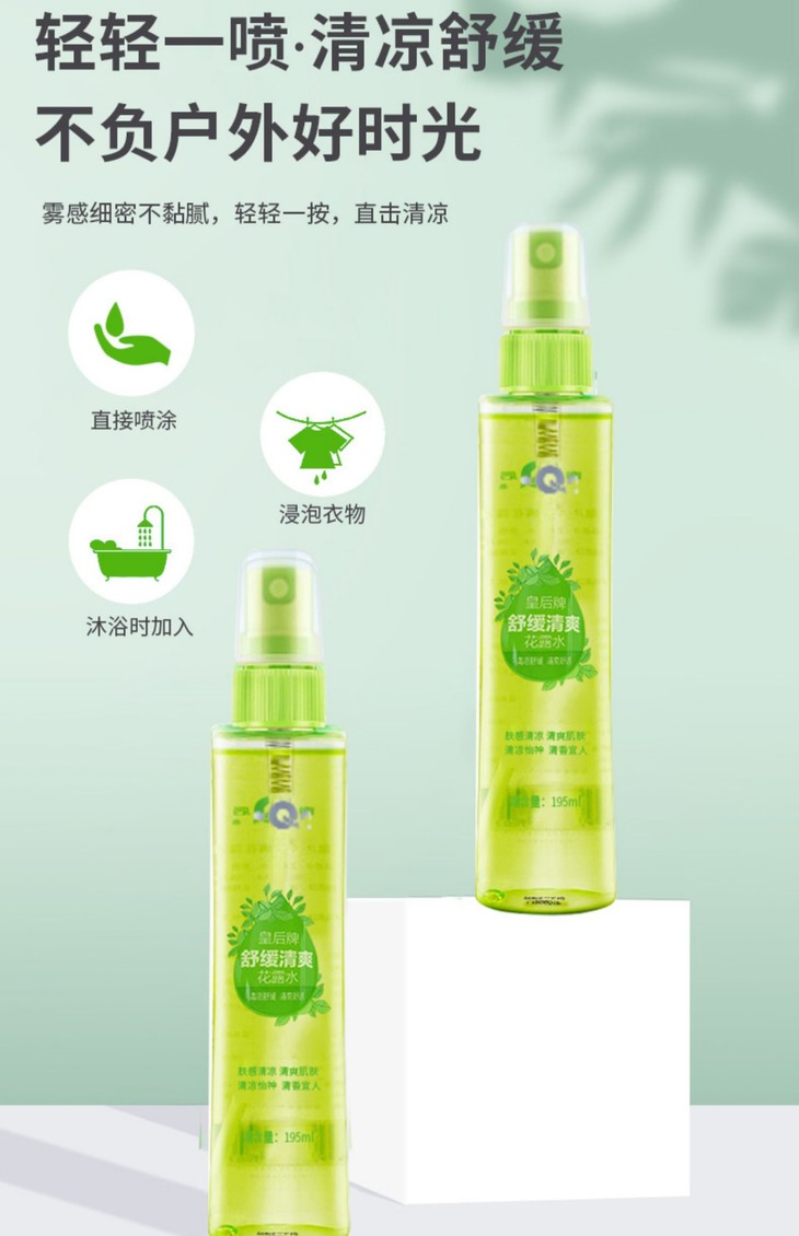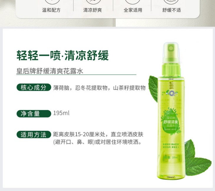 温和配方,雾感细密不粘腻,清凉舒爽,舒缓肌肤不适;