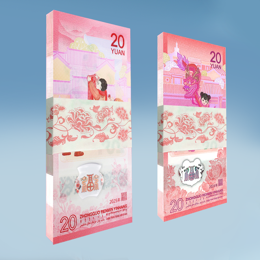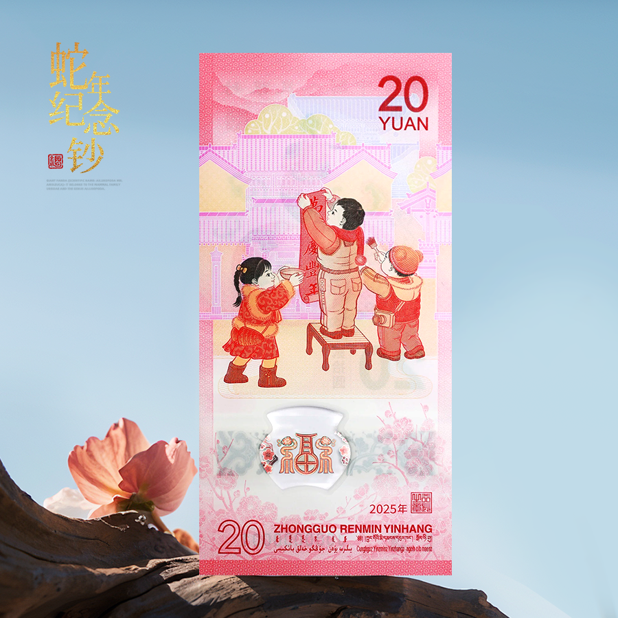 纪念钞背面主景为儿童贴春联图案,辅以山西民居装饰图案,上方为面额数字“20”、汉语拼音字母“YUAN”,下方为花卉与动感全息图案、年号“2025年”、行长章、面额数字“20”、“中国人民银行”汉语拼音和蒙、藏、维、壮四种民族文字的“中国人民银行 贰拾圆”字样。