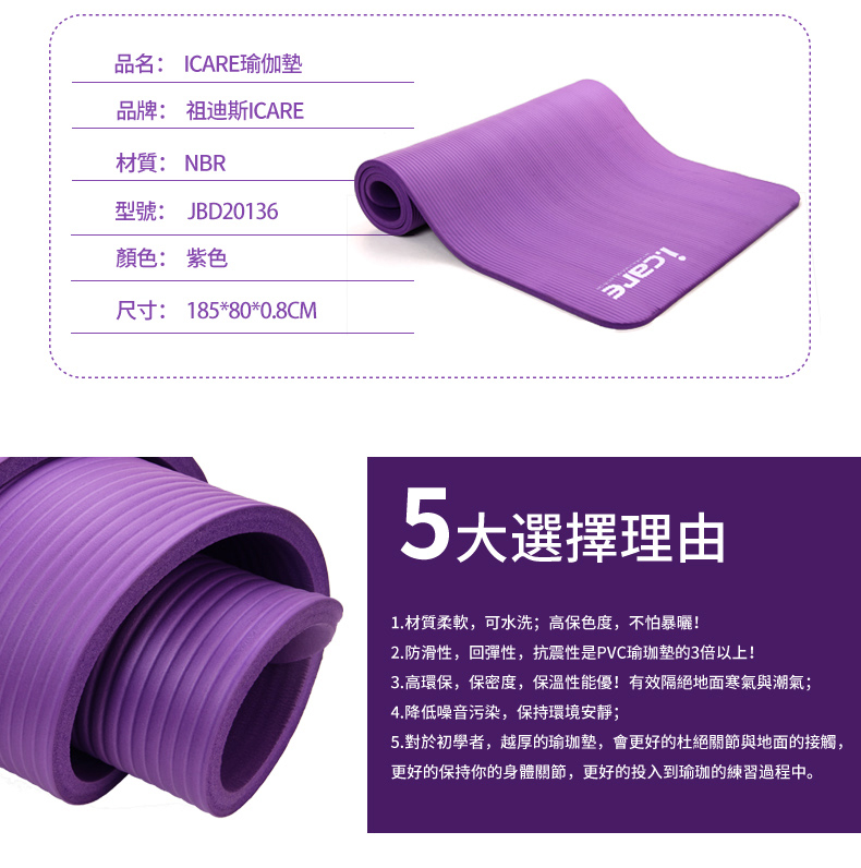 麦斯卡祖迪斯icareNBR瑜伽垫185*80*0.8(紫)JBD20136