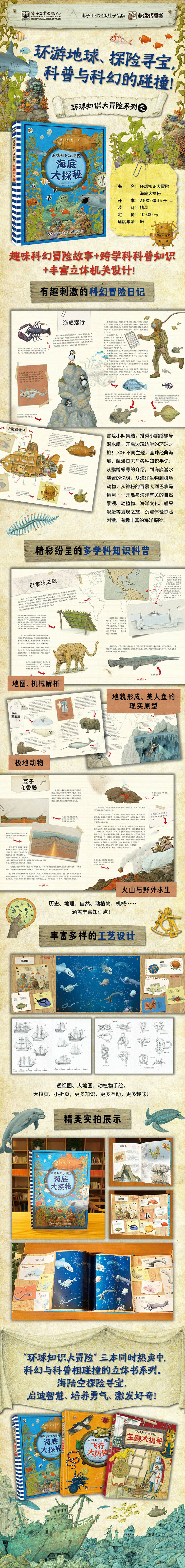 《环球知识大冒险:海底大探秘》是一套风靡欧洲各国的立体科普书《环球知识大冒险》中的一册。以扣人心弦的故事带领孩子环游世界,先后到全球典型海域里进行游走探险,从鹦鹉螺号的介绍,到海底潜水装置的说明,从海洋生物到极地动物,从神秘的百慕大到巴拿马运河……种种跟海洋探险相关的内容,都在书中得以体现。让孩子在书里寻宝的过程中深度感受当时的社会生活,了解自然、海洋、建筑和历史等趣味知识。内容丰富、新颖、有趣,满足孩子上天、入地、下海的探险寻宝梦想。 书里有丰富的设计工艺,小折页等,让阅读和探险巧妙融合,鼓励孩子动手体验书中内容!