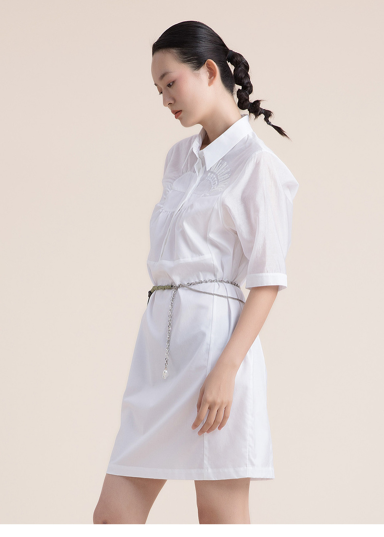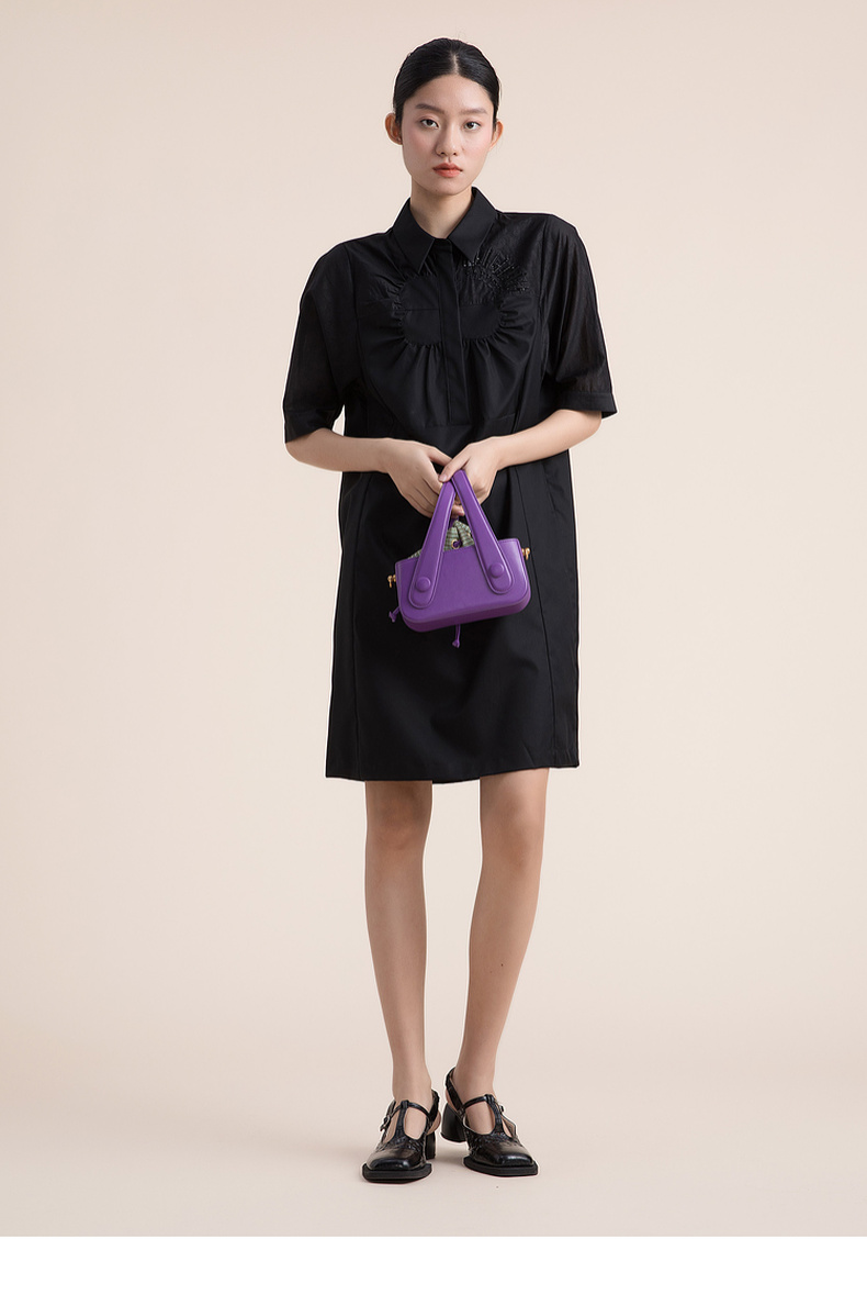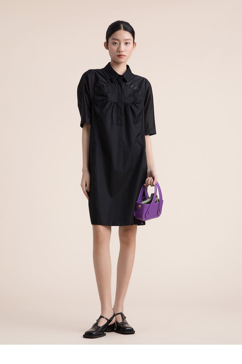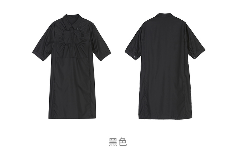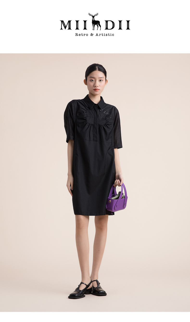 谜底短袖纯棉连衣裙2023夏款通勤H型显瘦珠片绣花中长裙235ML6050
