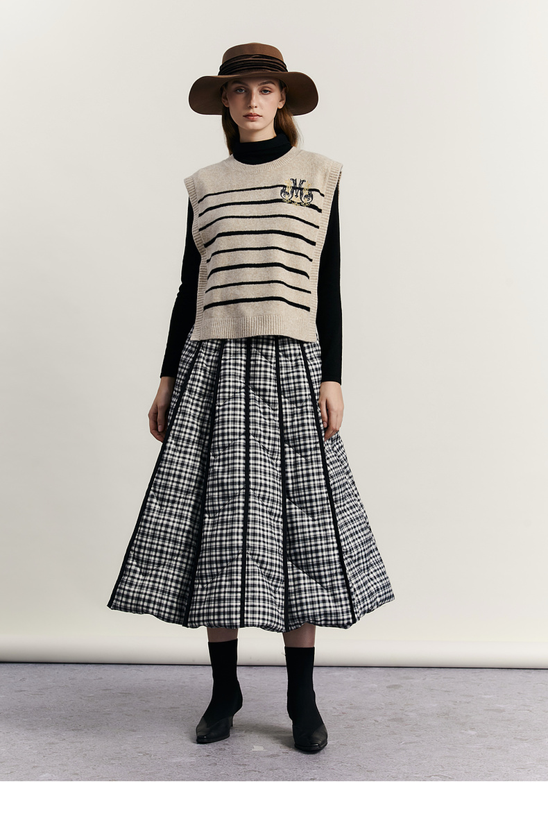 谜底毛织拼接羽绒马夹女2023冬新品学院风V领单排扣马甲234MY1470