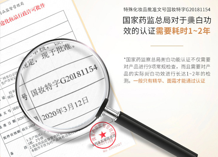 可不要小看这个特证,因为取得特证需要对产品进行 9 项常规检查,还要对产品的亮白成分进行长达 1~2 年的检测,从而来验证添加的成分是足量且十分安全的。