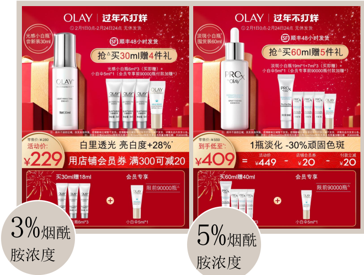 也就是豪华版才能达到5%浓度而他们这样一瓶火因酰胺精华,售价都要200多-1000多的