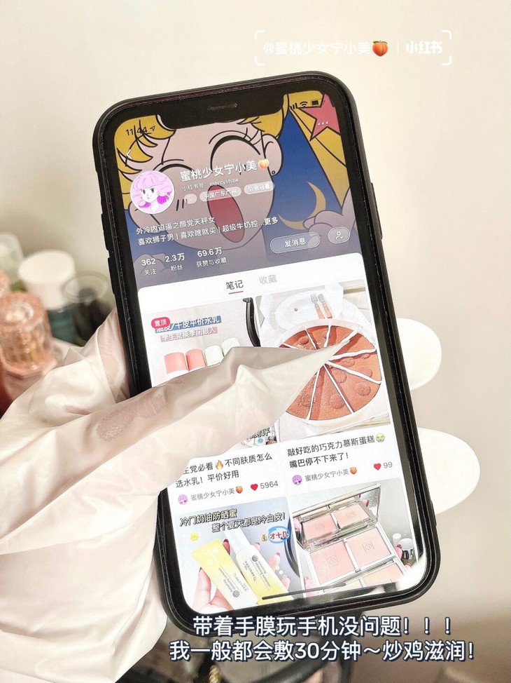 效果好是其一,方便也是很重要的,不能戴上手膜干等着。这点 Kevi 亮白手膜就做的很好,它是特制的外层,戴上可以随意刷手机。 ▼