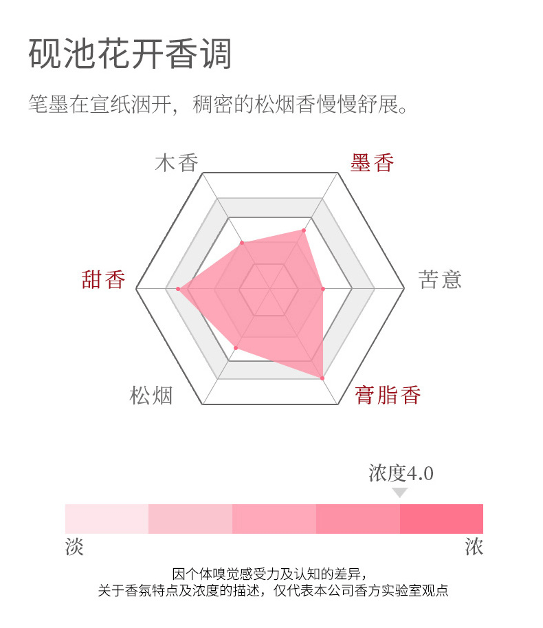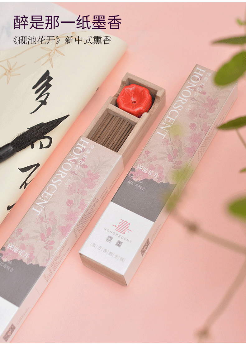 砚池花开,以膏脂香与松烟香复构出浓重的水墨气息,营造并贴合日常书法绘画情境中松烟黛墨的美好氛围。