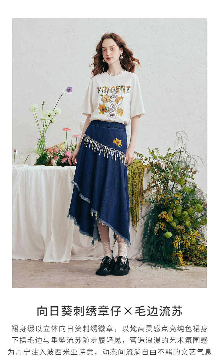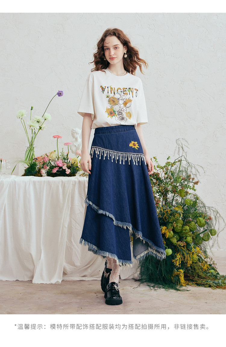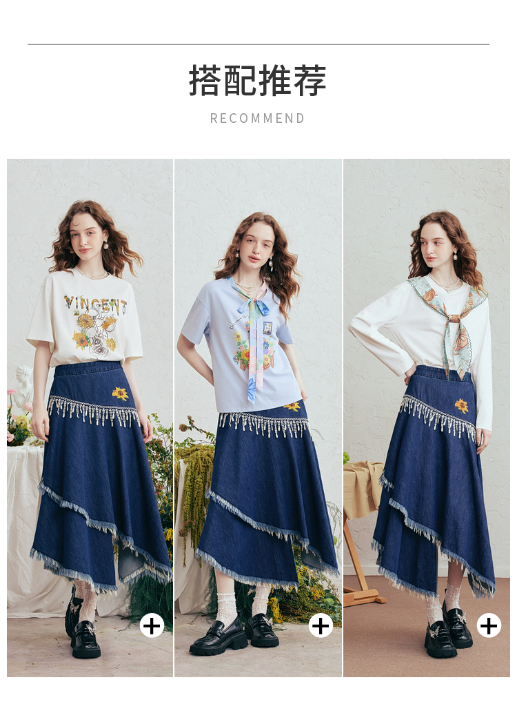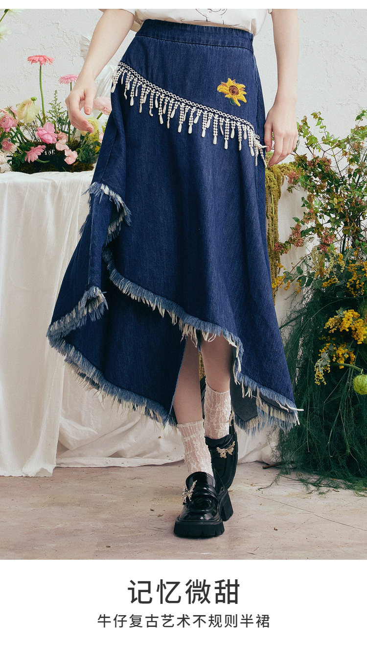 两三事梵高文艺记忆微甜2026春季新款绣花流苏装饰毛边牛仔半身裙