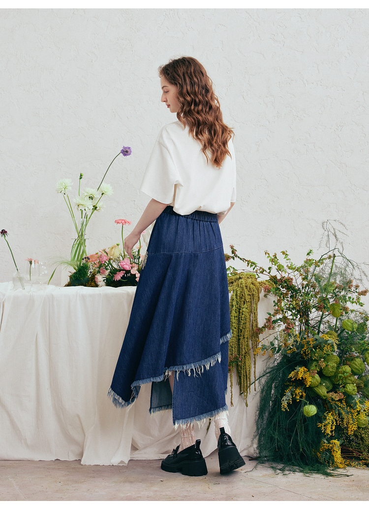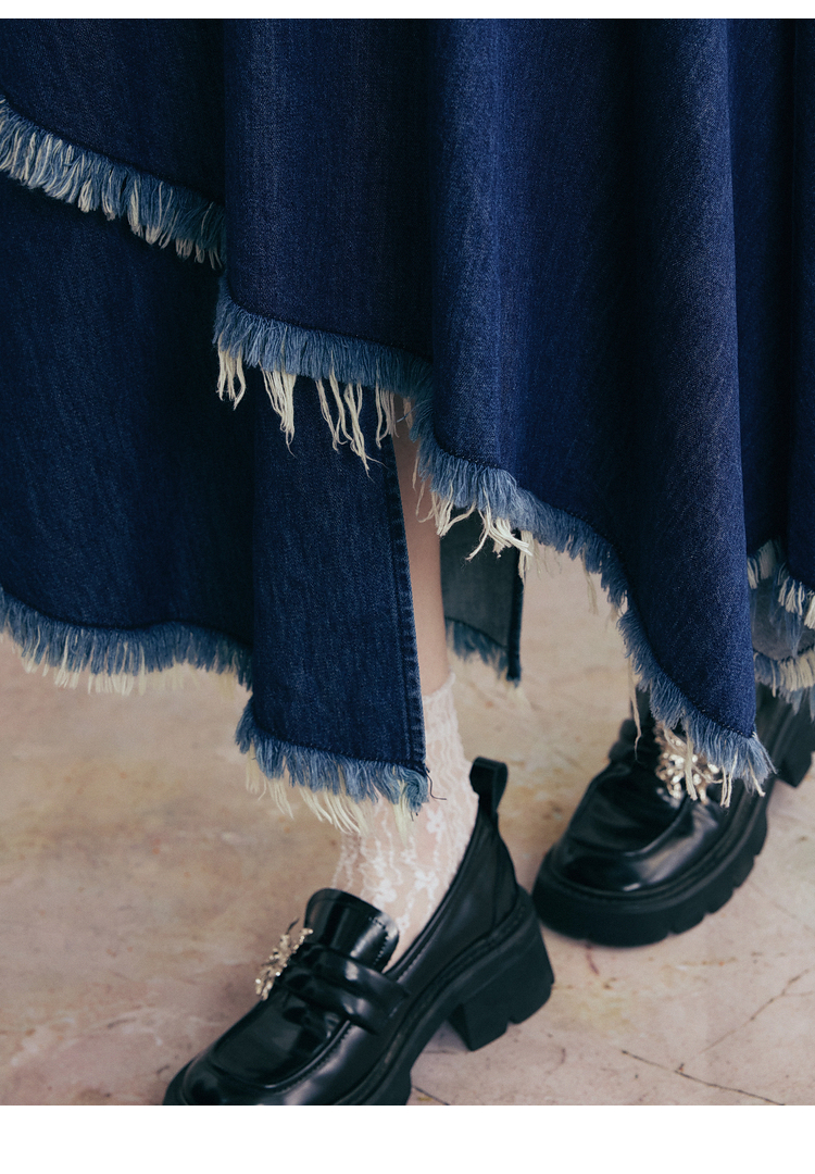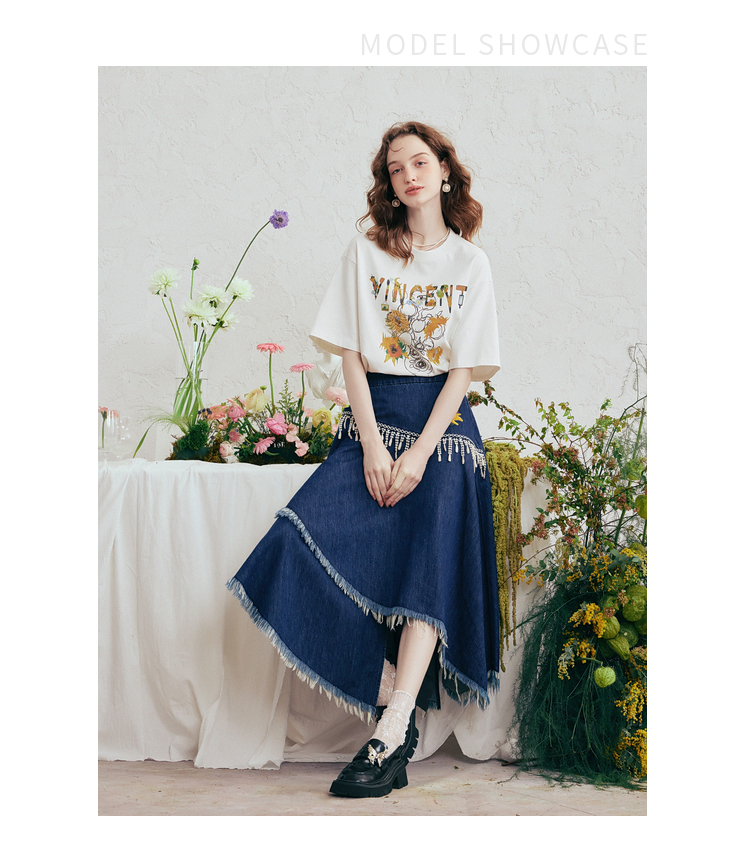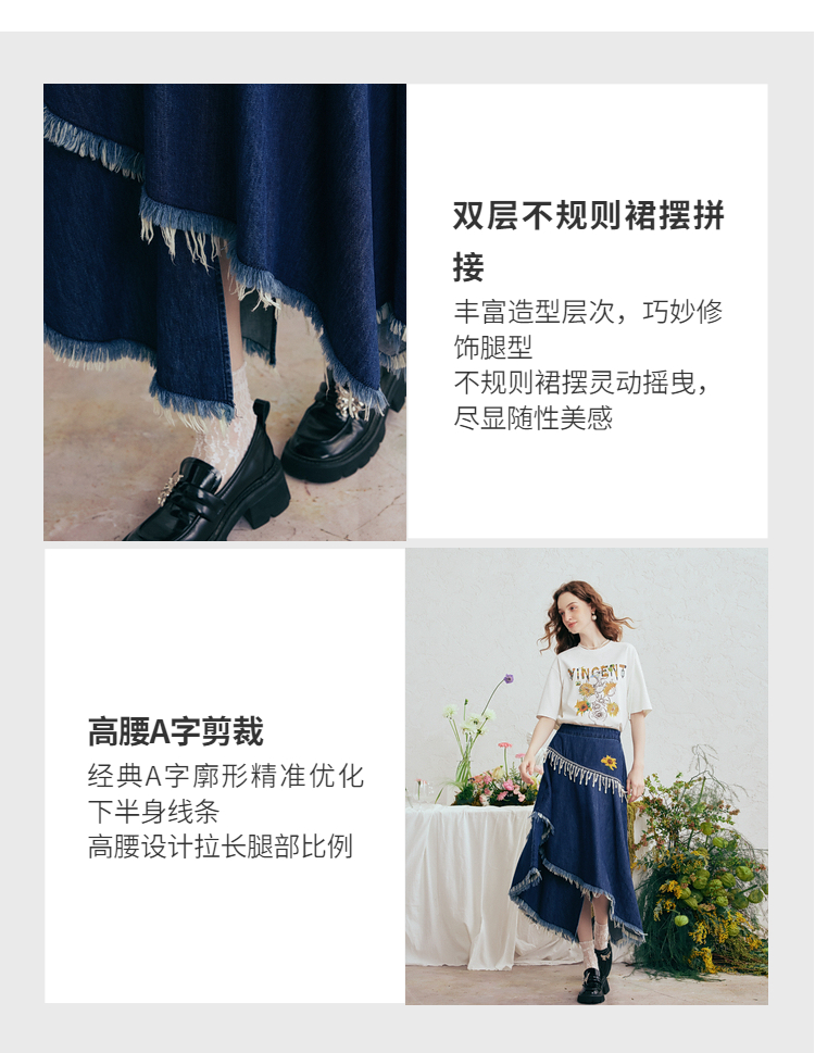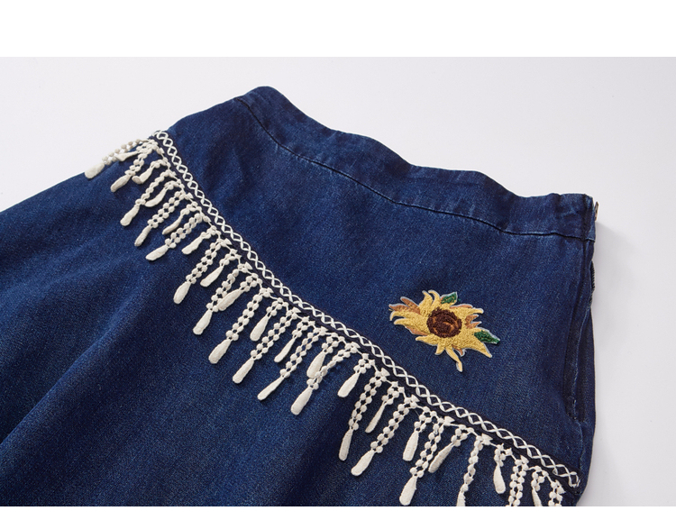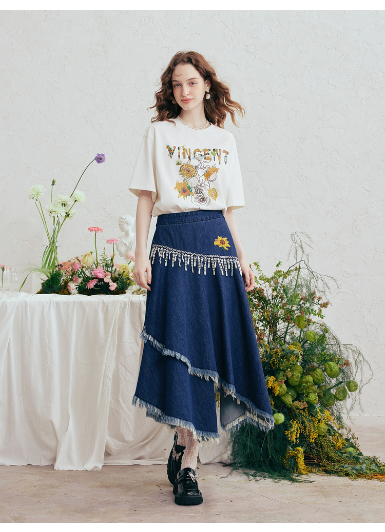两三事梵高文艺记忆微甜2026春季新款绣花流苏装饰毛边牛仔半身裙